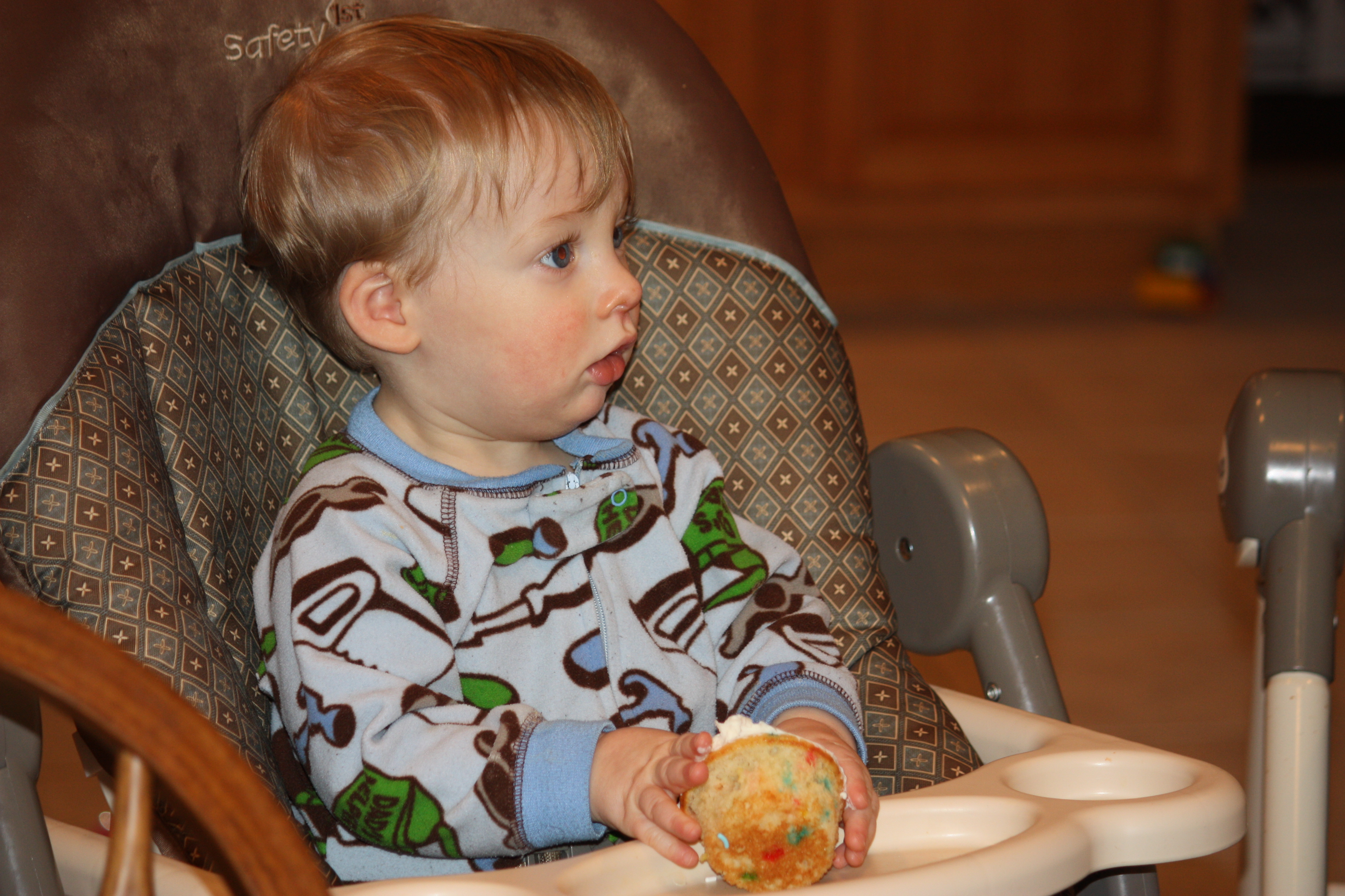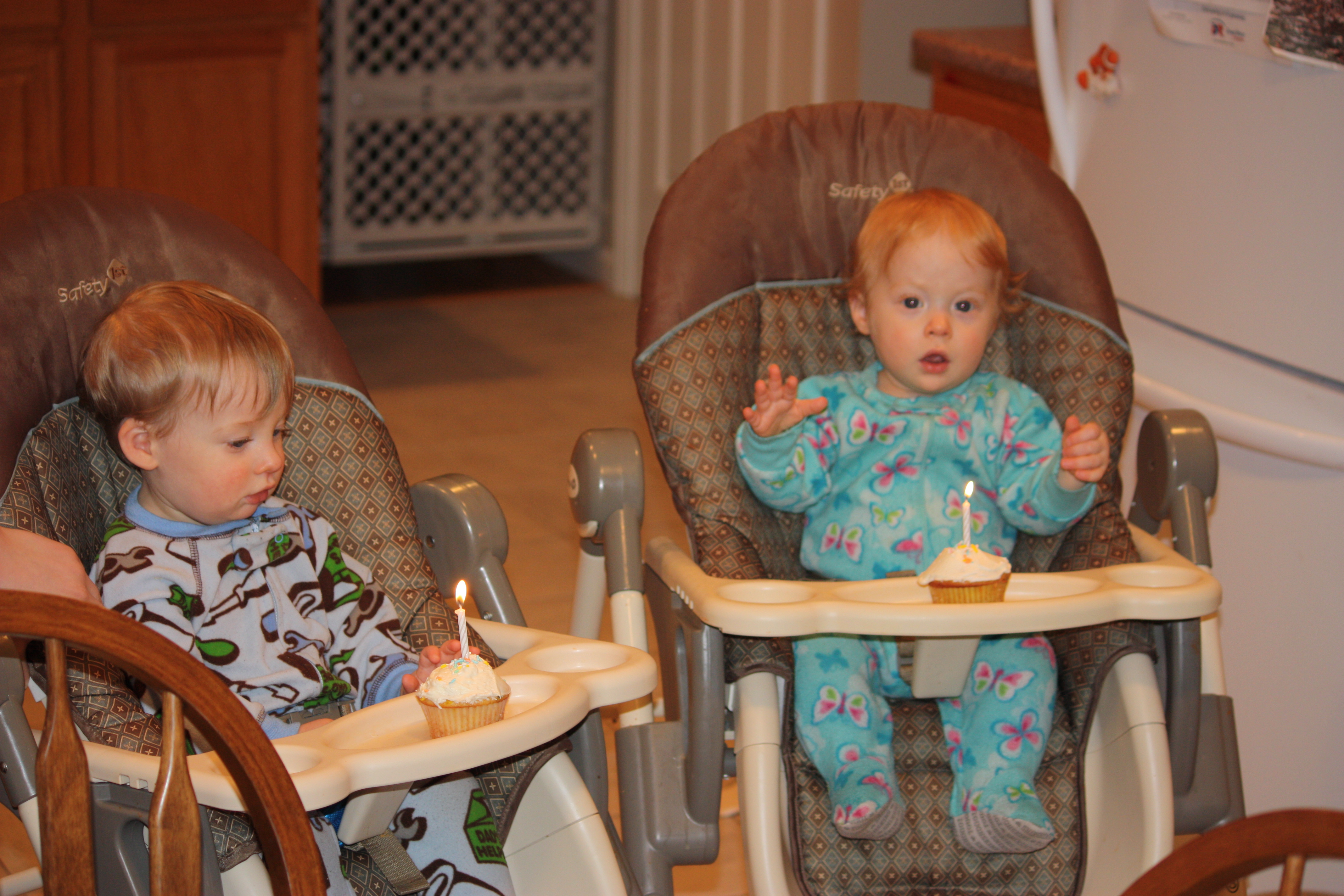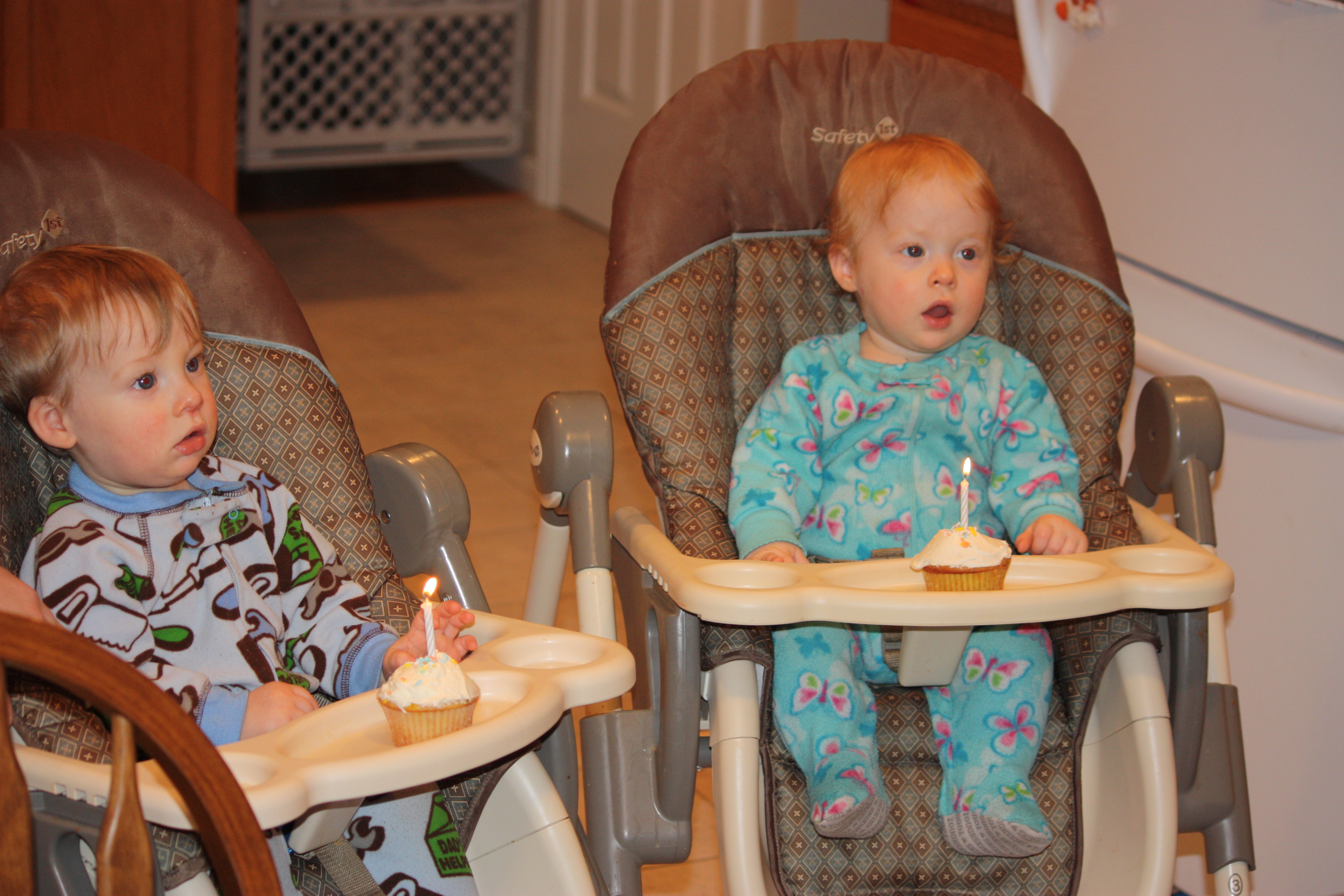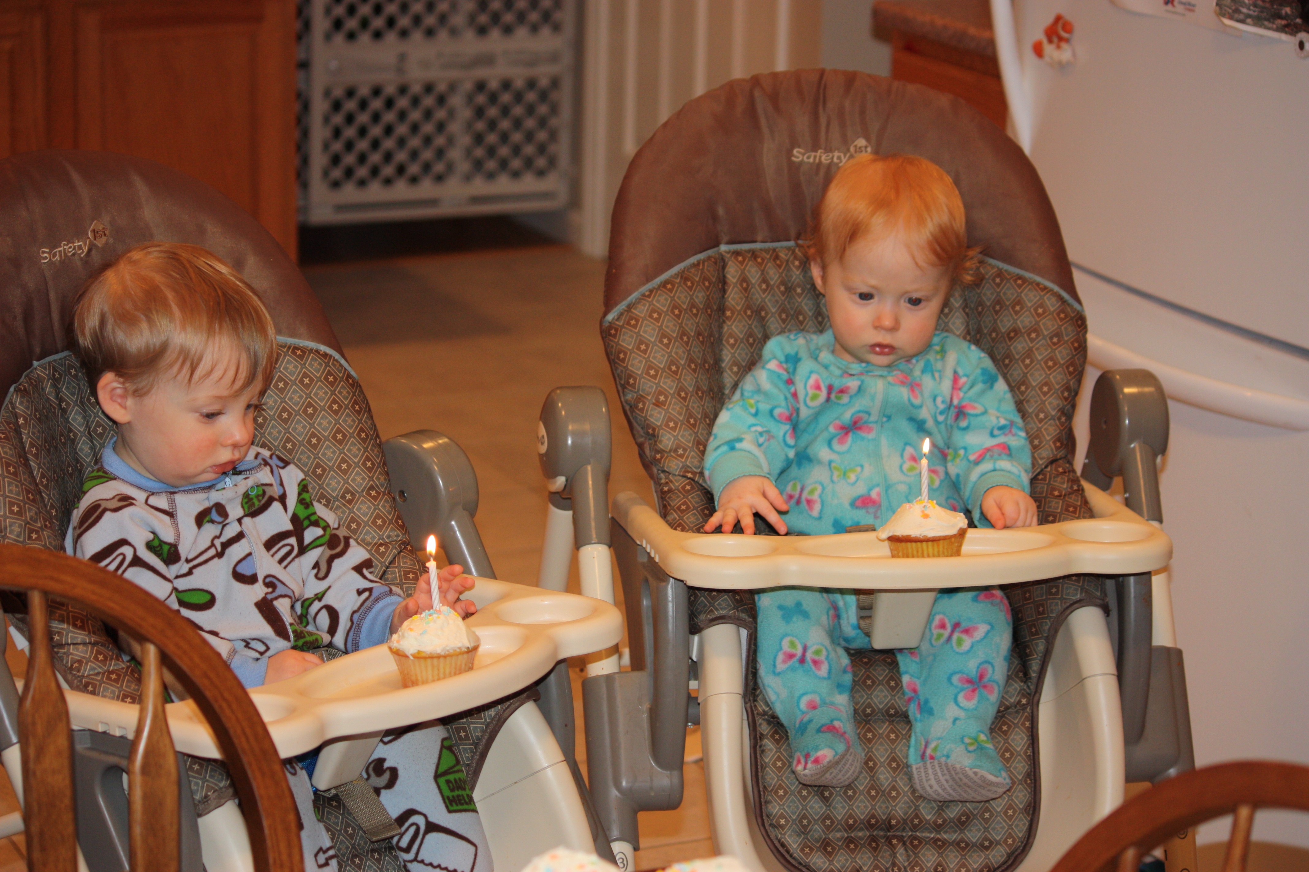 The twins are not overly impressed with the low key party and 1st birthday cupcakes