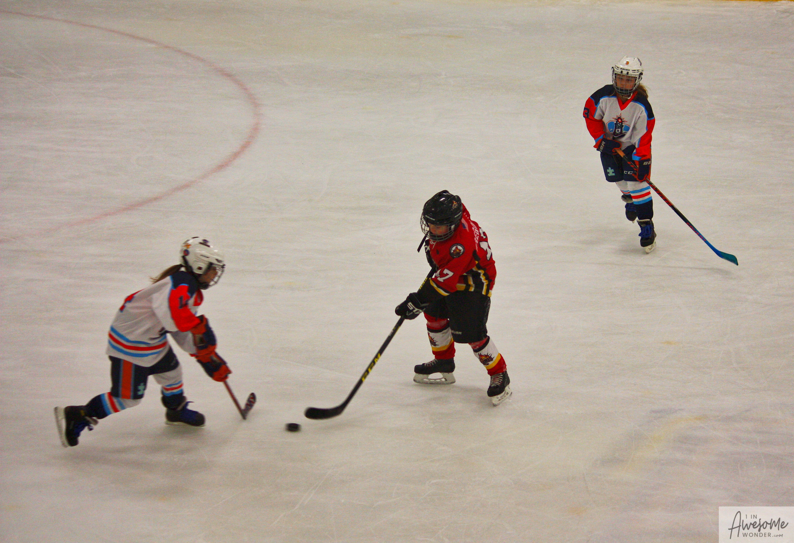 Finley starts the rush up ice while Garrett and one of the Islanders race each other, sprint style.