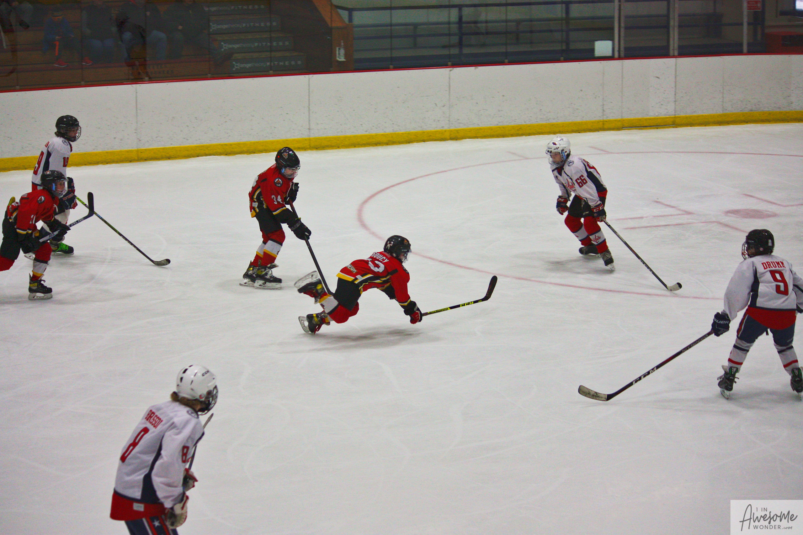 The Flames took a penalty early in the third period, and the Capitals cashed in quickly. When the home team won the offensive zone face-off back to one of the big boys, the Flames D parted like the Red Sea. This strategy left Will to fend for himself. Will got a glove on the shot, but the puck found the net, and the Capitals led again, 4-3. Shortly after this goal, the Flames answered with a goal of their own. The Flames had swarmed the offensive end for a moment when Cam Desruisseaux tipped a shot from Caleb Powers into the net to tie the game at, 4-4. Two shifts later, Finley Dunn took a carom off of Garrett Warren from her own defensive end and rushed the length of the ice with the puck. She flipped a backhand shot at the net which skipped off of the goalie’s pads and came back to Dunn who had circled toward the net. Dunn took her own rebound and slipped the puck into the net, giving the Flames a 5-4 lead in the game.