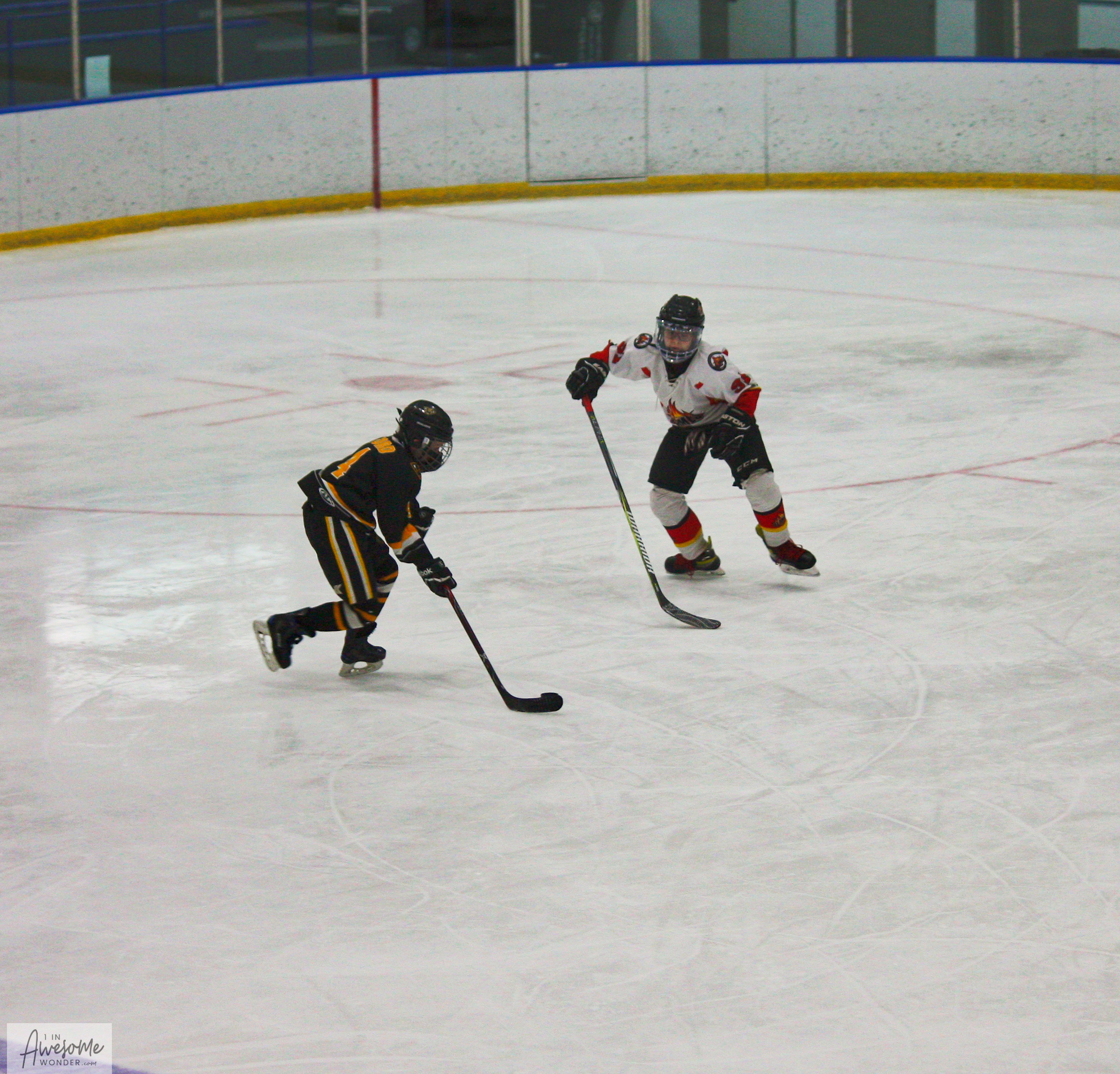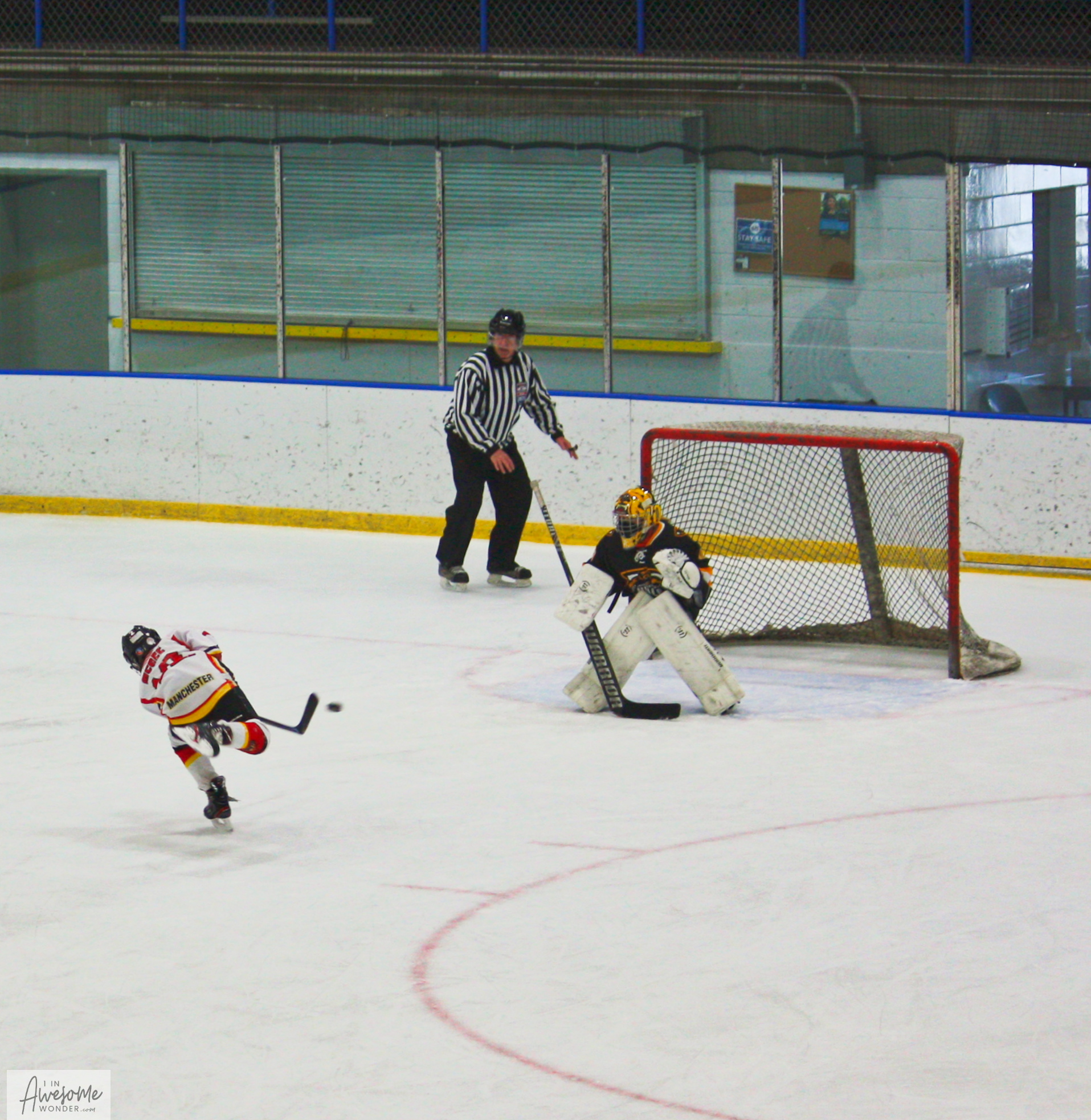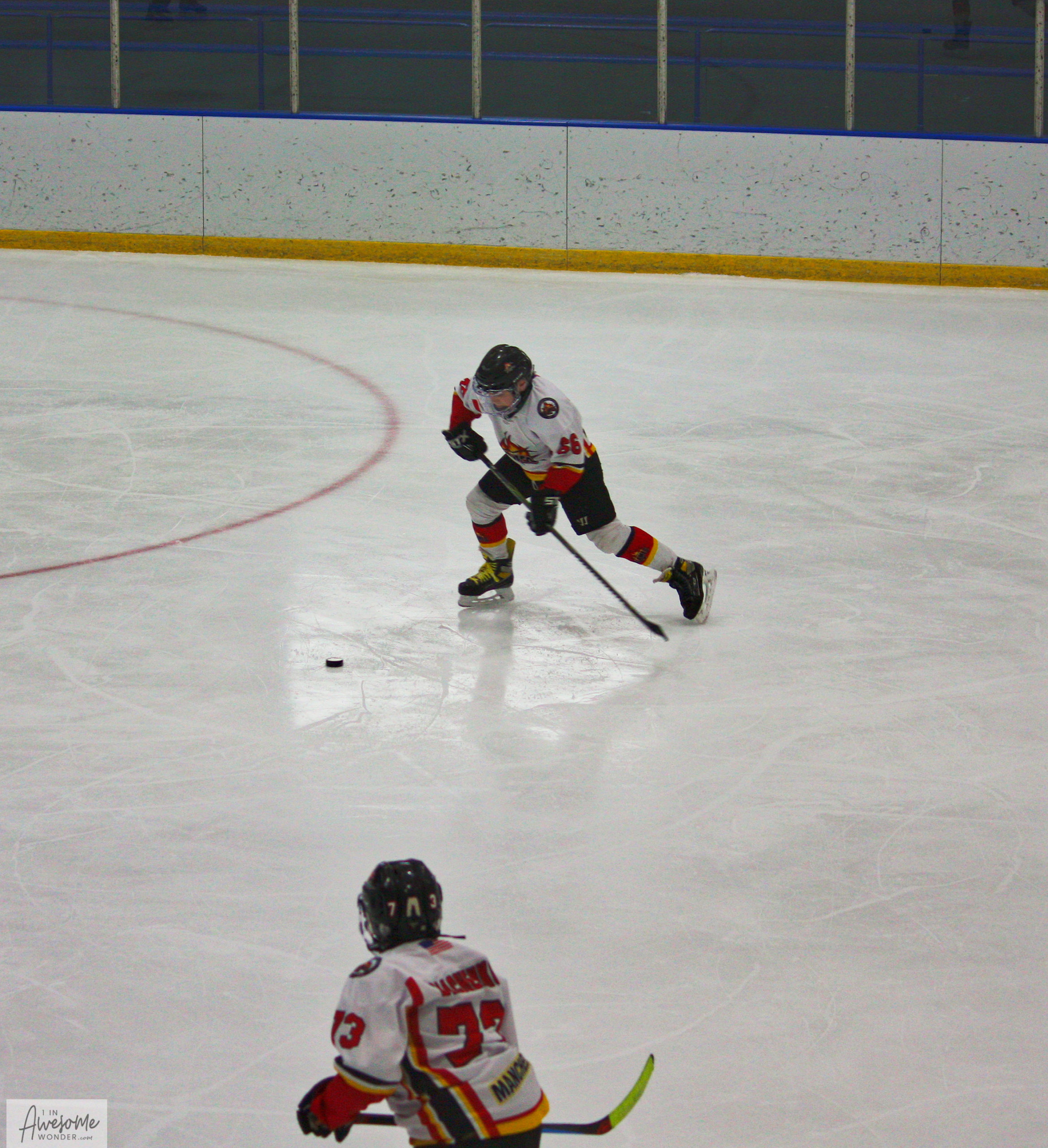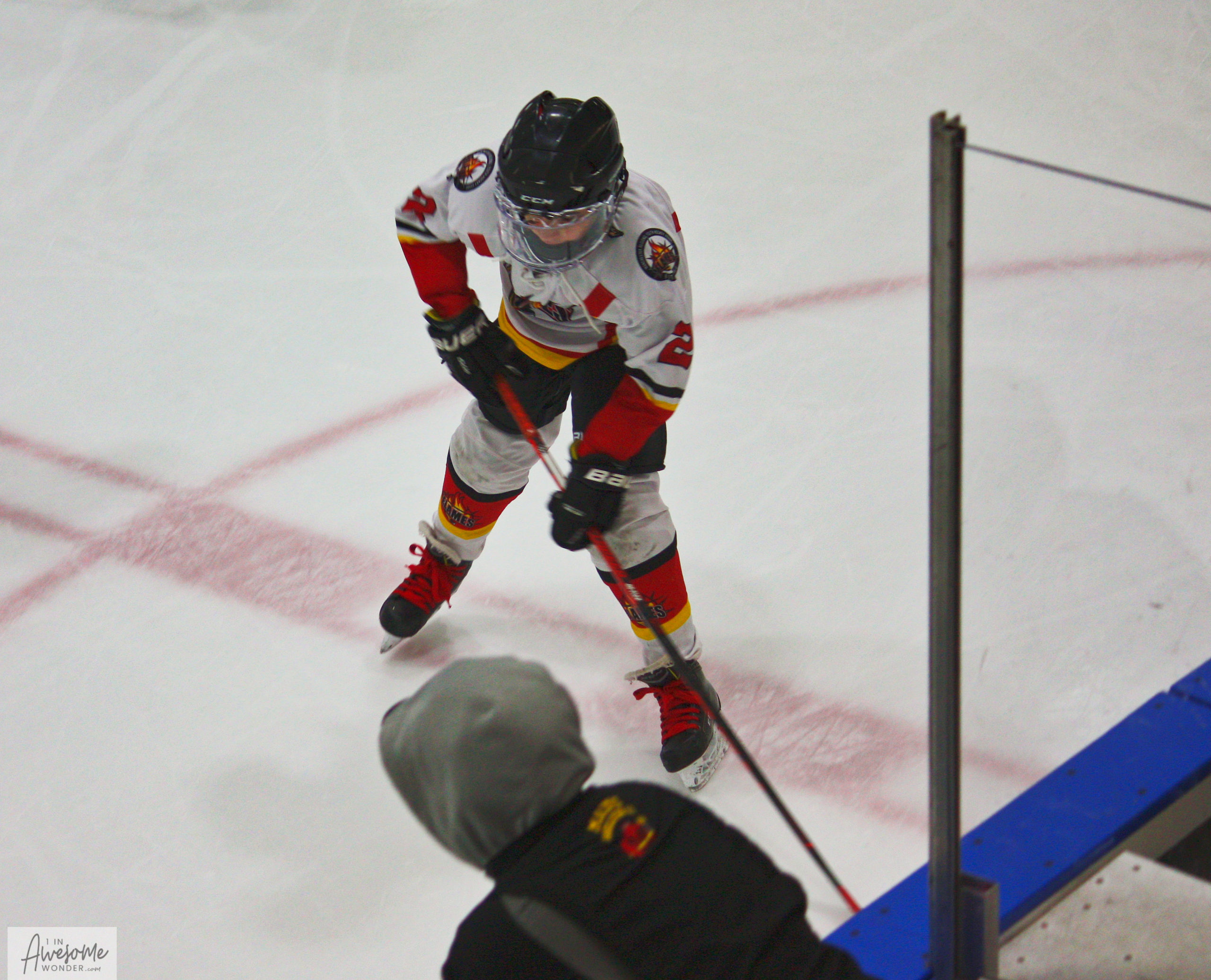 Ian carries the puck up the boards and narrowly avoids the opposing coach.