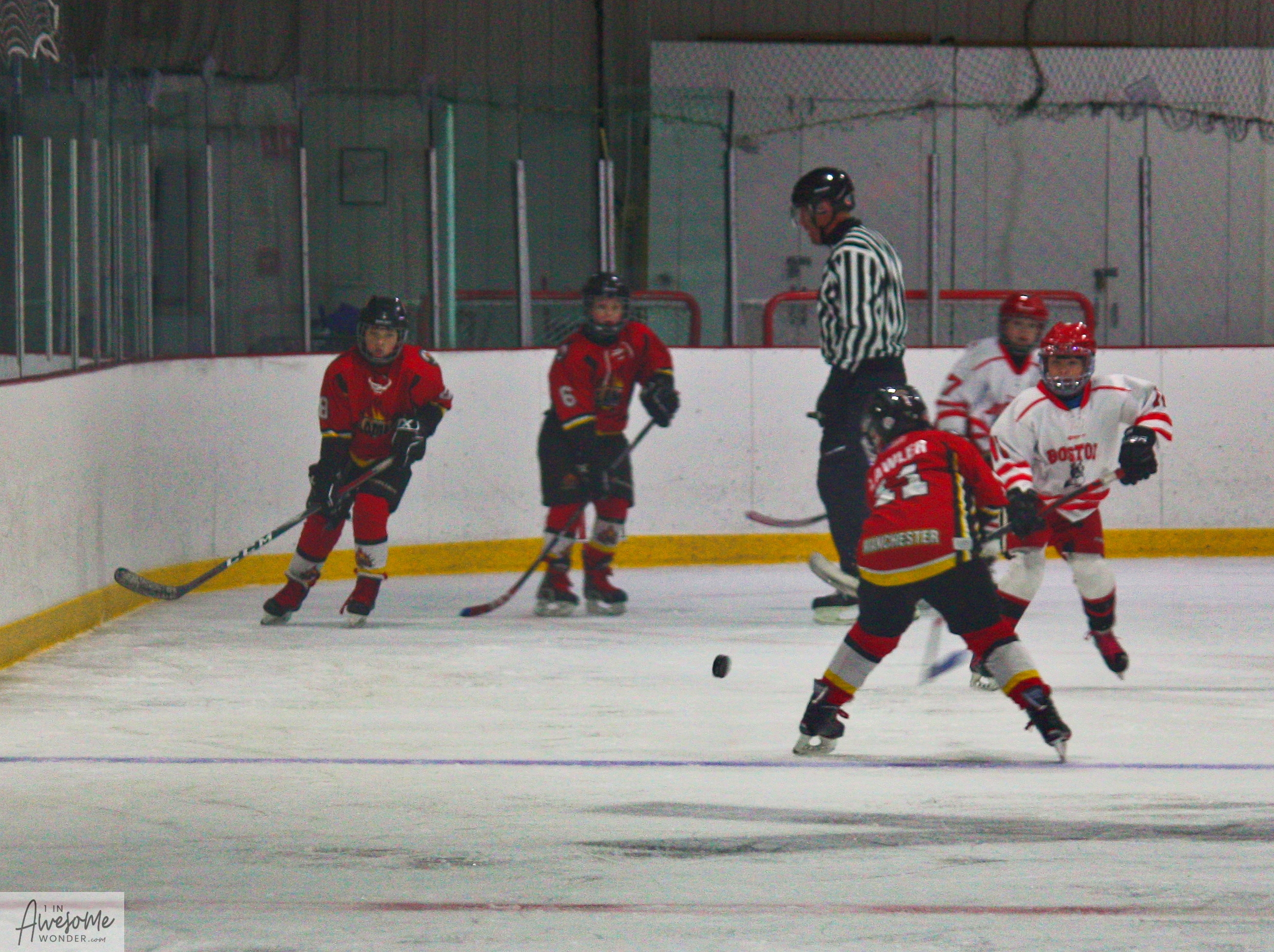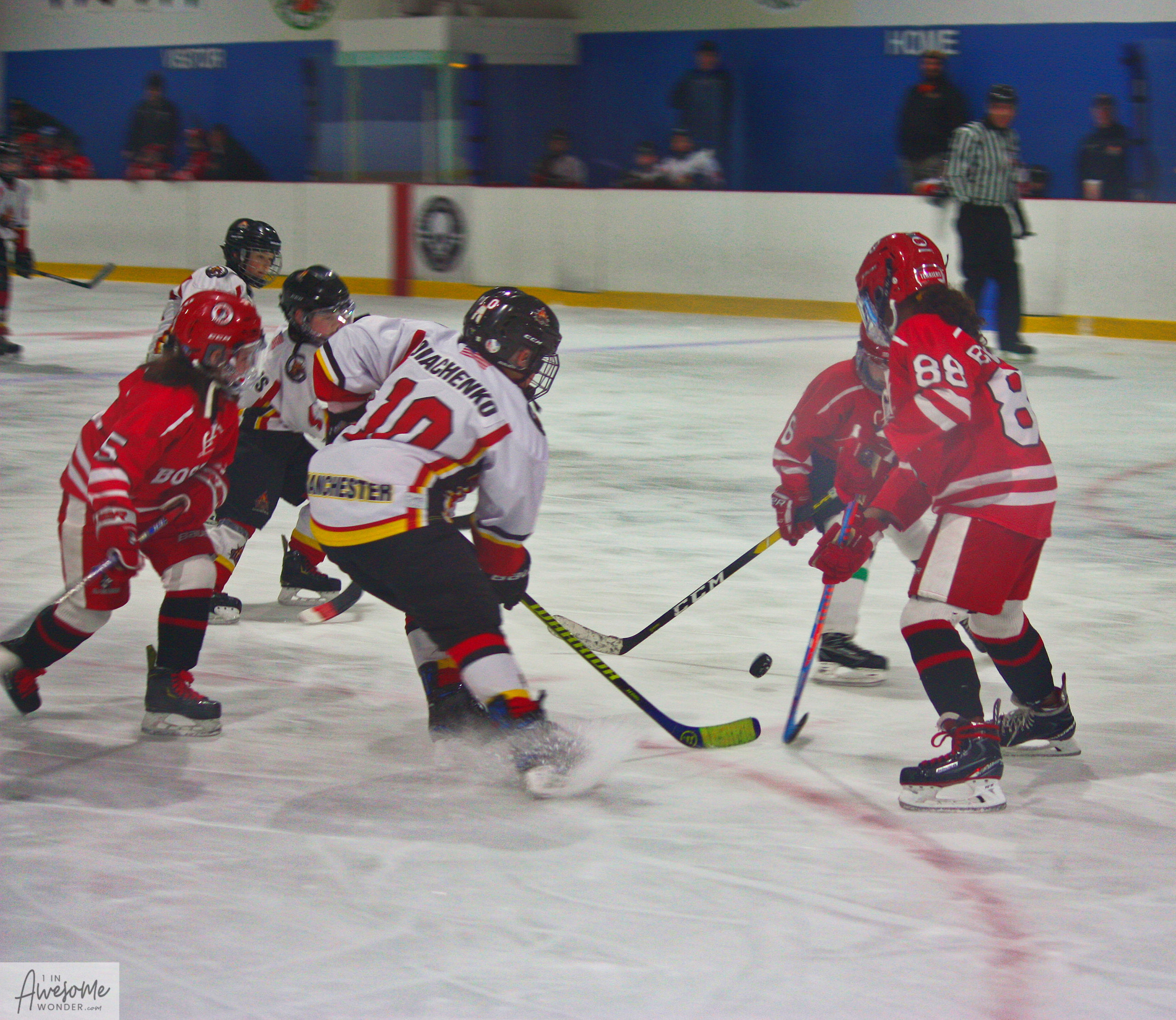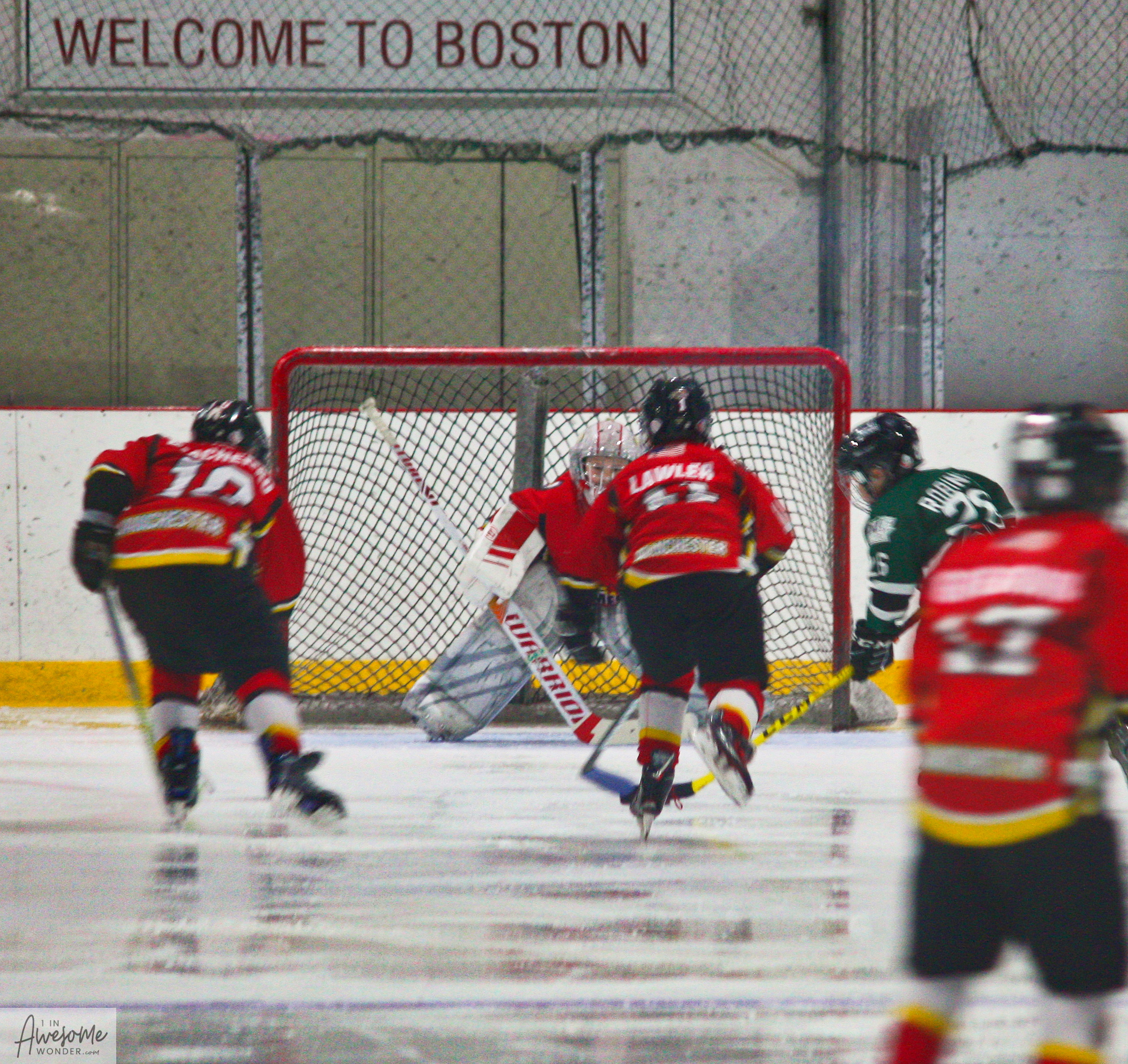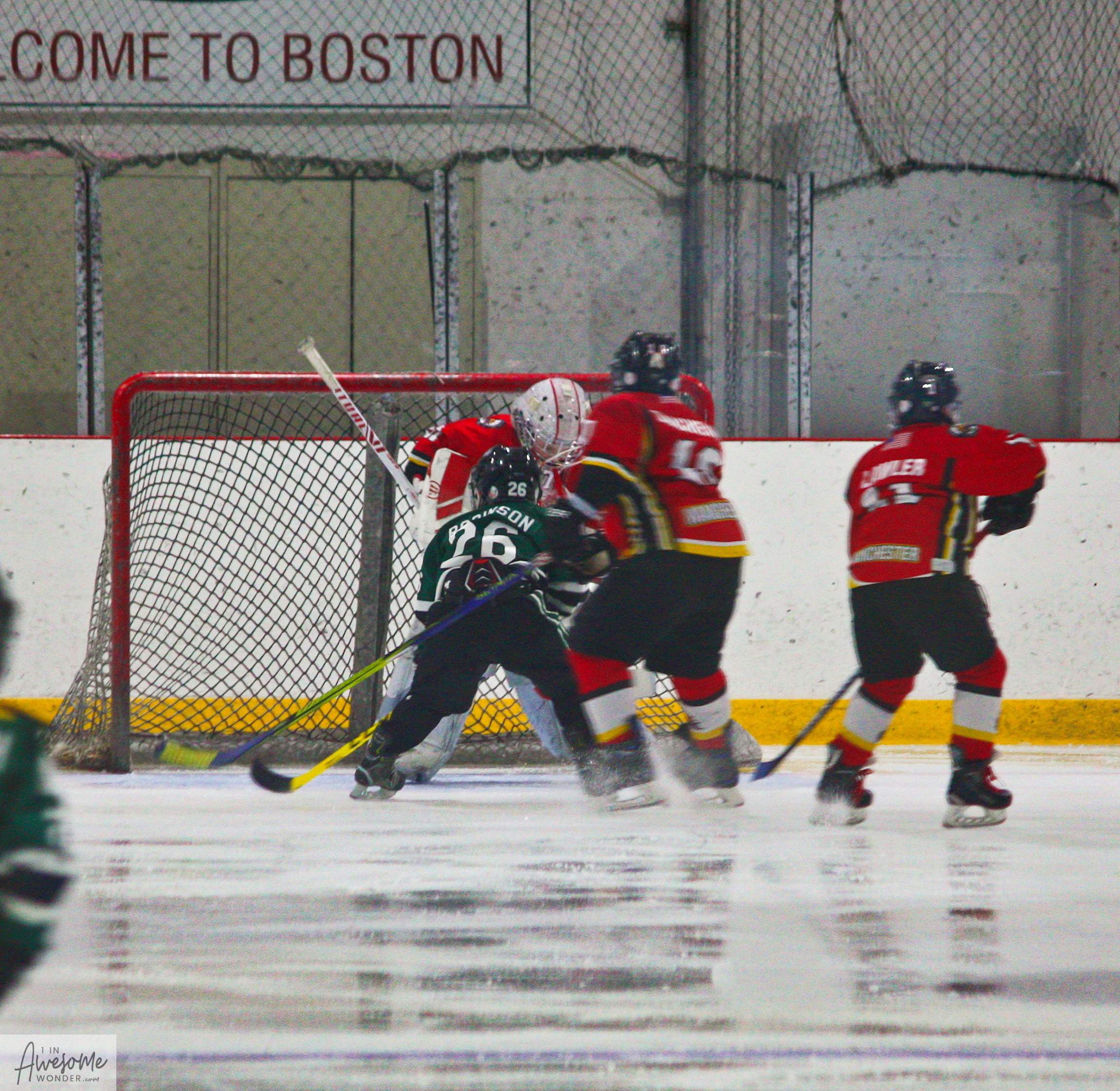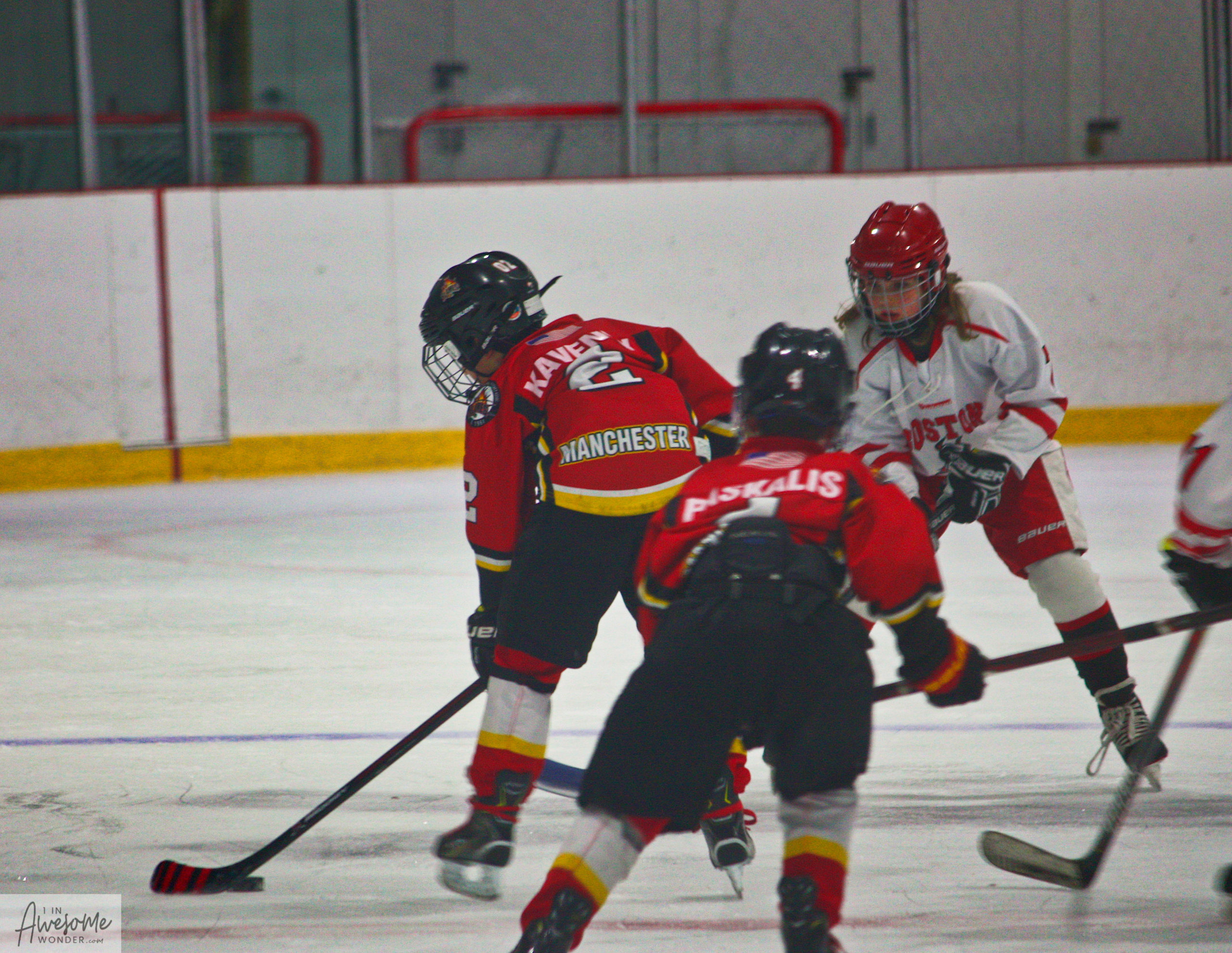 Travis is ready for hockey despite the Terriers yelling, “Red Rover, Red Rover, send Logan right over.”