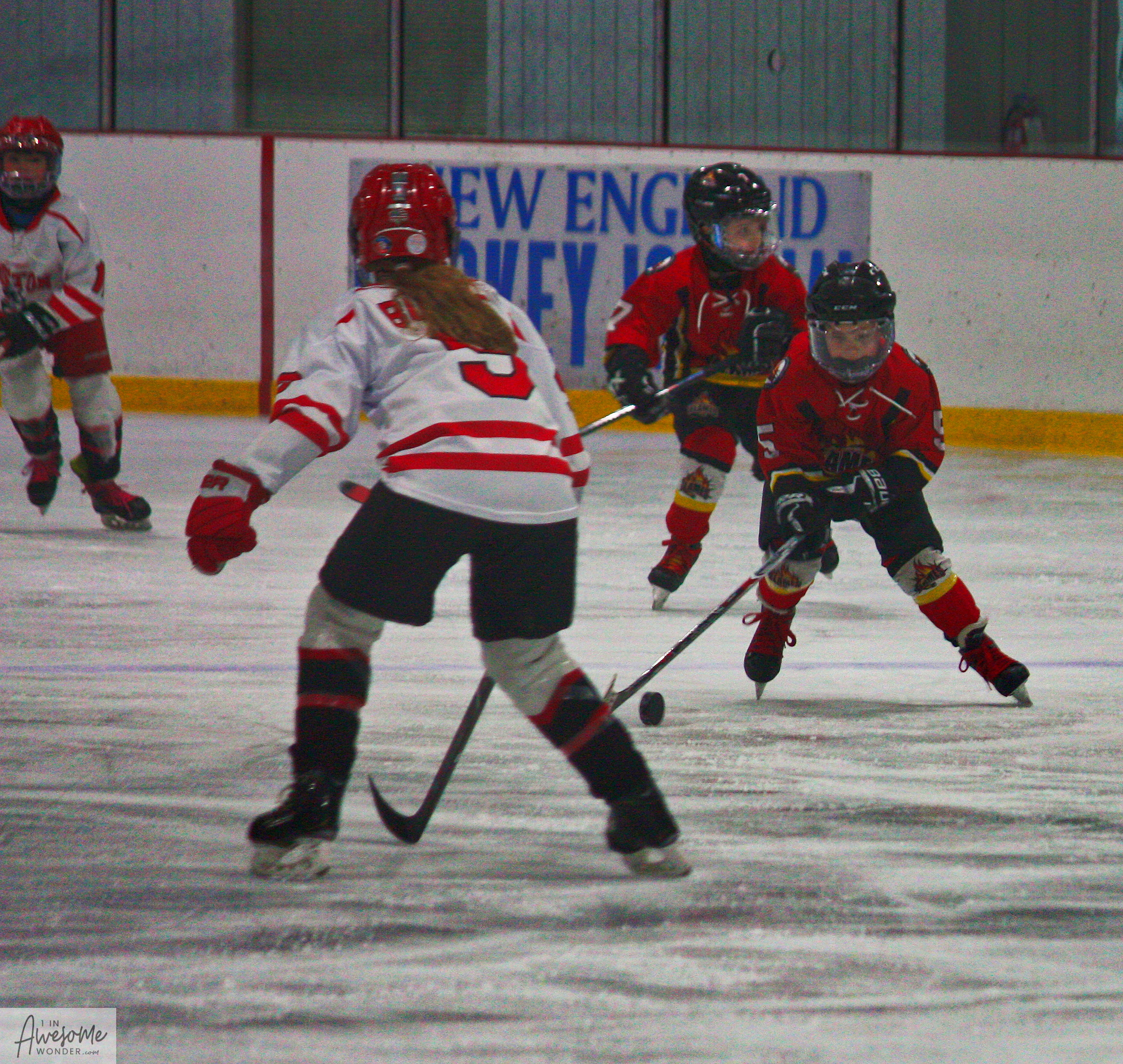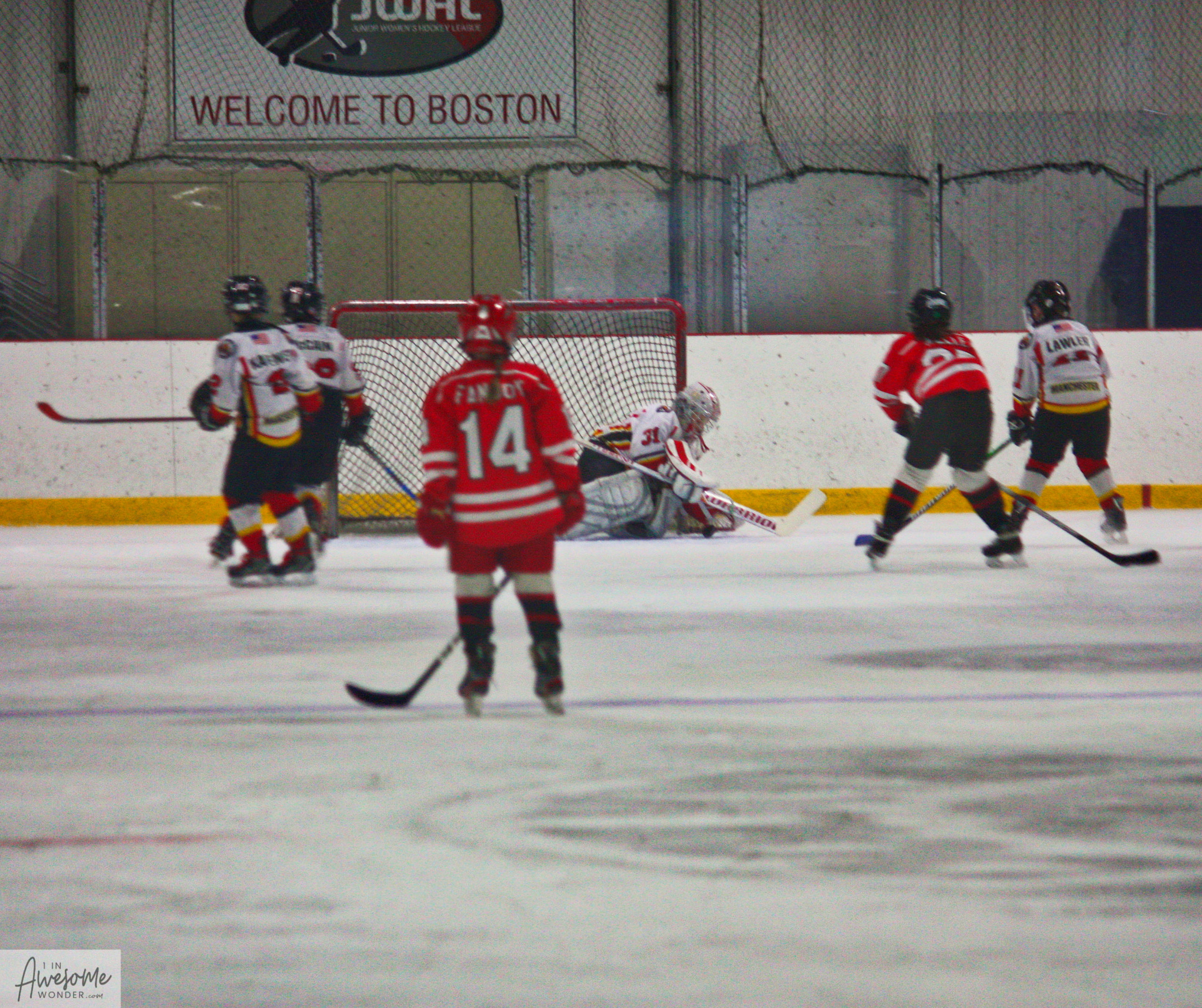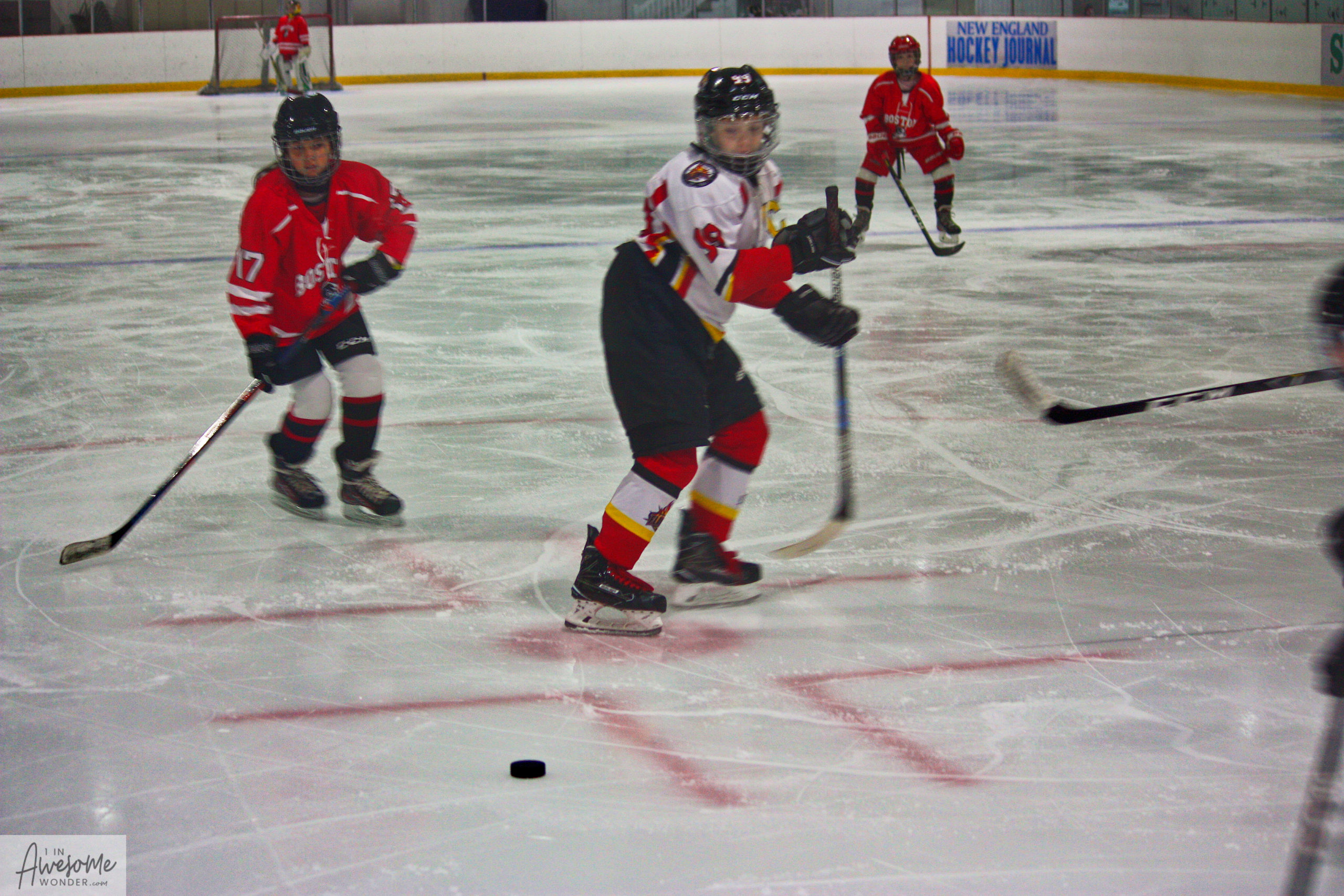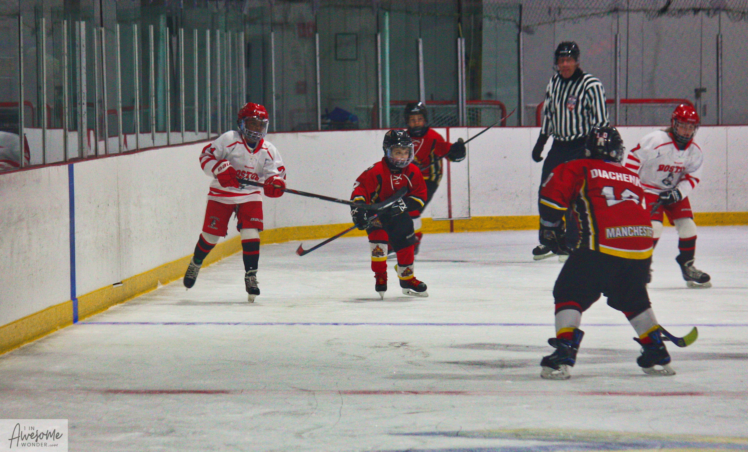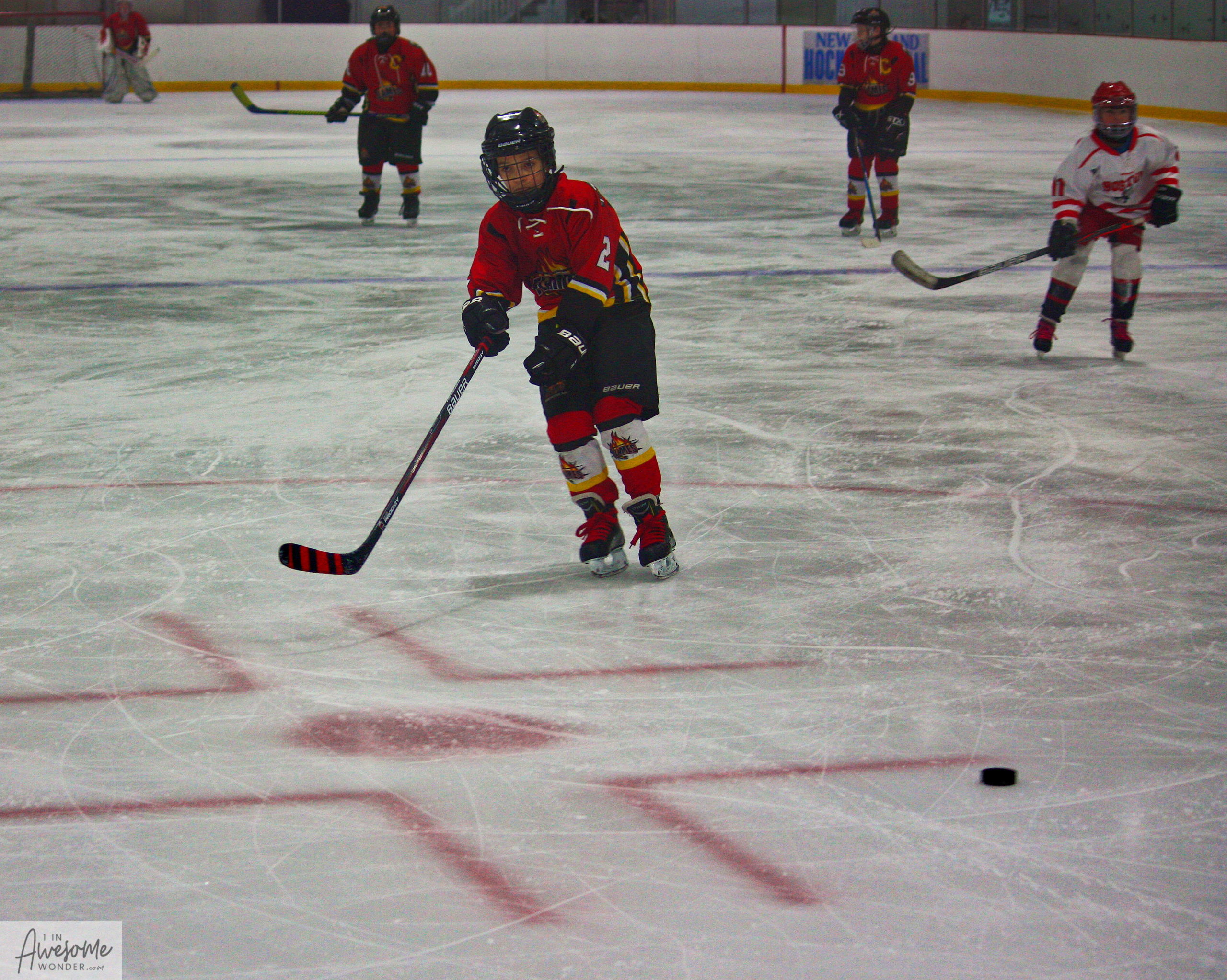 Travis is ready for hockey despite the Terriers yelling, “Red Rover, Red Rover, send Logan right over.”