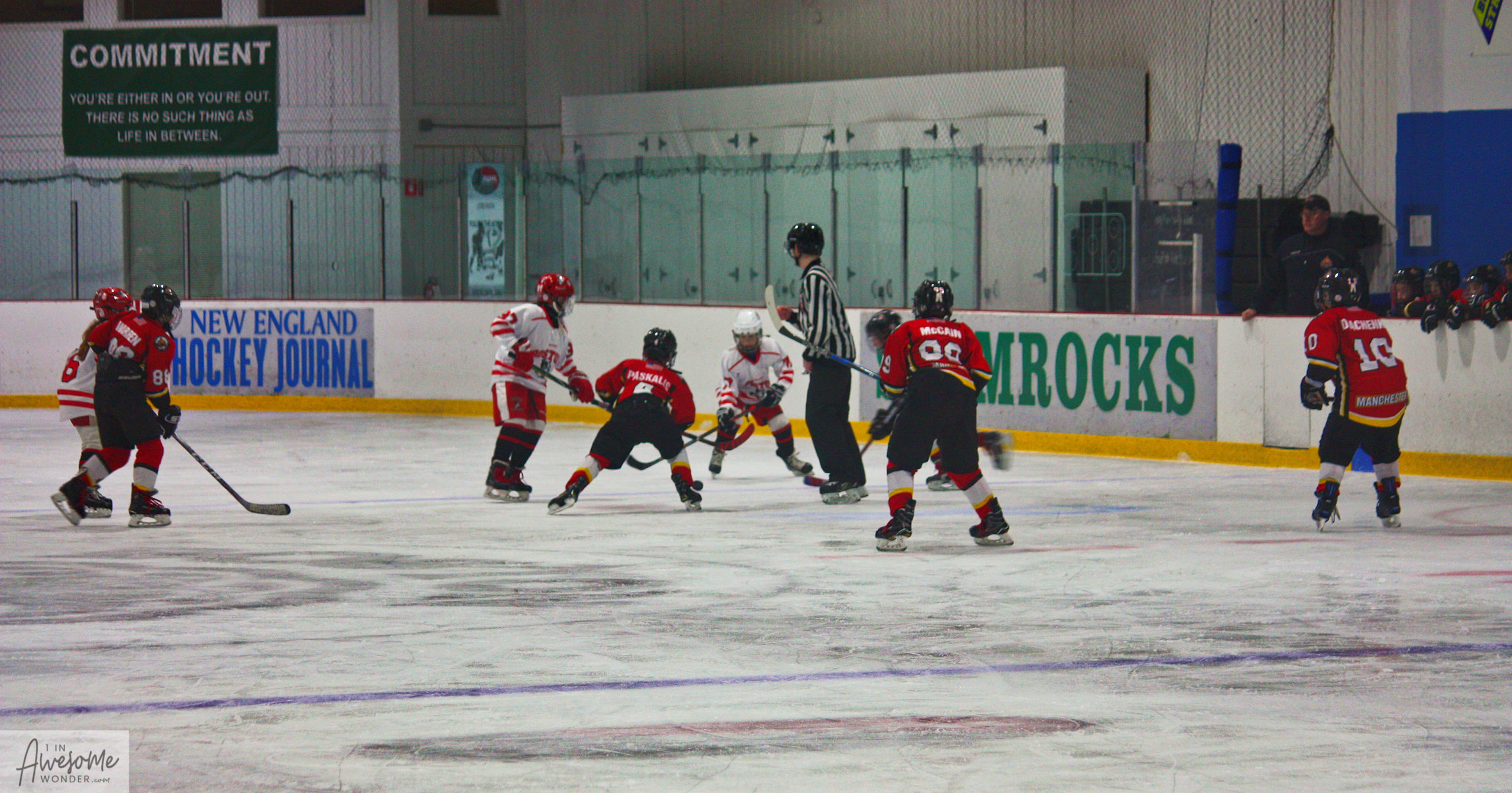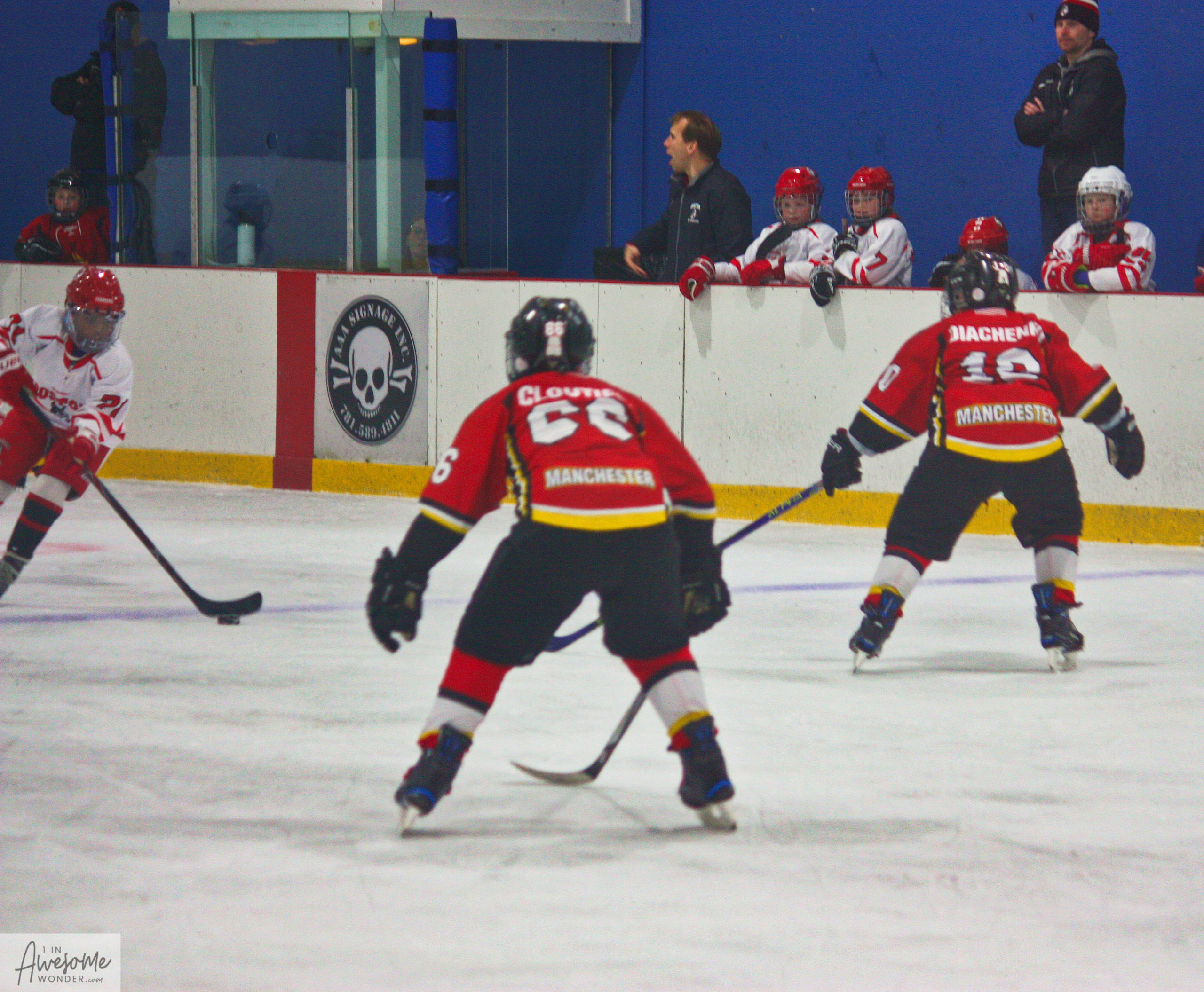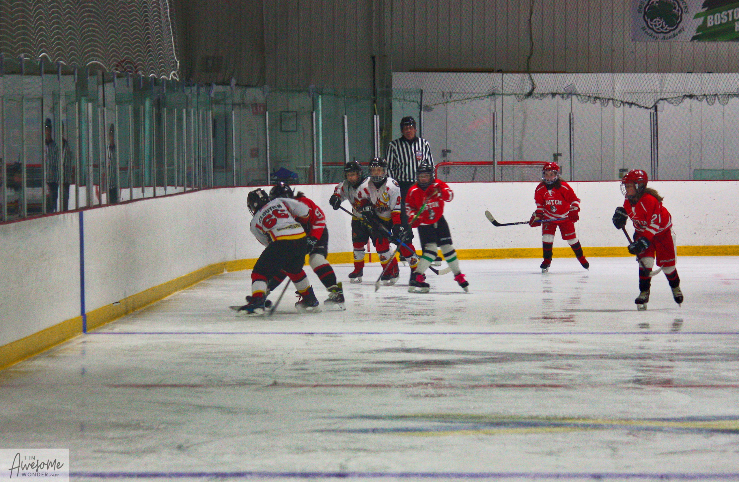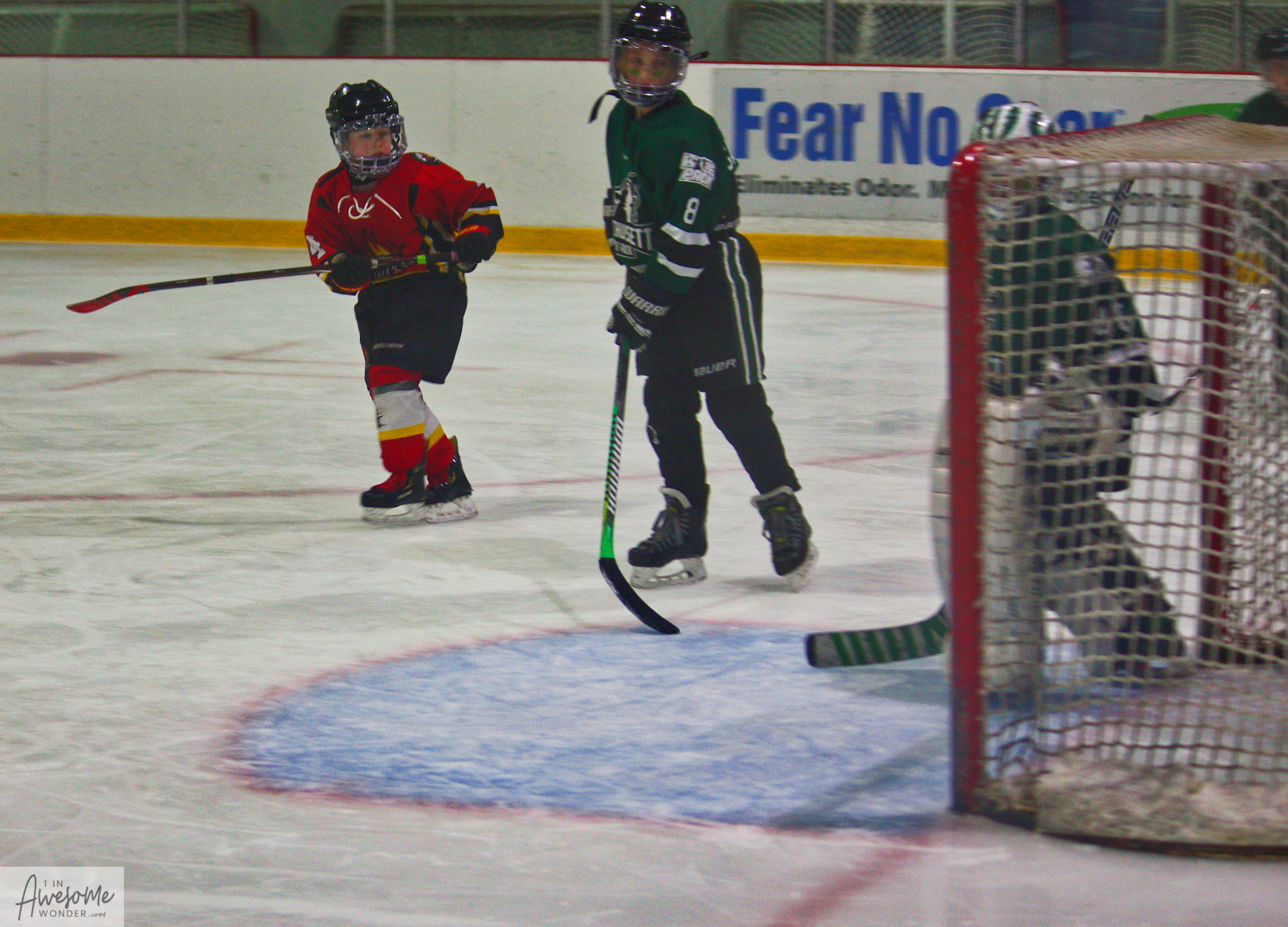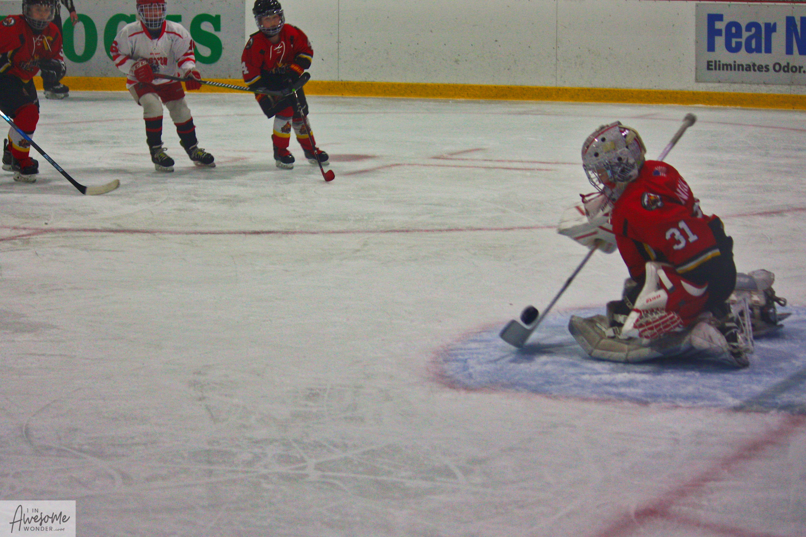 Travis is ready for hockey despite the Terriers yelling, “Red Rover, Red Rover, send Logan right over.”