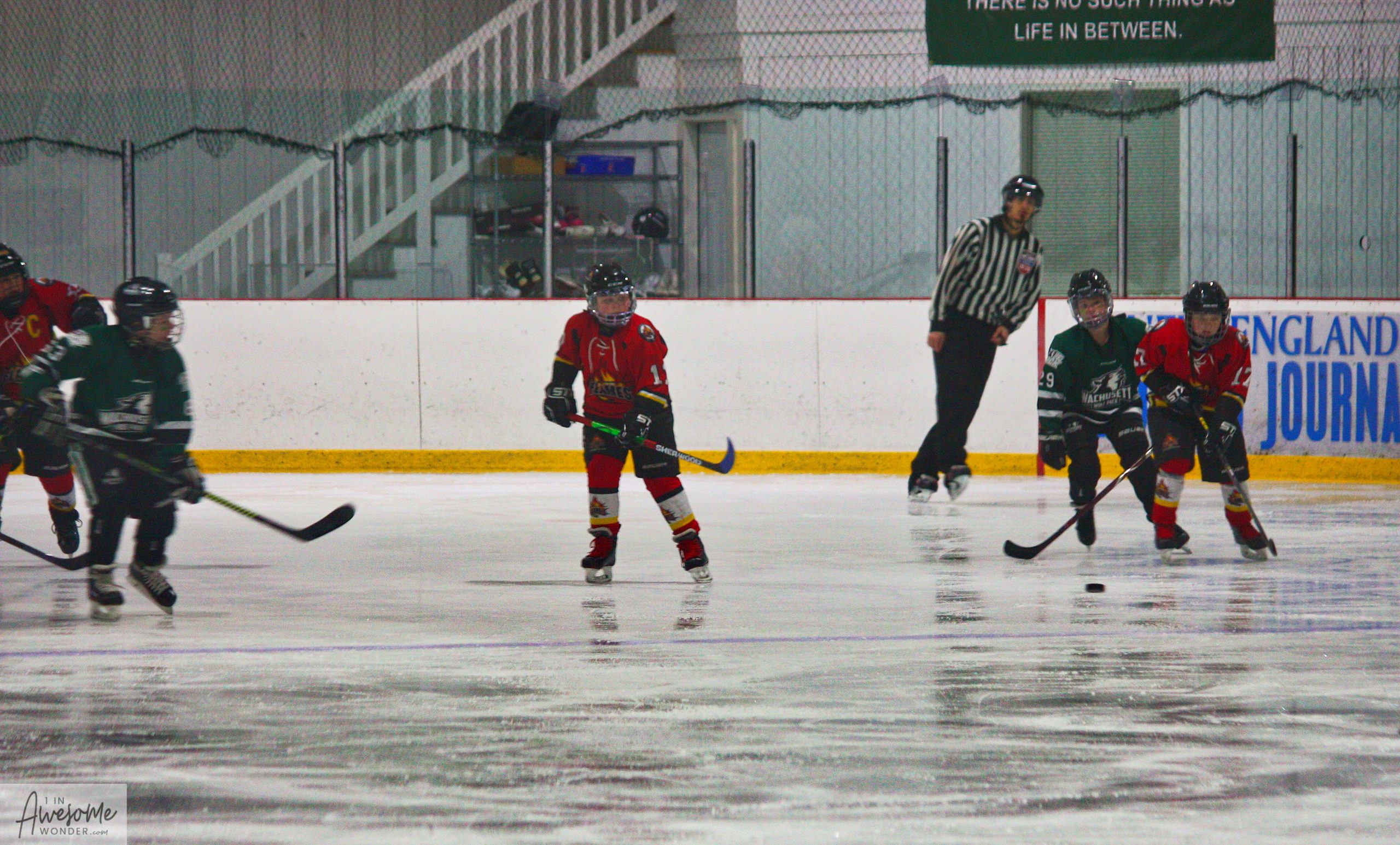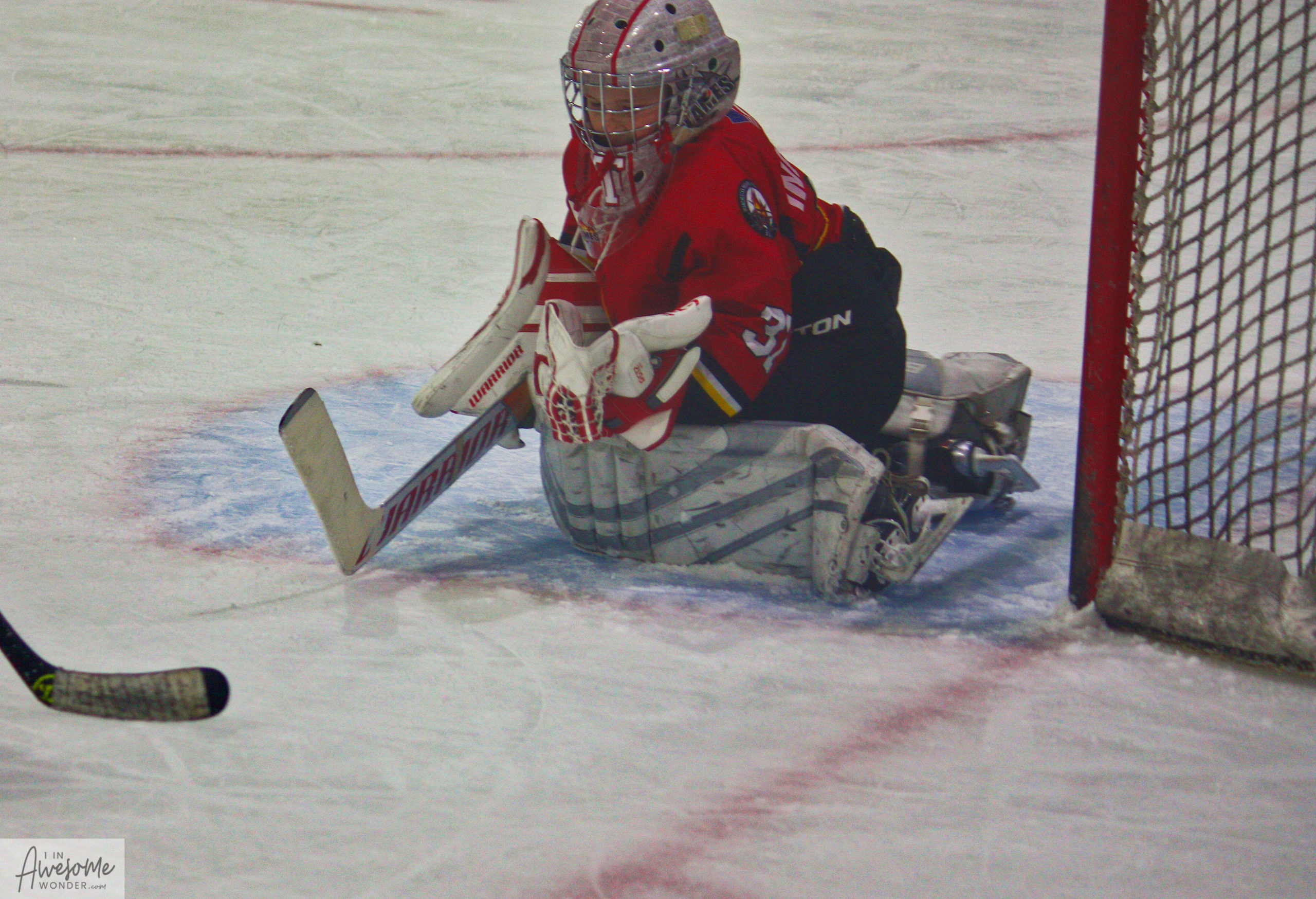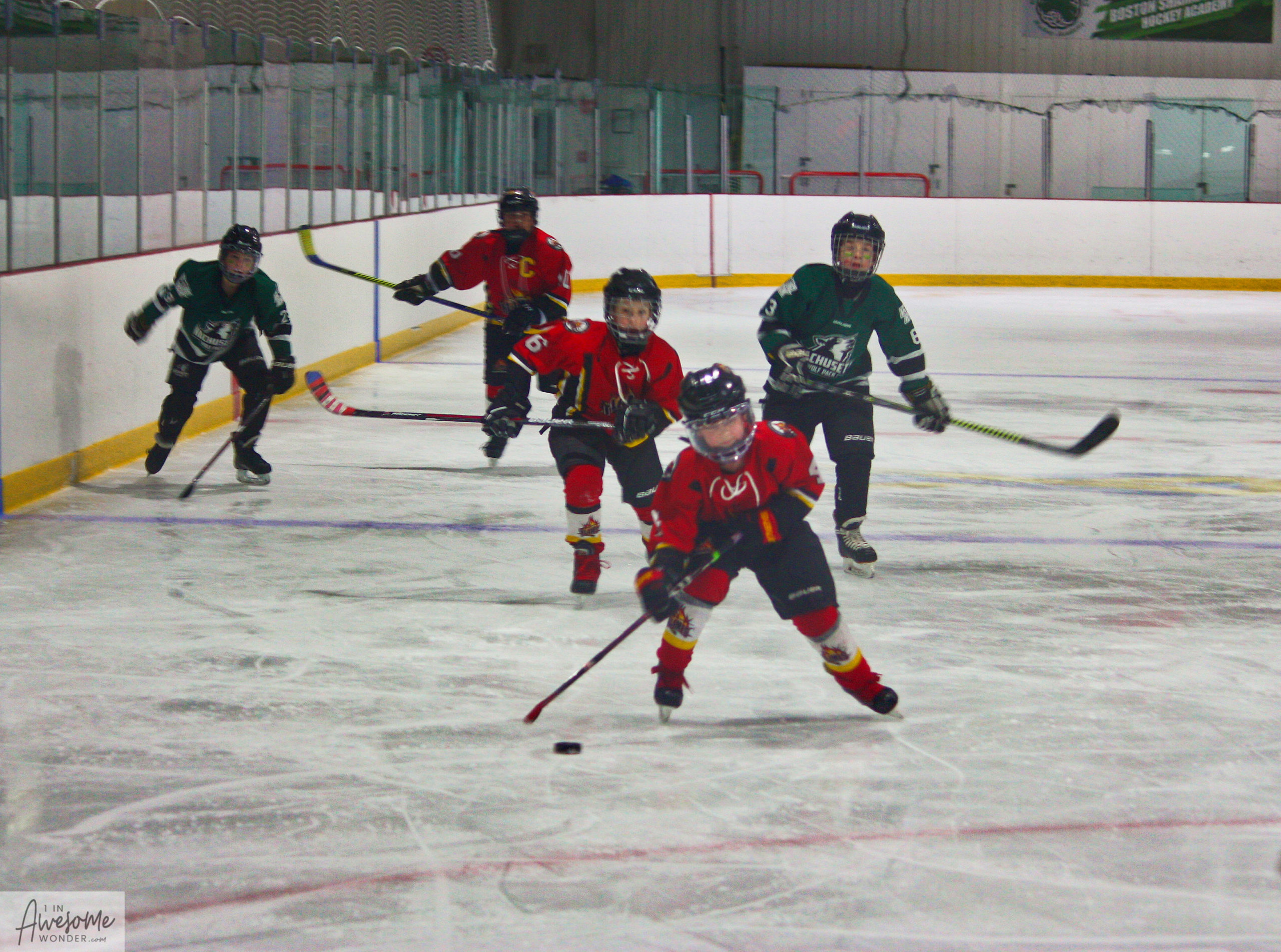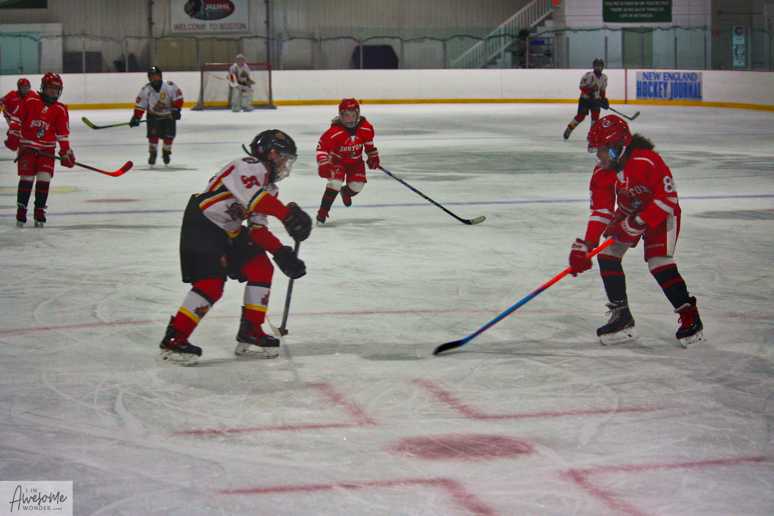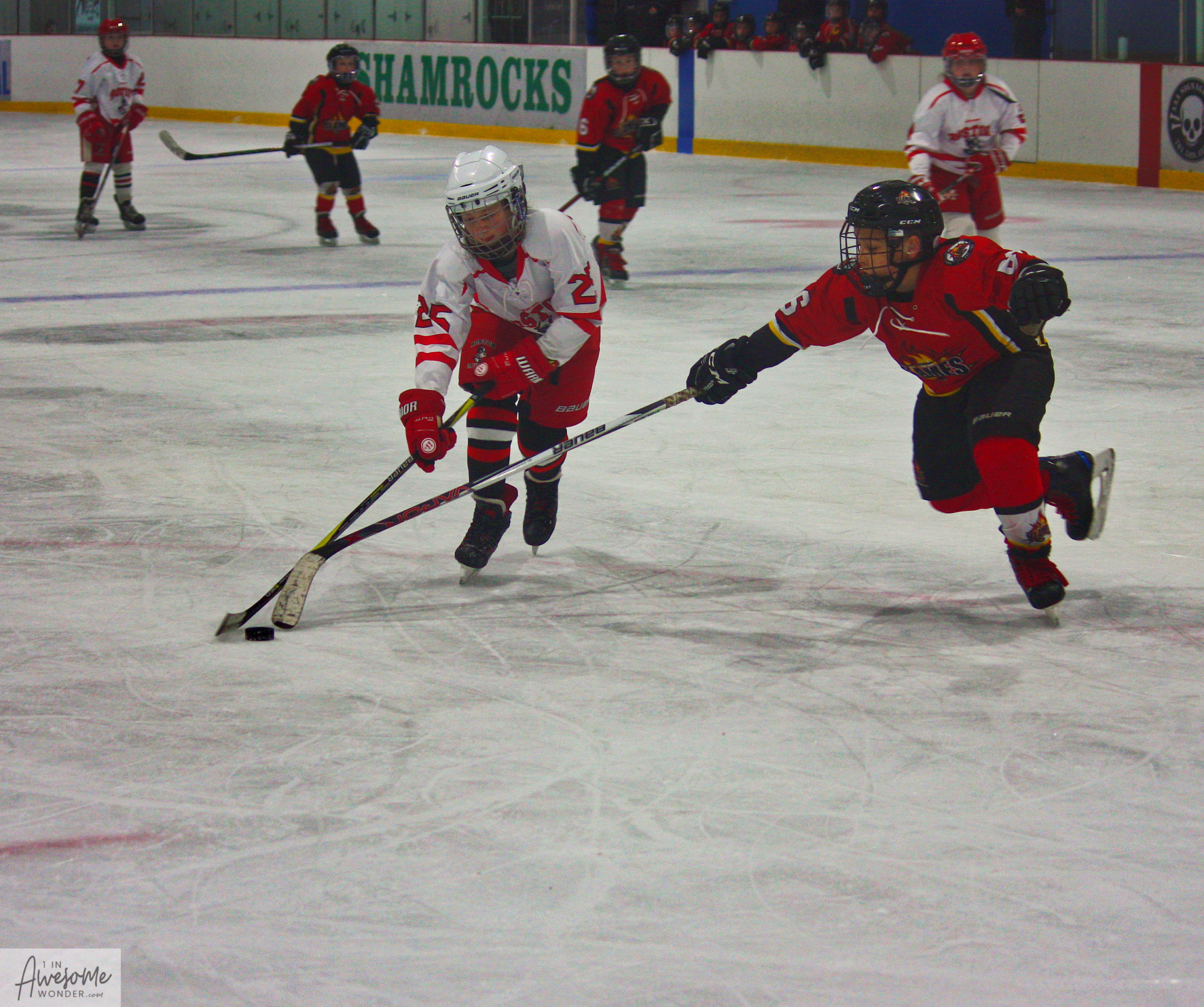 Travis is ready for hockey despite the Terriers yelling, “Red Rover, Red Rover, send Logan right over.”