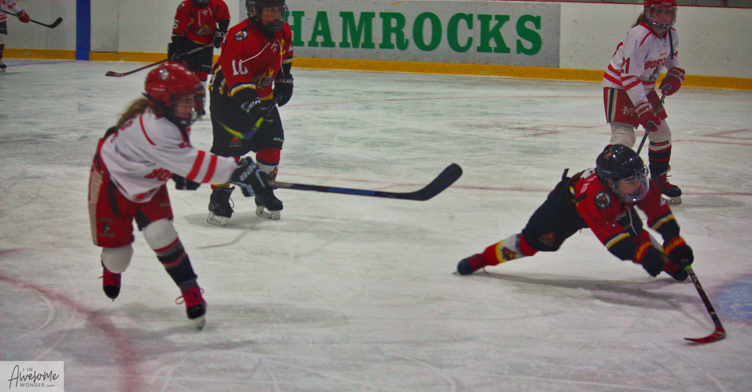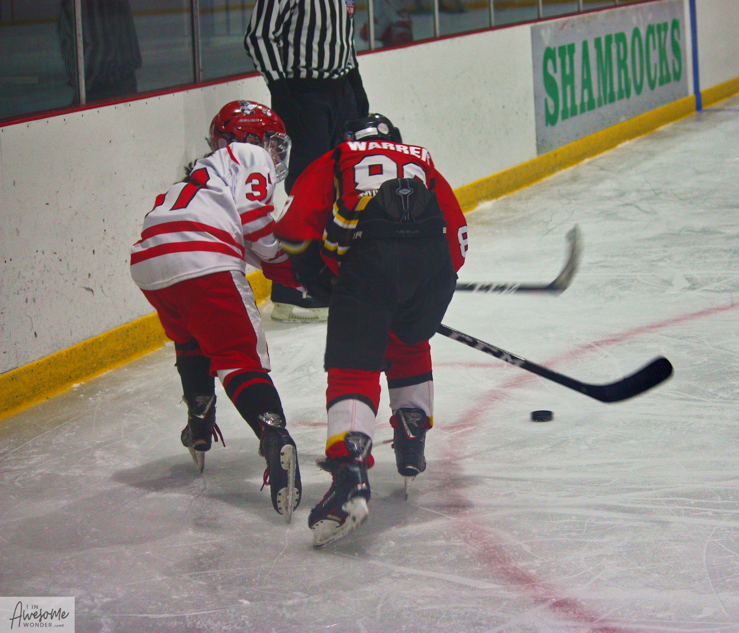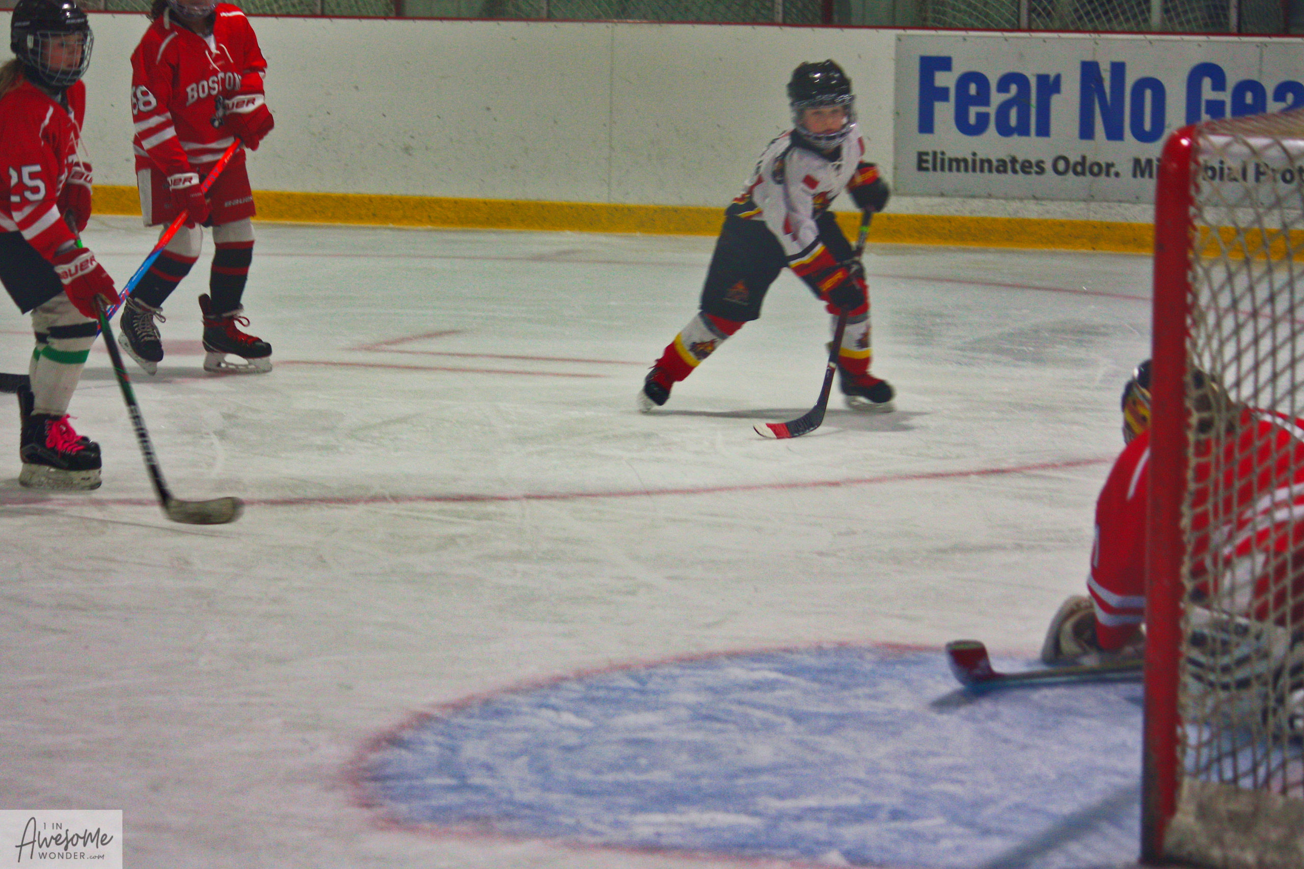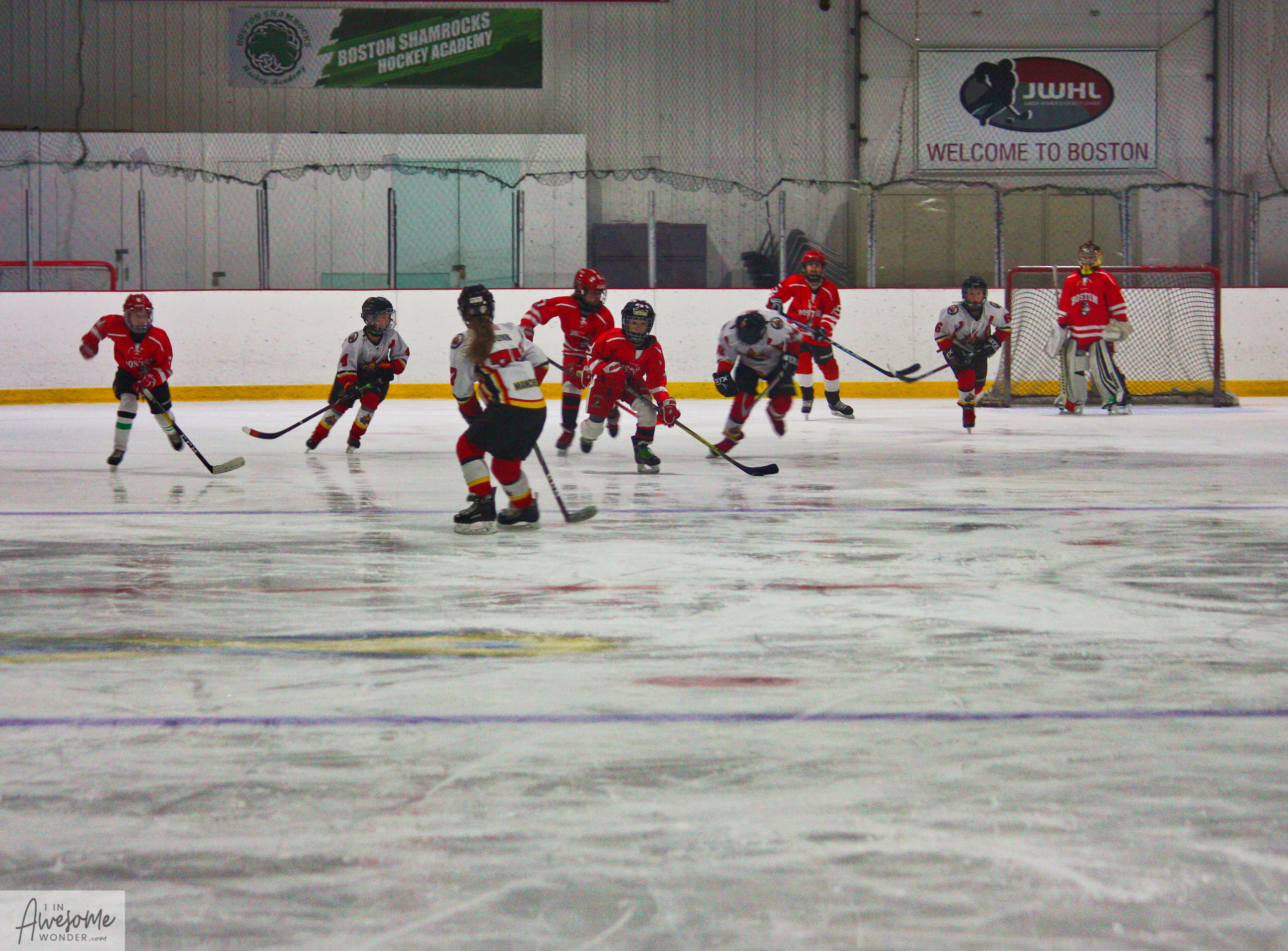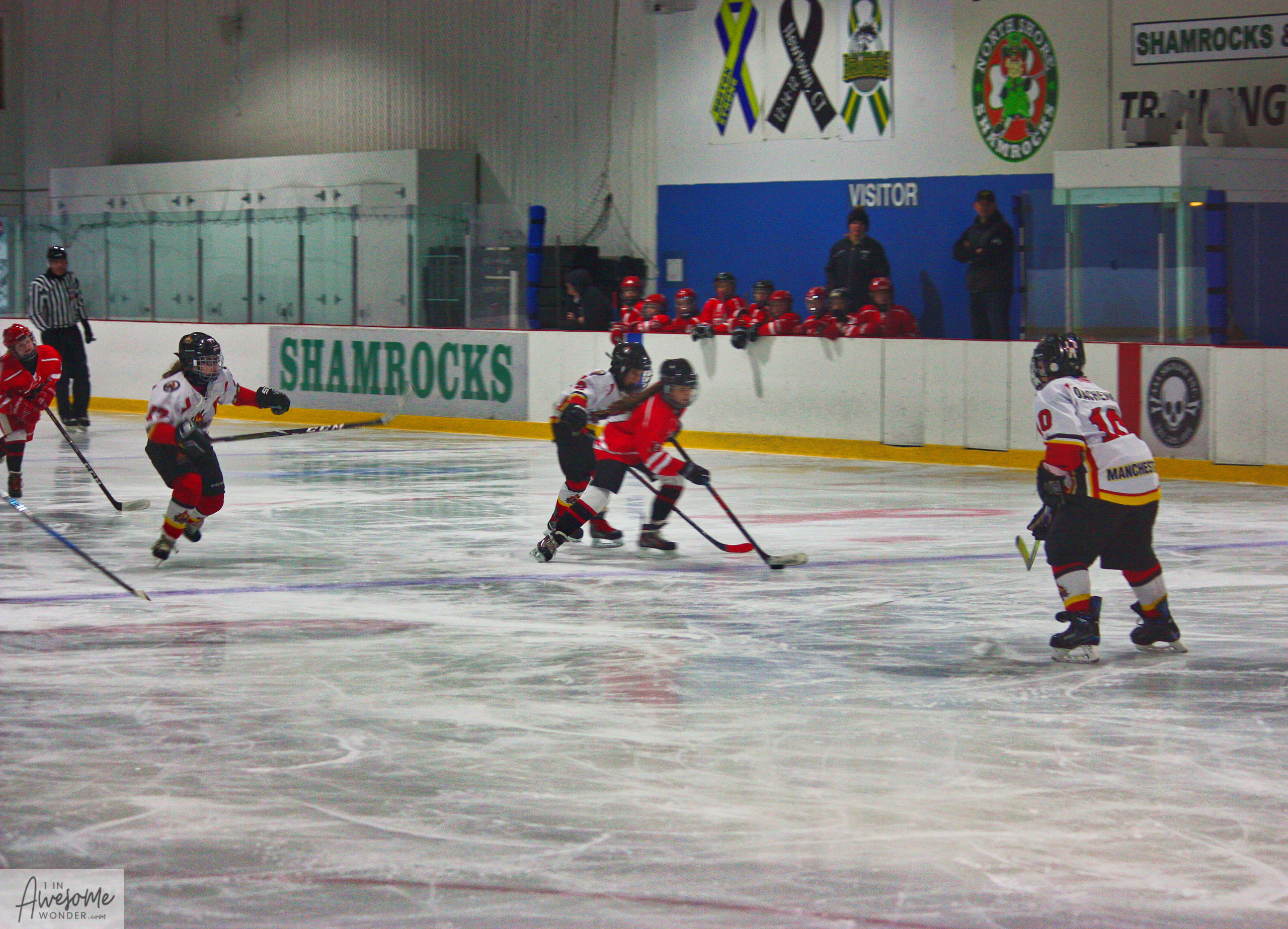 Travis is ready for hockey despite the Terriers yelling, “Red Rover, Red Rover, send Logan right over.”