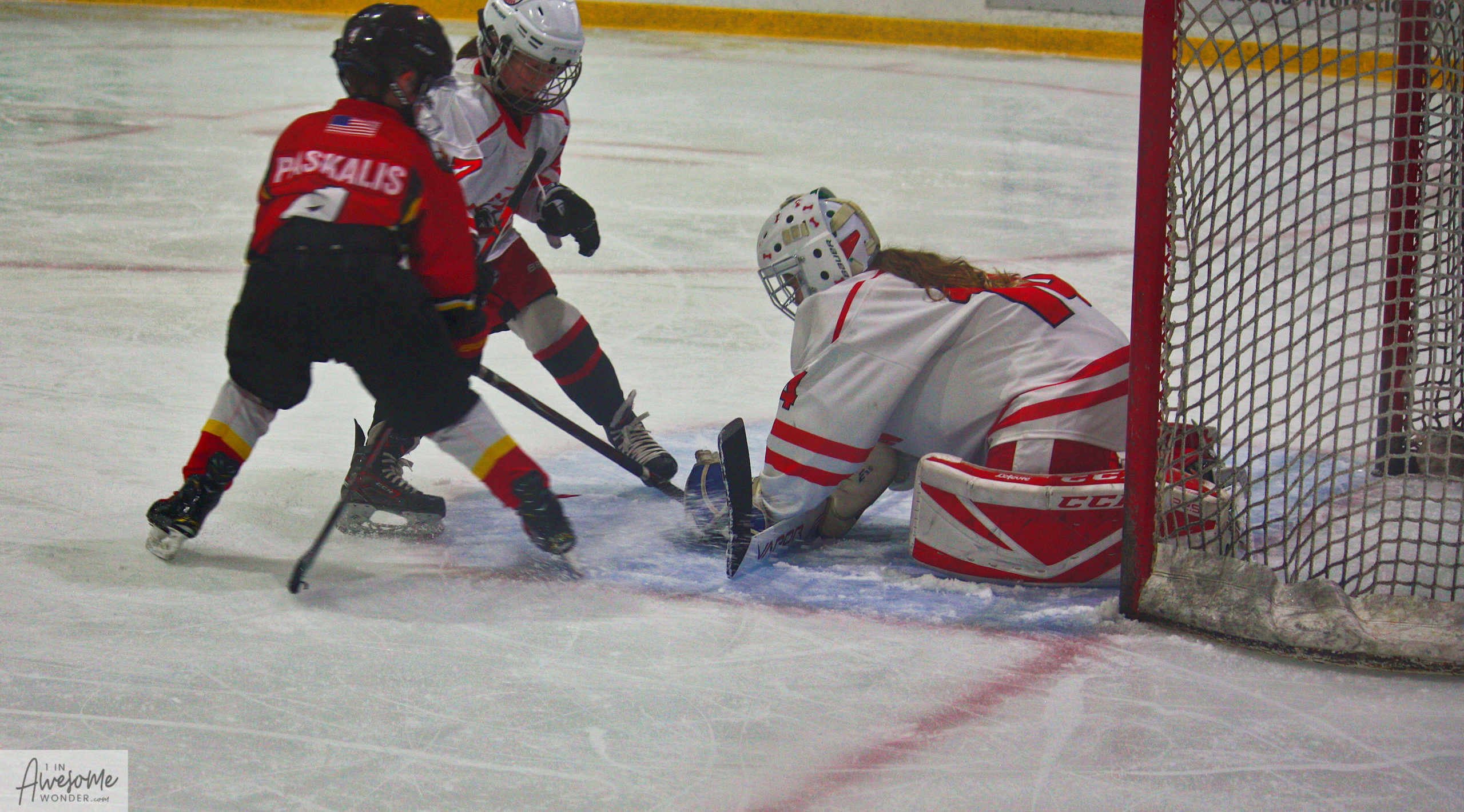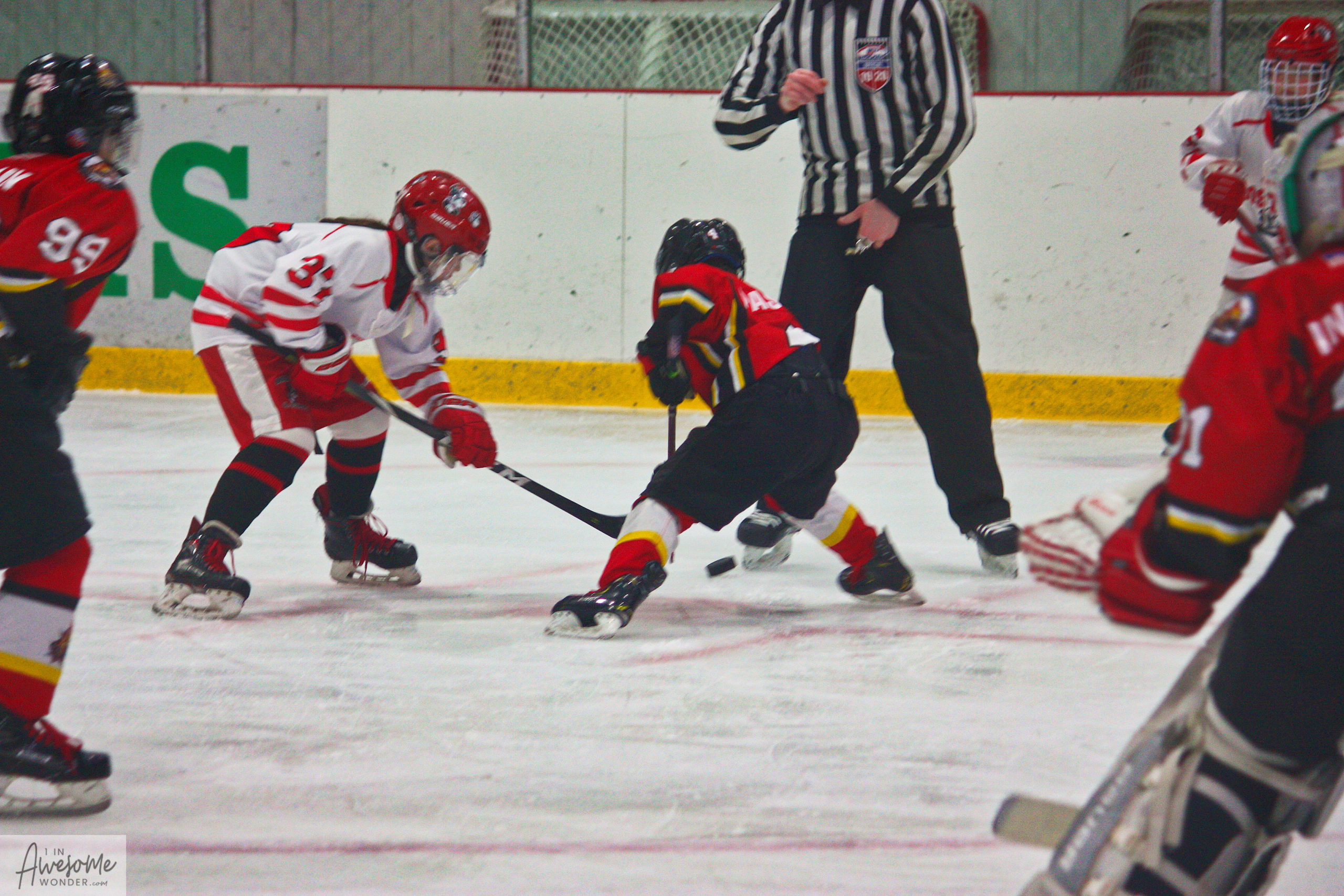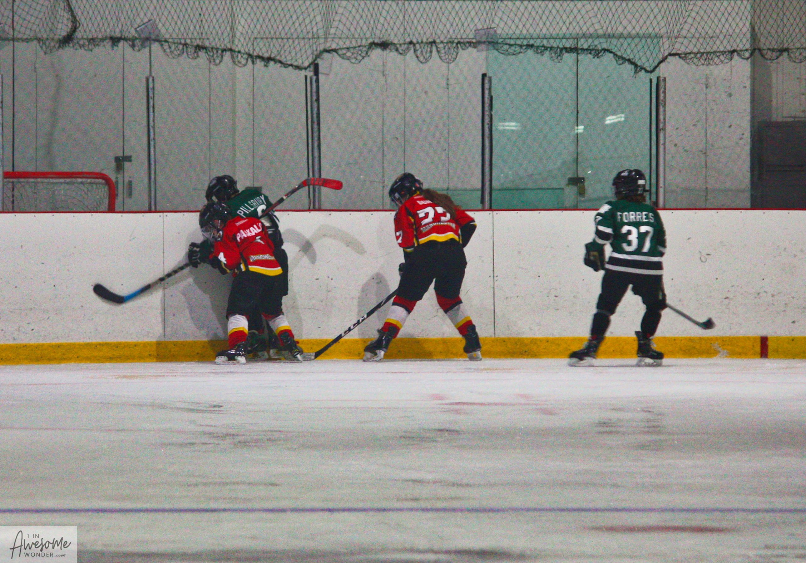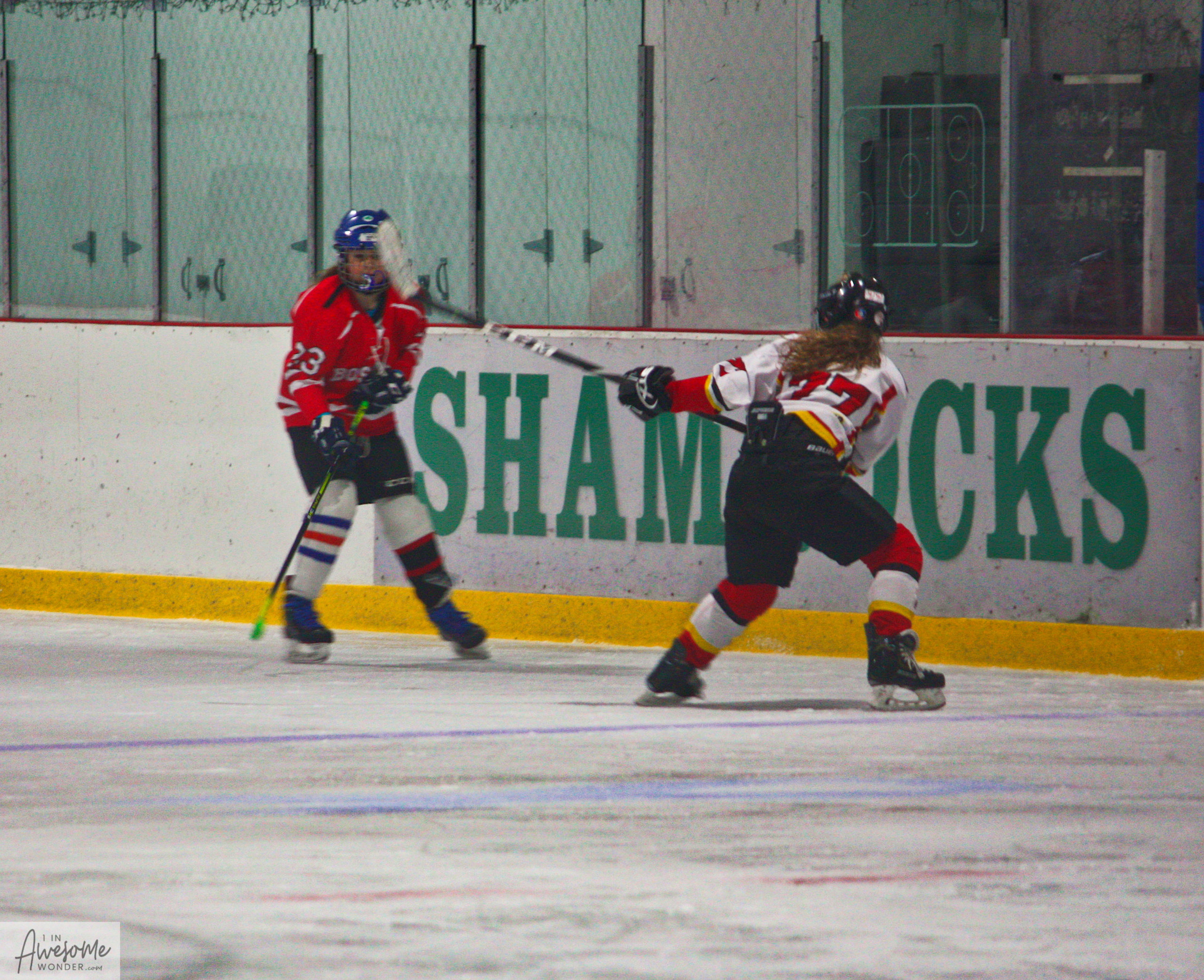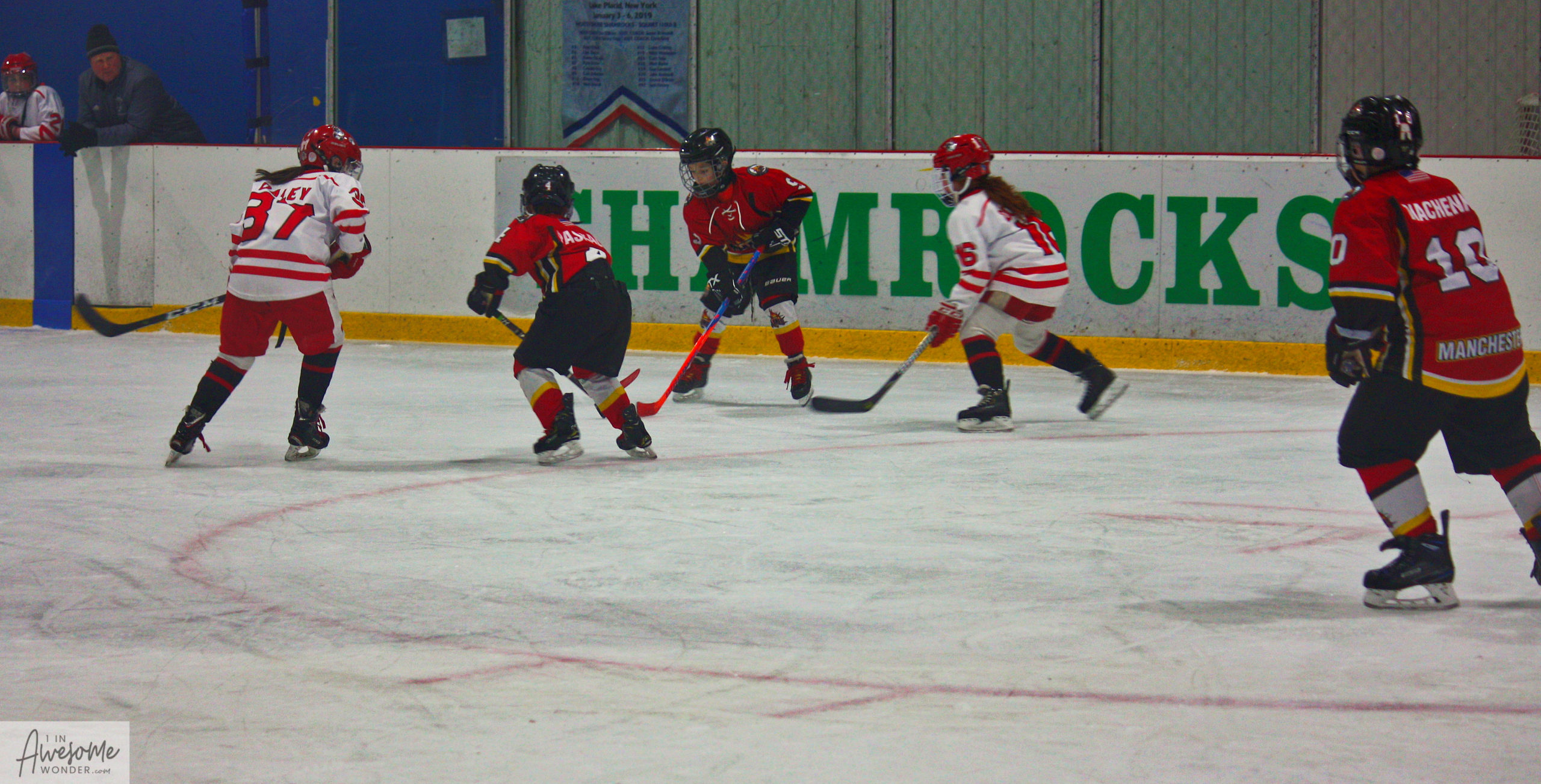 Travis is ready for hockey despite the Terriers yelling, “Red Rover, Red Rover, send Logan right over.”
