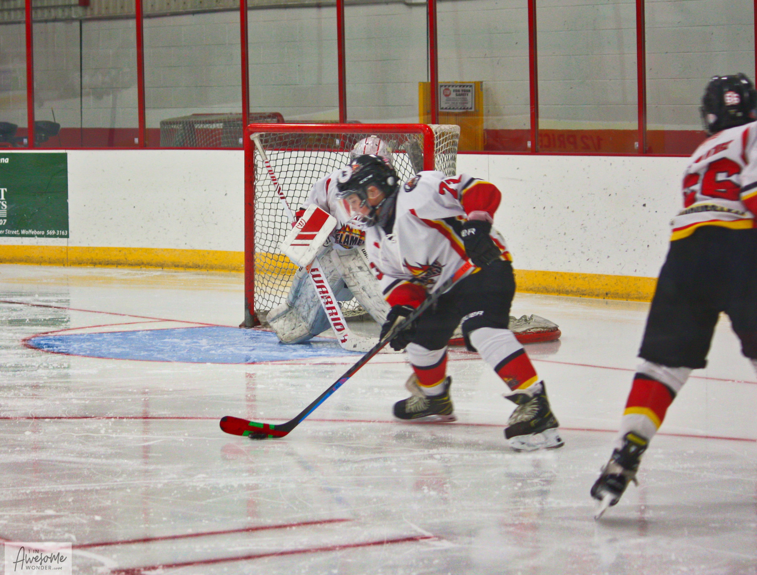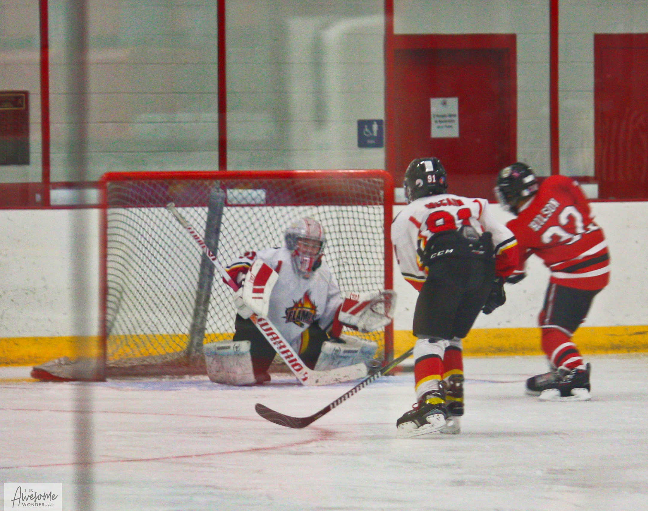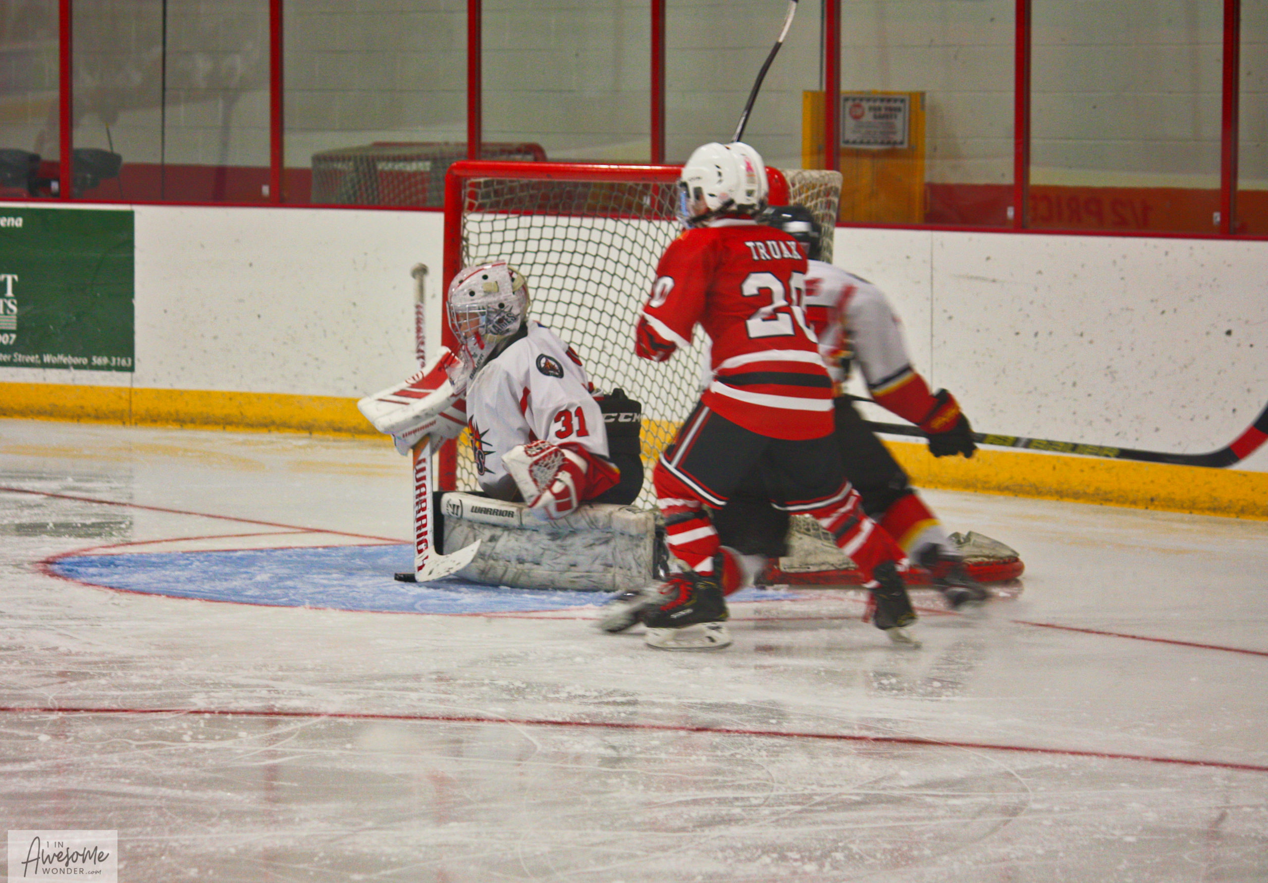 The puck slides into the net after a pass from Teddy to Cam for the go ahead goal with 1:45 left to play.