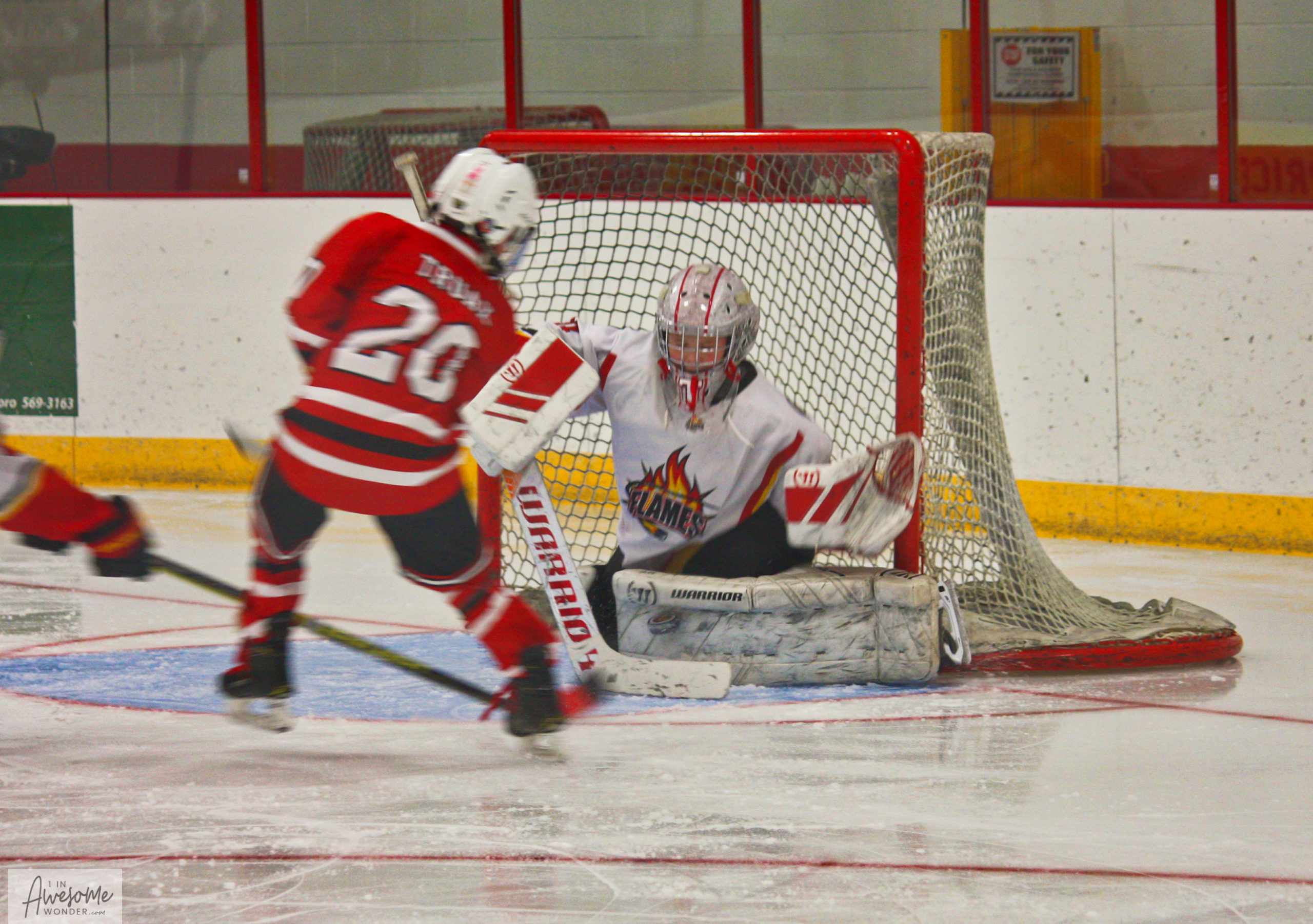 This was a stick save that deflected high into the air. The puck is rising past Travis’ blocker on the way up. Colby ultimately cleared the puck from the crease once the puck landed.