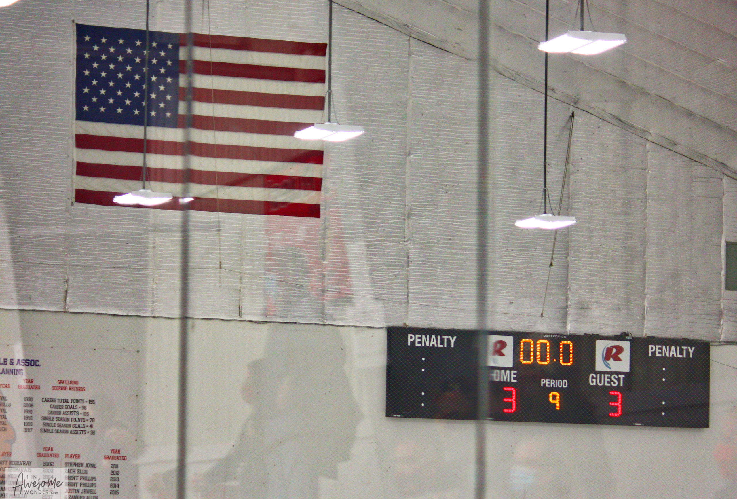 Old Glory looms large on the wall above the final score. I caught the score as they were winding up through the periods to reset the board.