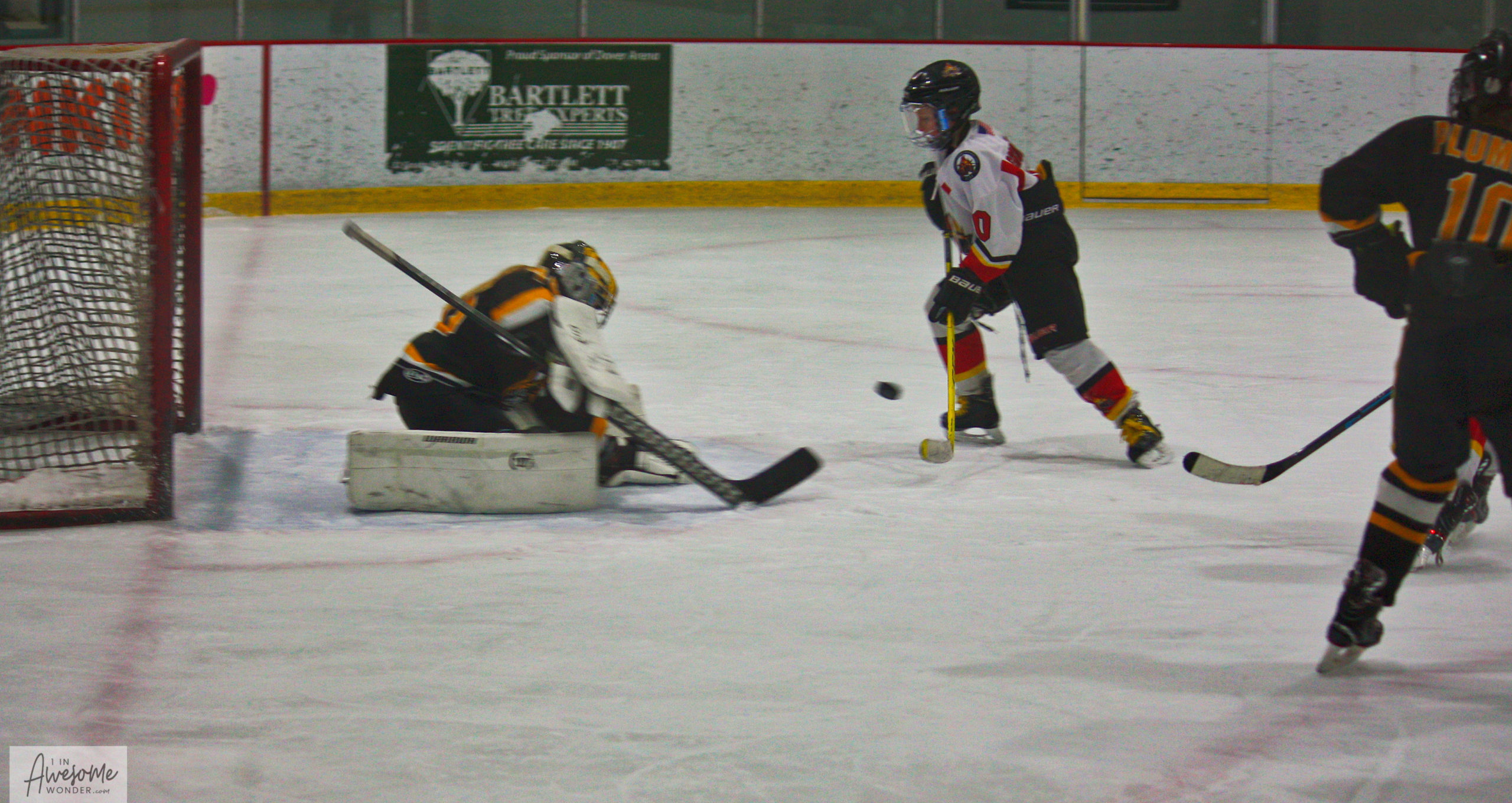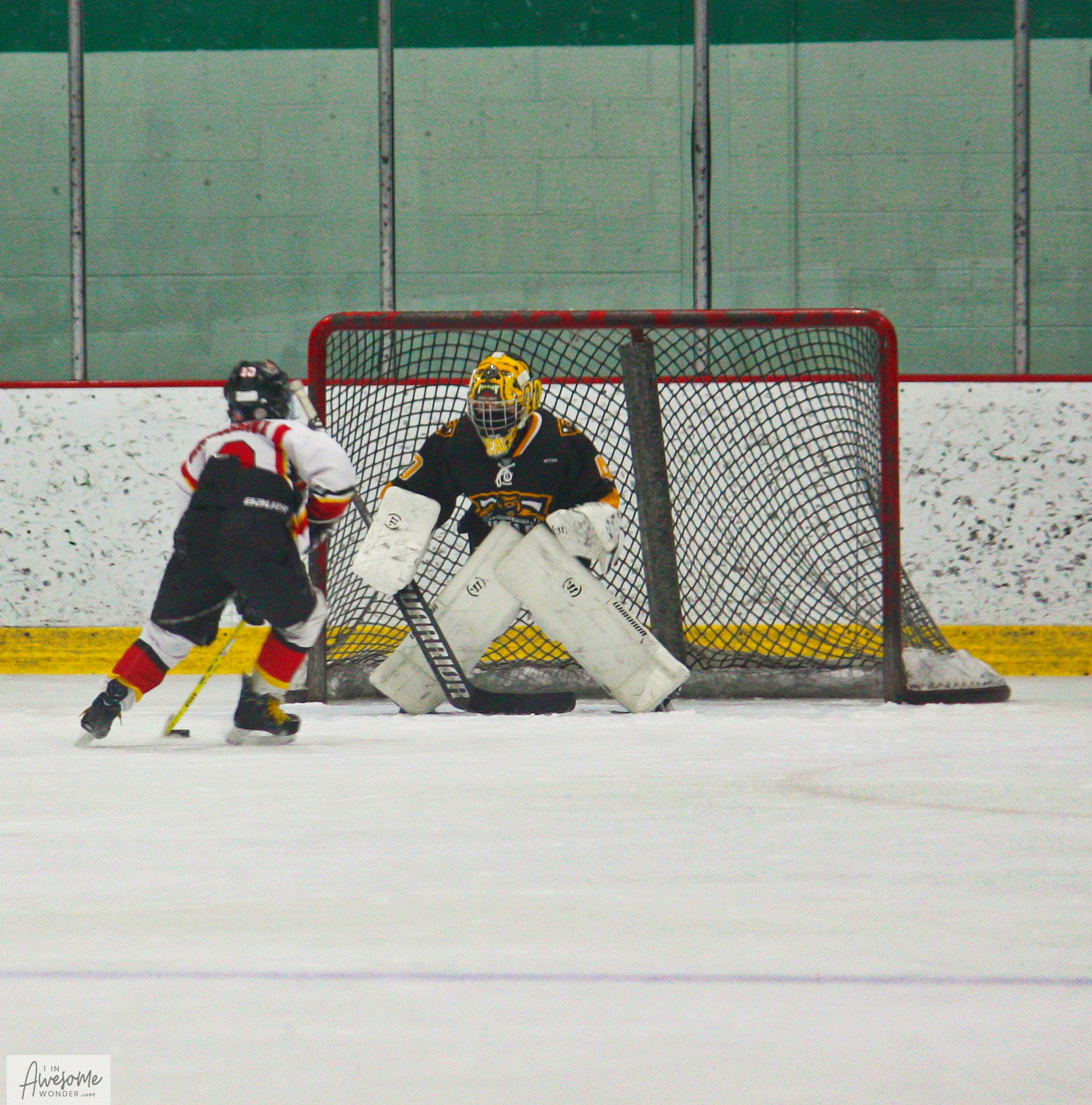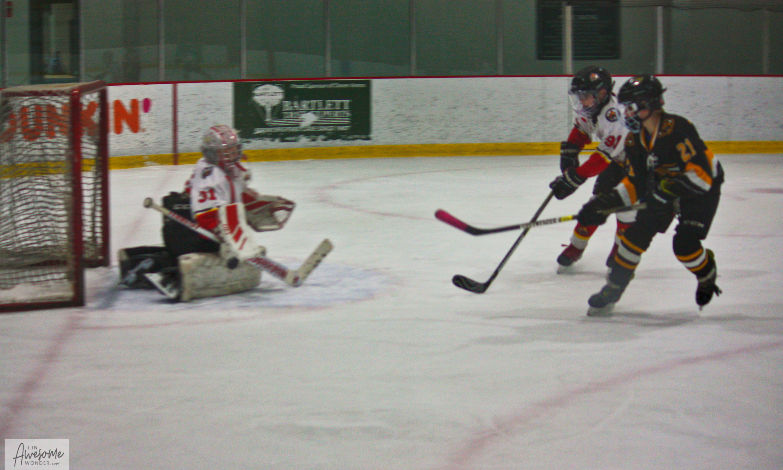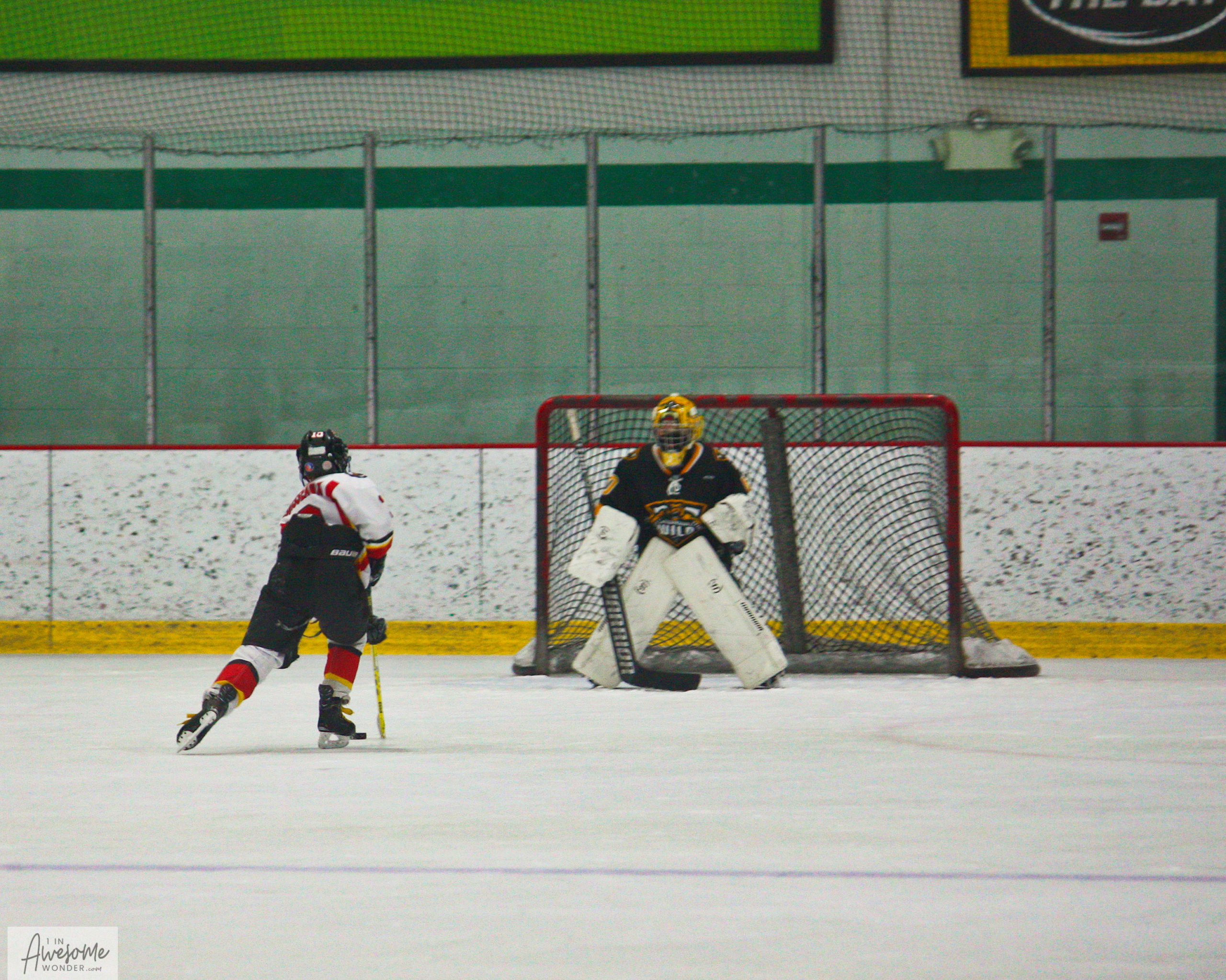 The Mighty Fin fires a shot toward the net and Teddy is in his happy place looking for a chance to score.