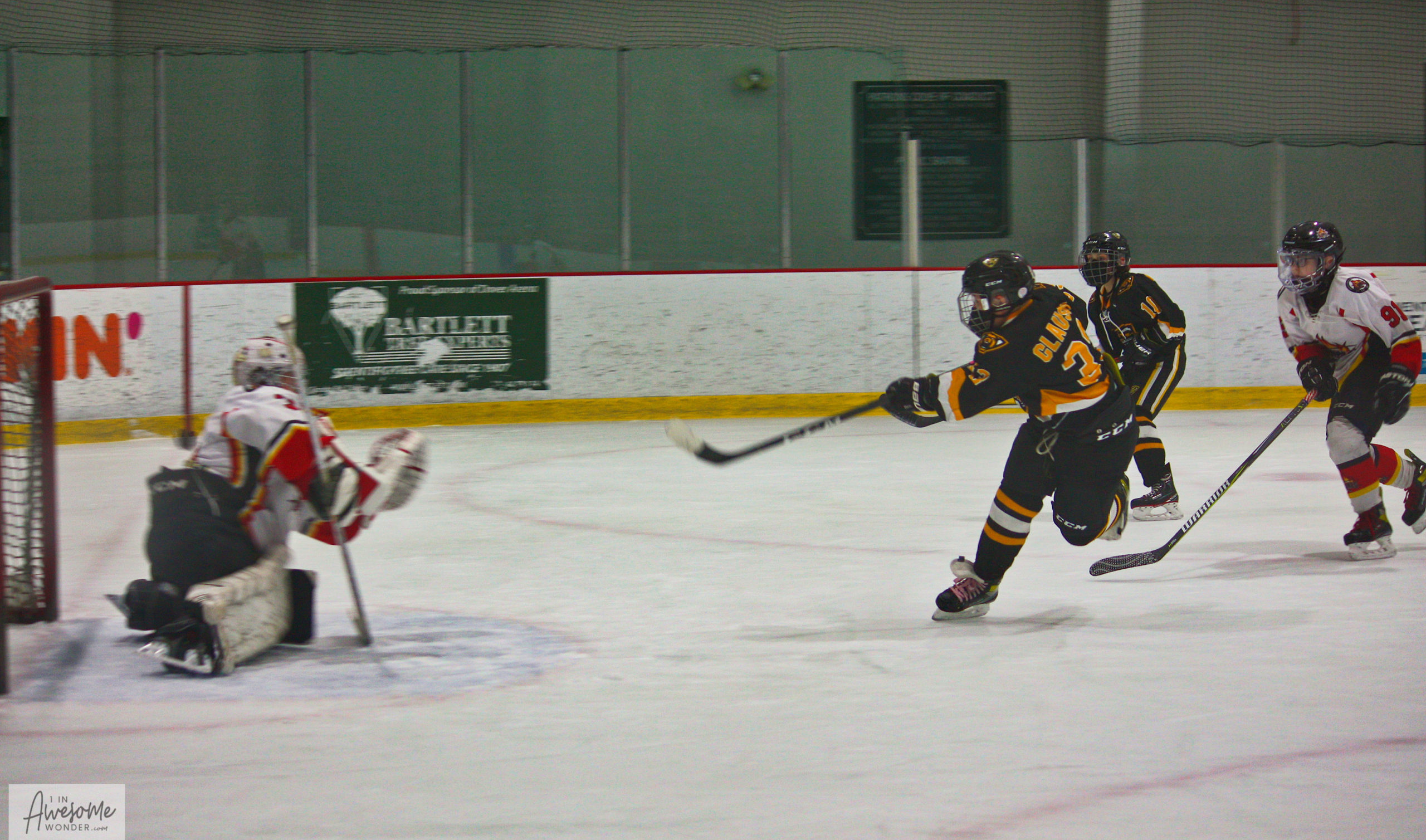 Teddy lifts a backhand shot over the goalie and into the net on the rebound of Sean’s shot for a Flames goal.