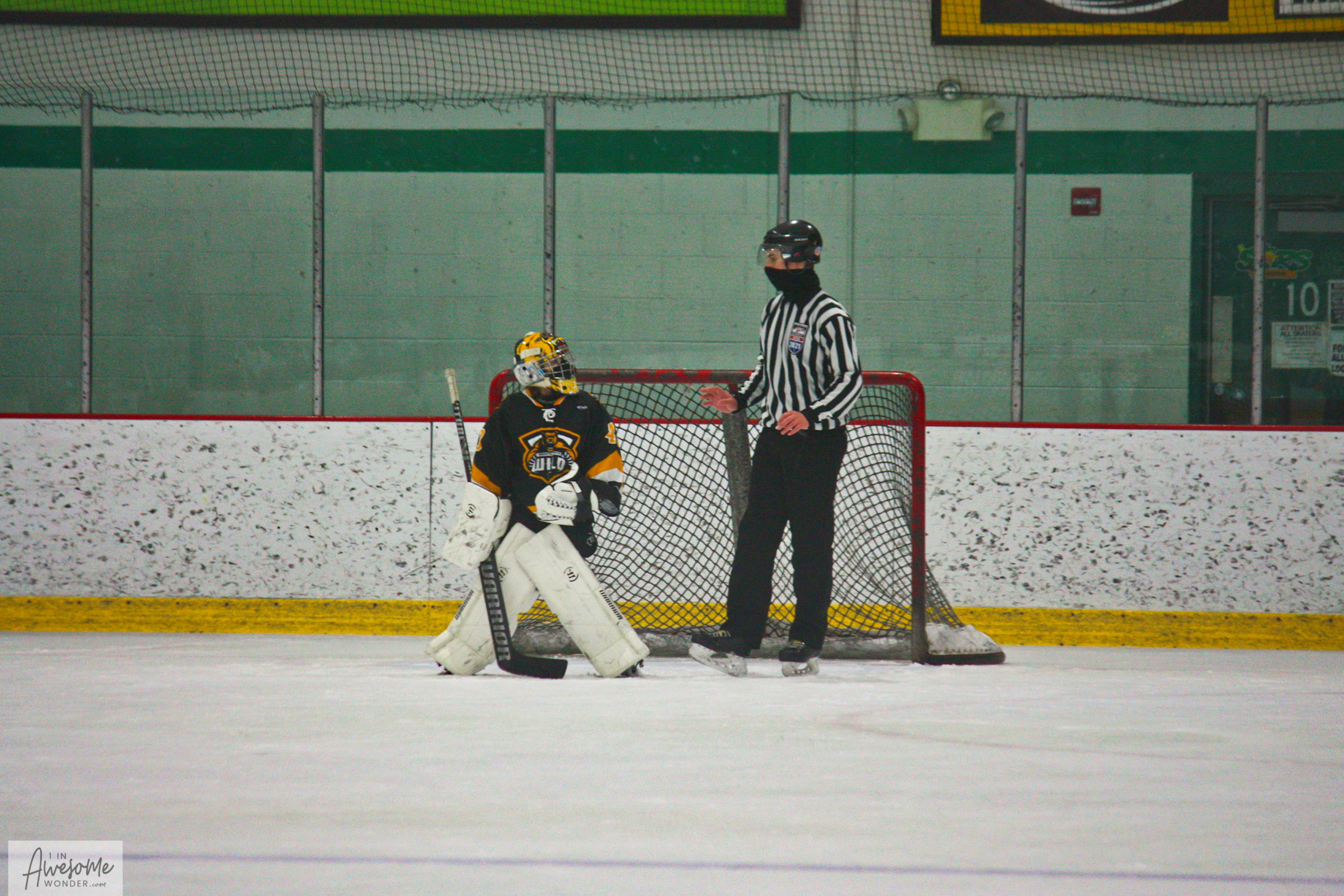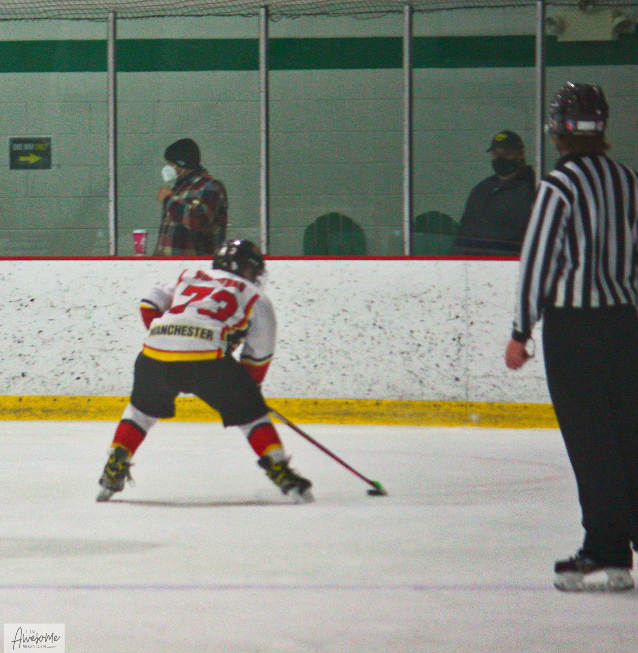 Jax holds the puck while waiting for the guy in the white mask to watch the play. Jax is always so cognizant of the fans best interest.