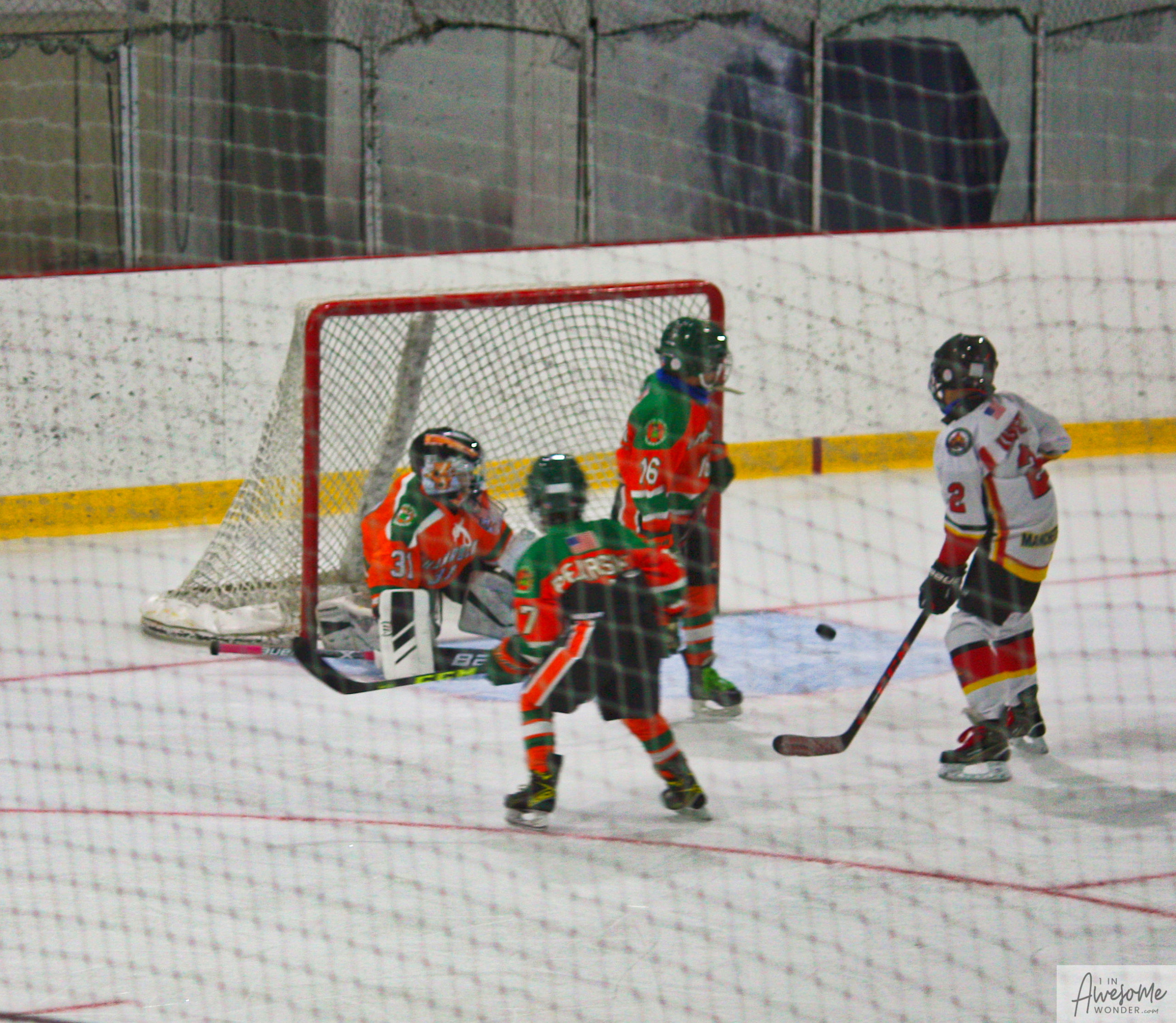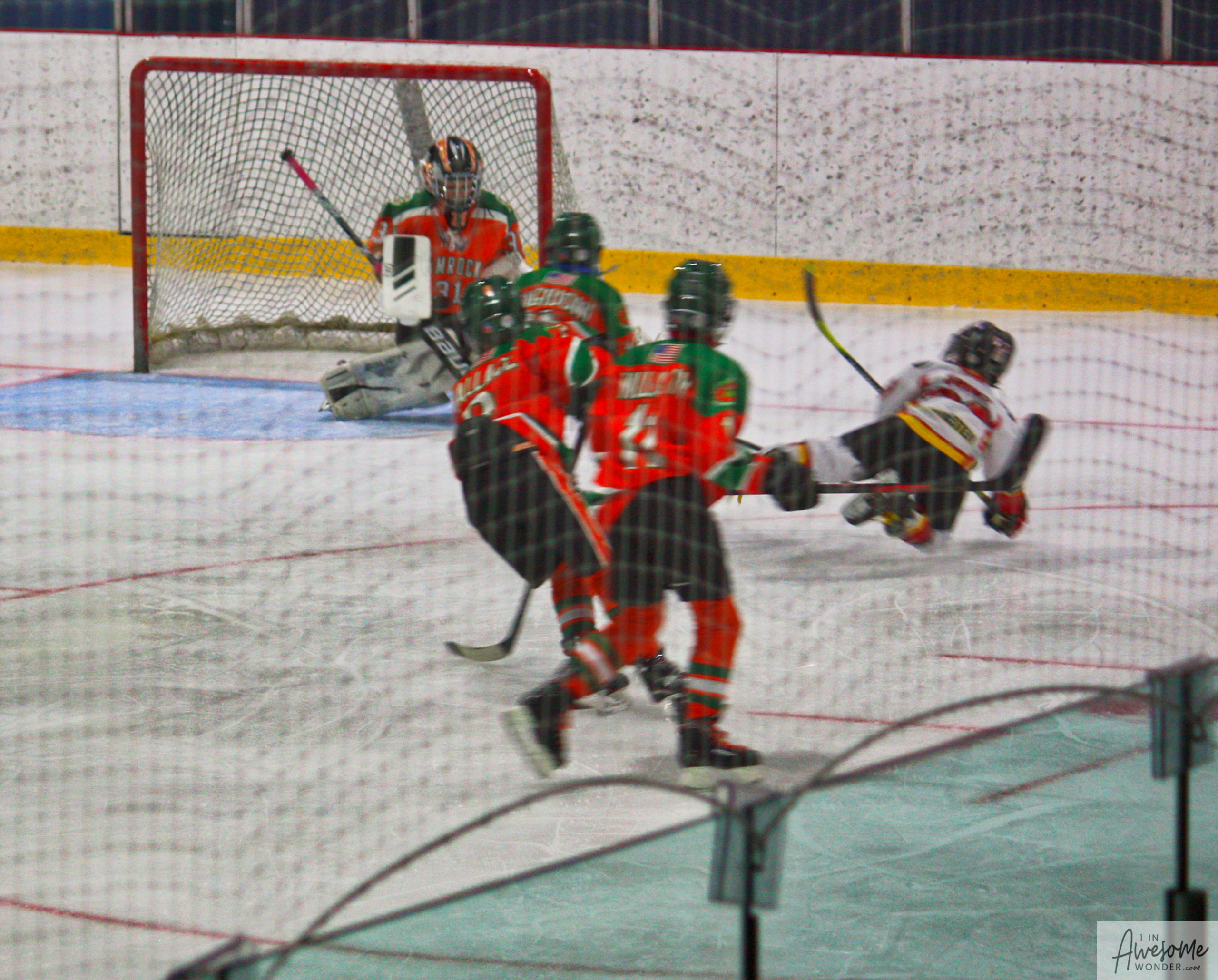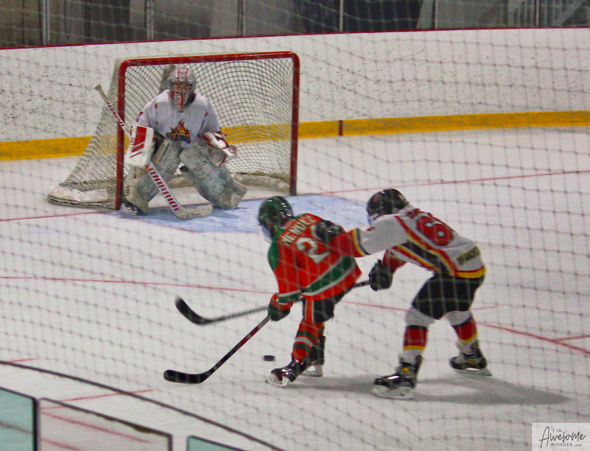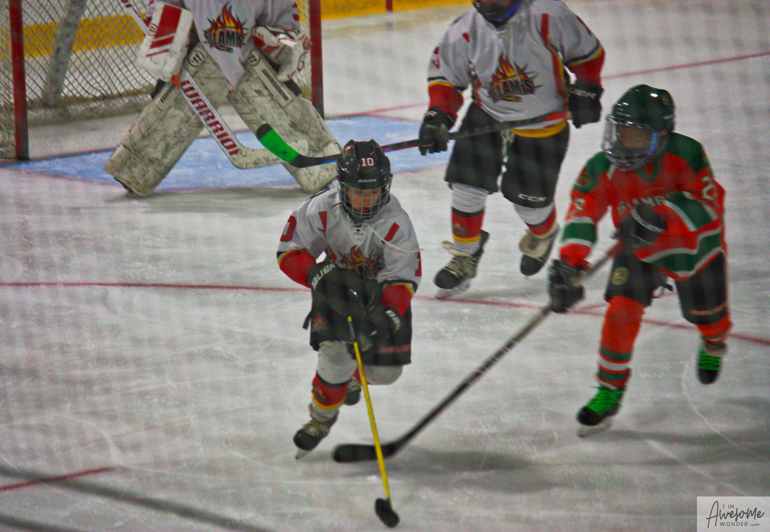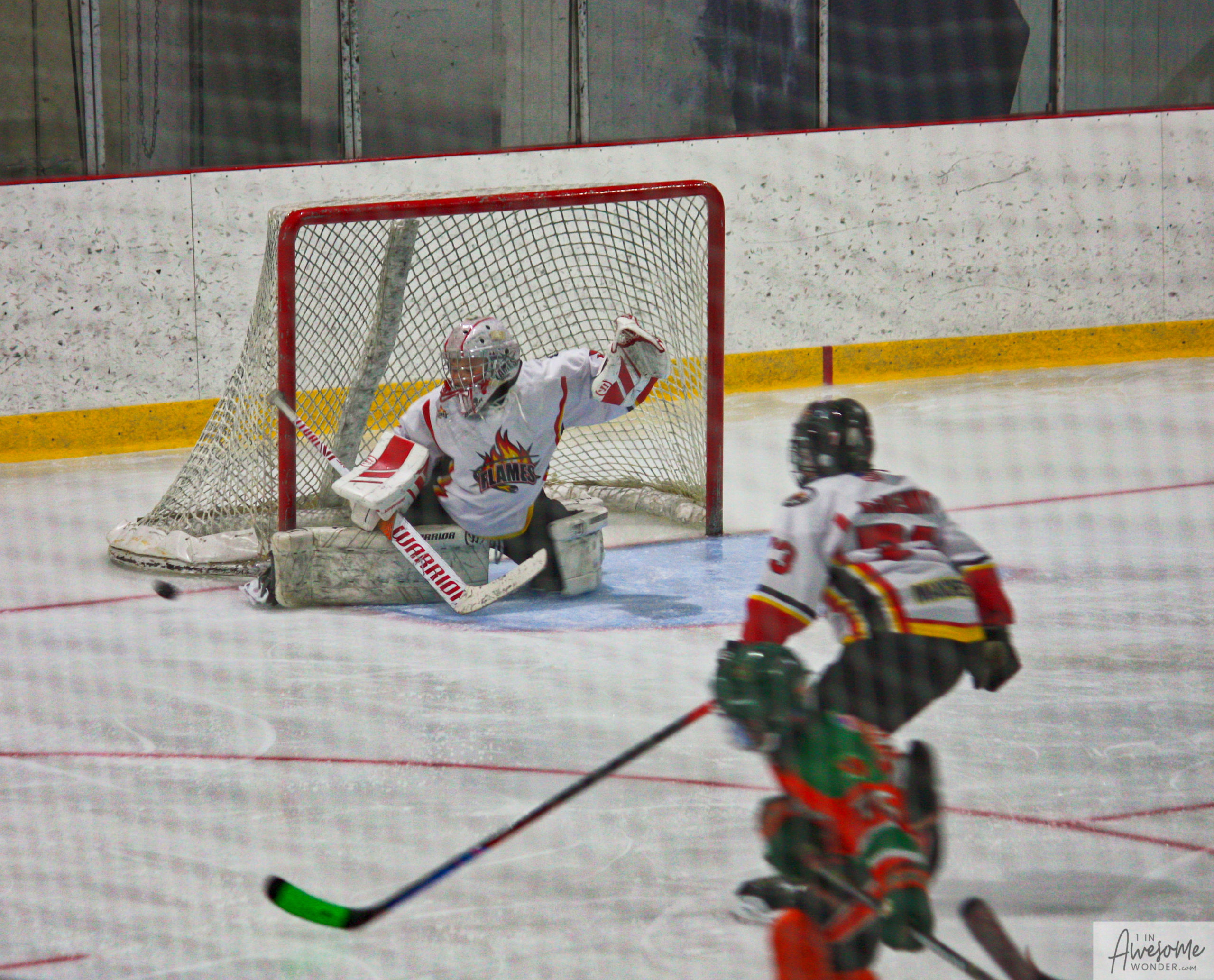 After a few rounds of the new hit show “Guess This Week’s Scorekeeper”, the puck was dropped for another youth hockey game. As it turned out, the game was excellent. Both teams competed hard, and neither one gave an inch. It was an intense game with lots of chances for both teams. Overall, the Flames had the better of the play, but the outcome was in question right into the final seconds of the game. I will tell more of the story in the pictures below, but before I do, I want to recognize the goaltender for the Shamrocks who made some huge saves throughout the game. I will get to the Flames goalie in a little bit.