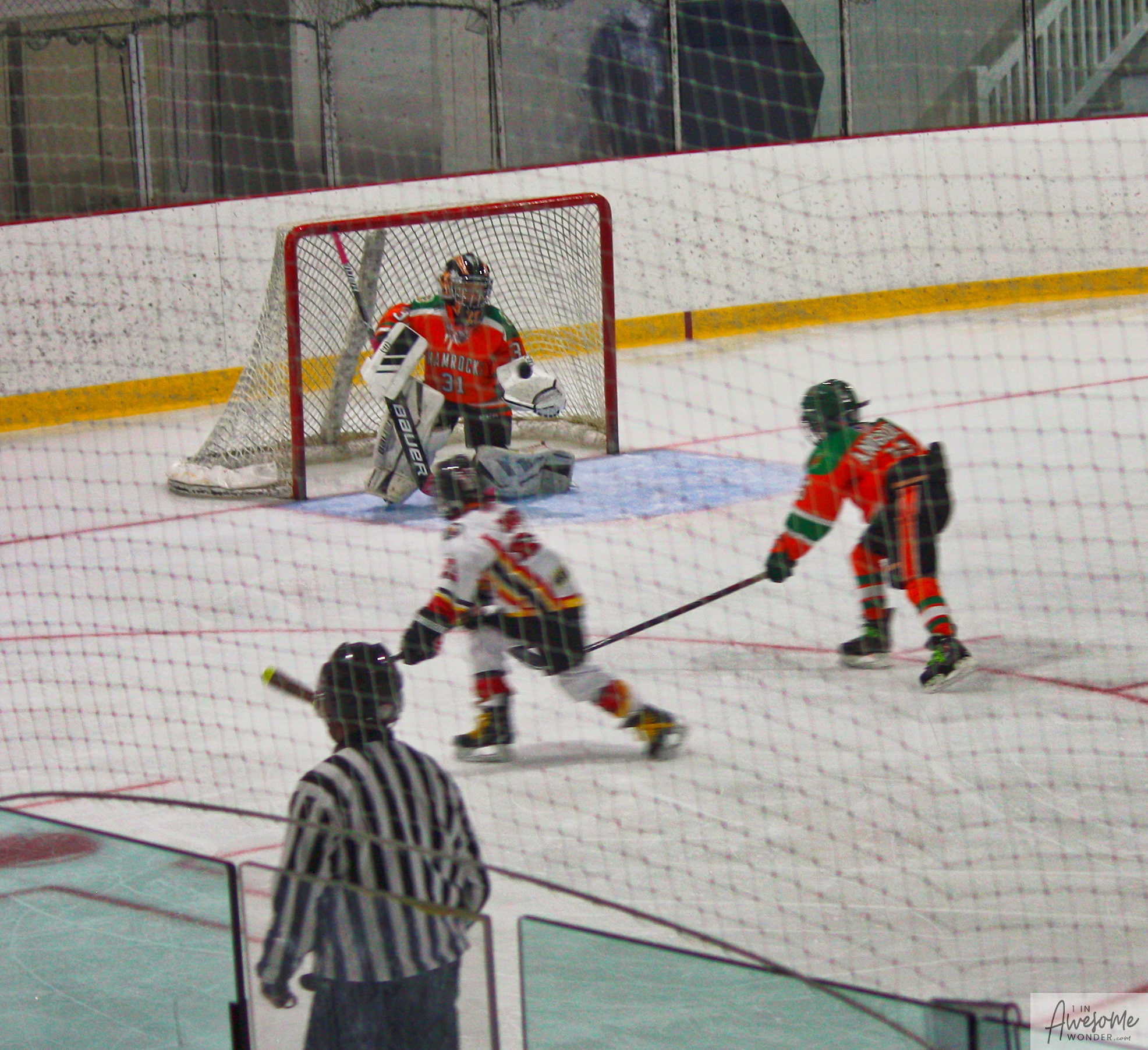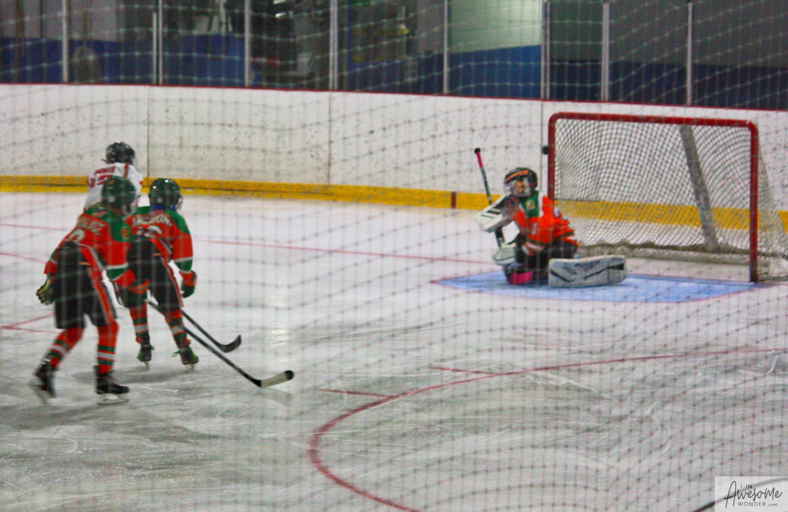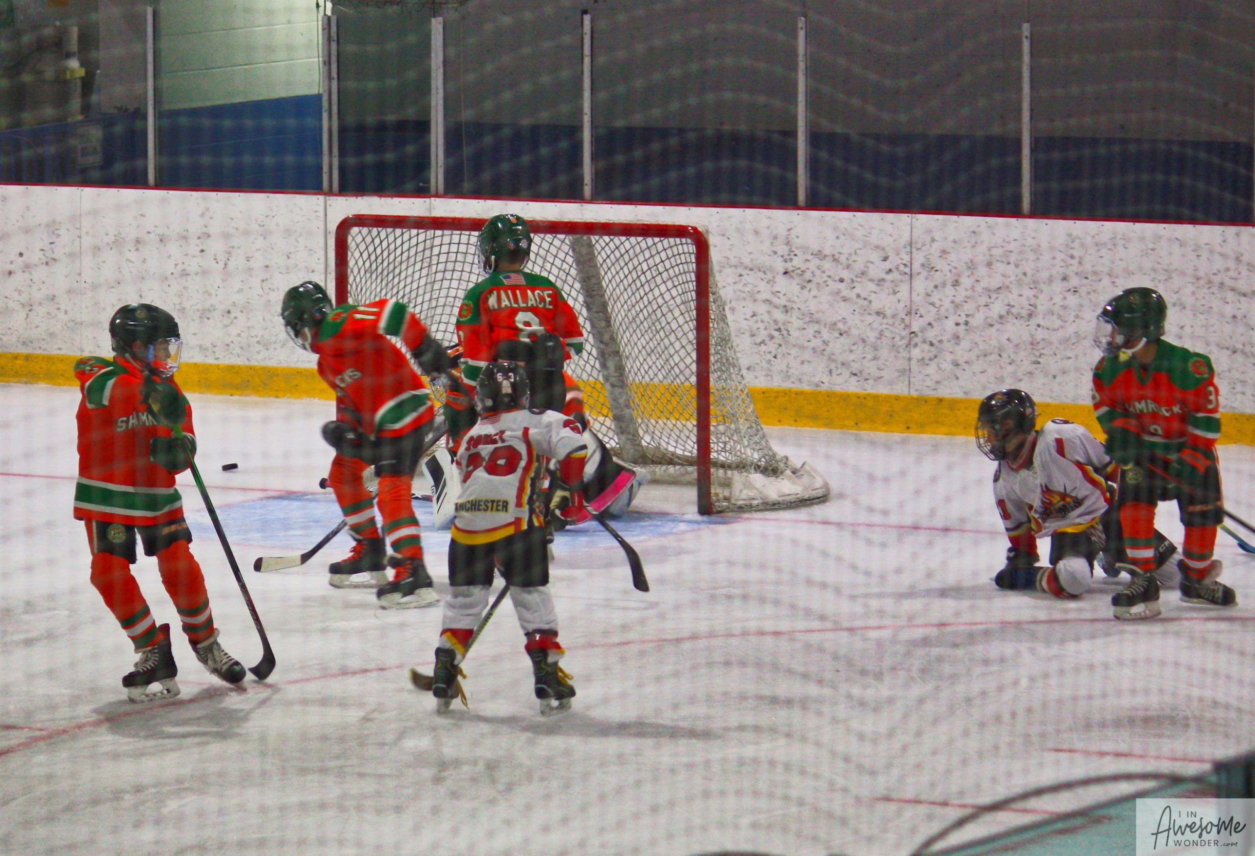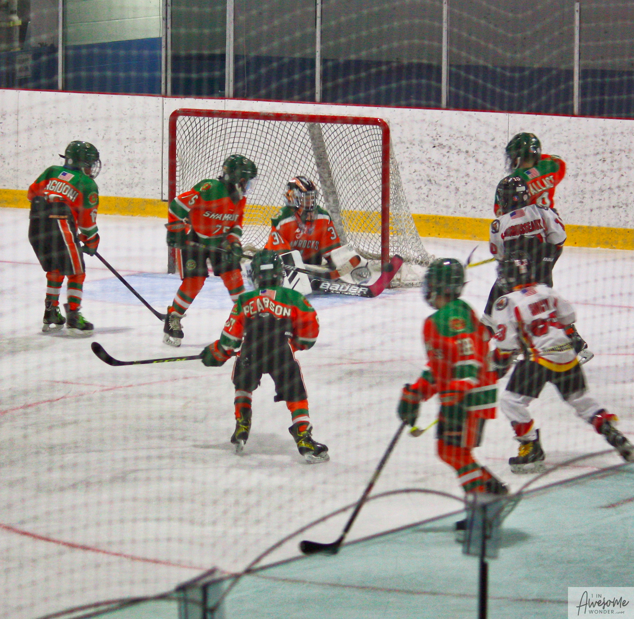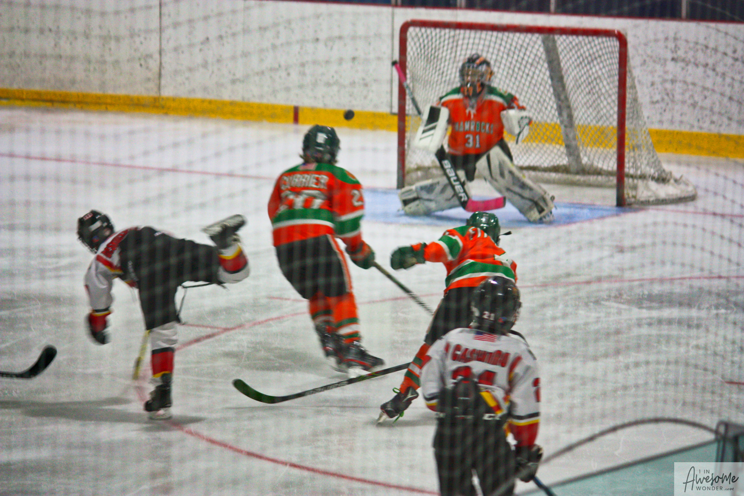 After a few rounds of the new hit show “Guess This Week’s Scorekeeper”, the puck was dropped for another youth hockey game. As it turned out, the game was excellent. Both teams competed hard, and neither one gave an inch. It was an intense game with lots of chances for both teams. Overall, the Flames had the better of the play, but the outcome was in question right into the final seconds of the game. I will tell more of the story in the pictures below, but before I do, I want to recognize the goaltender for the Shamrocks who made some huge saves throughout the game. I will get to the Flames goalie in a little bit.