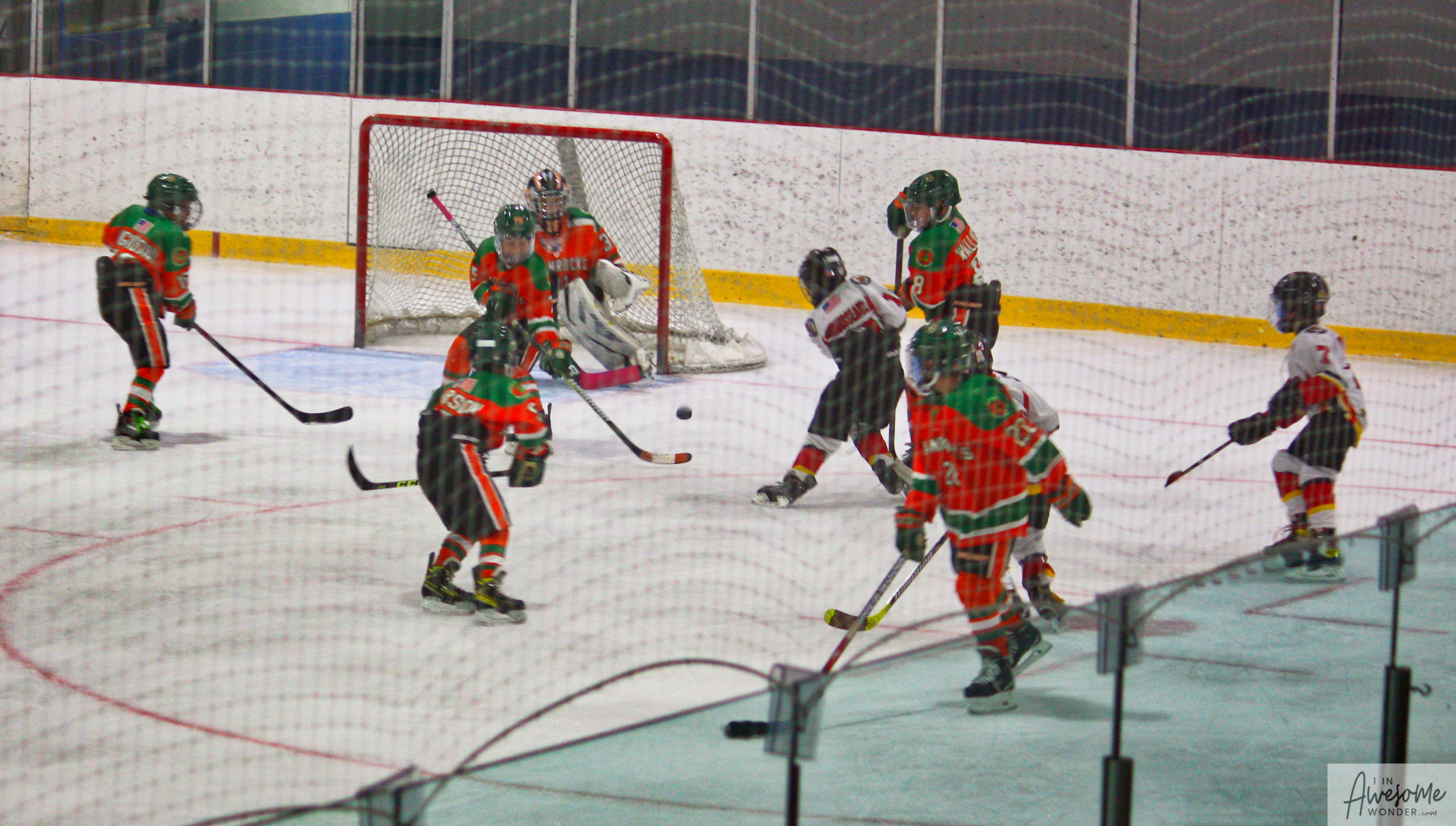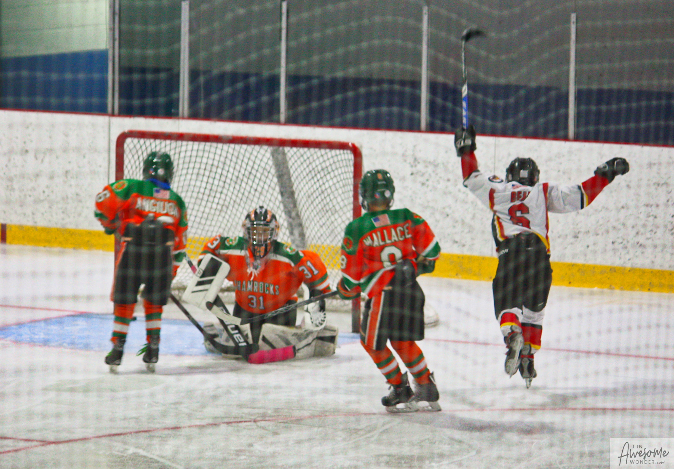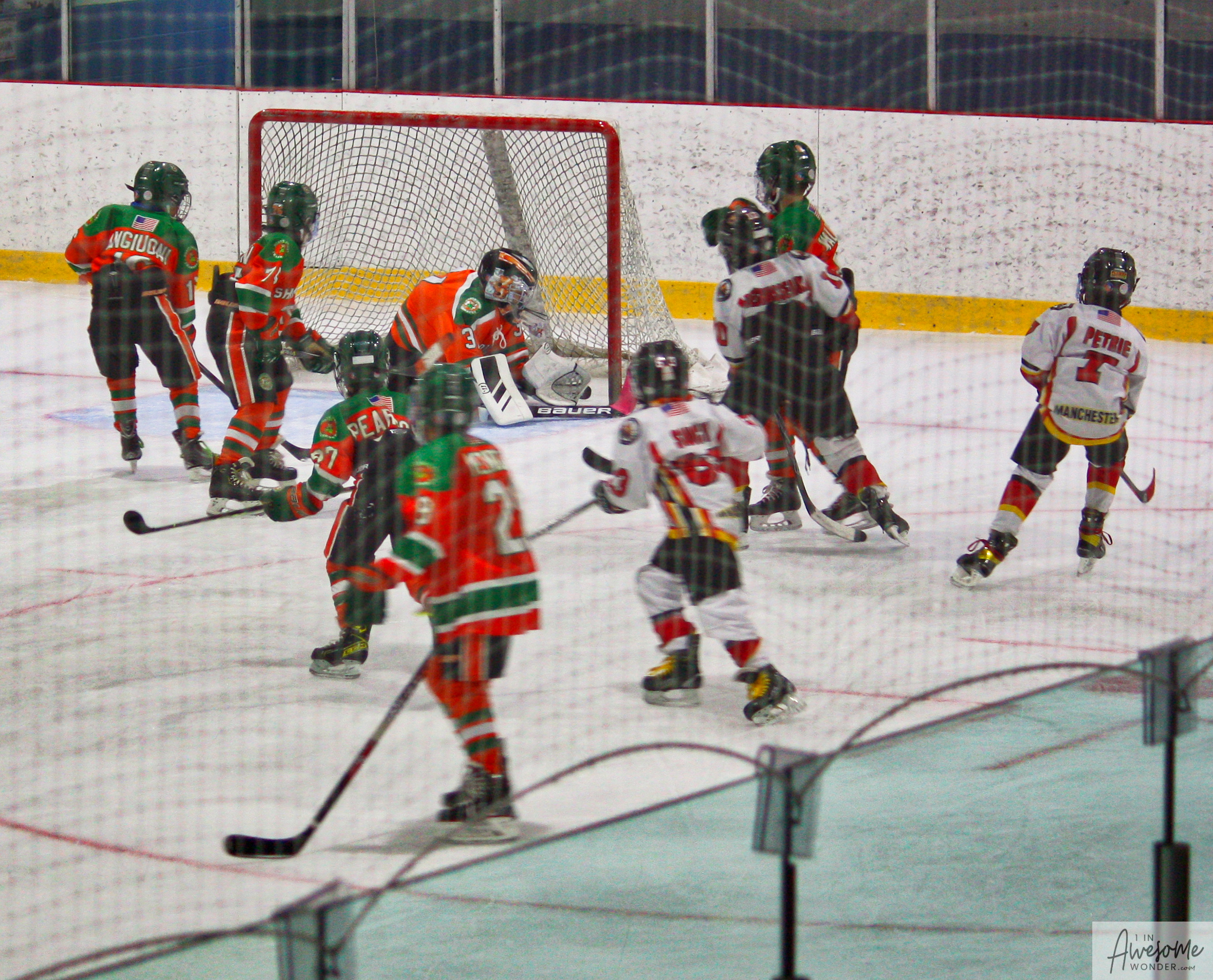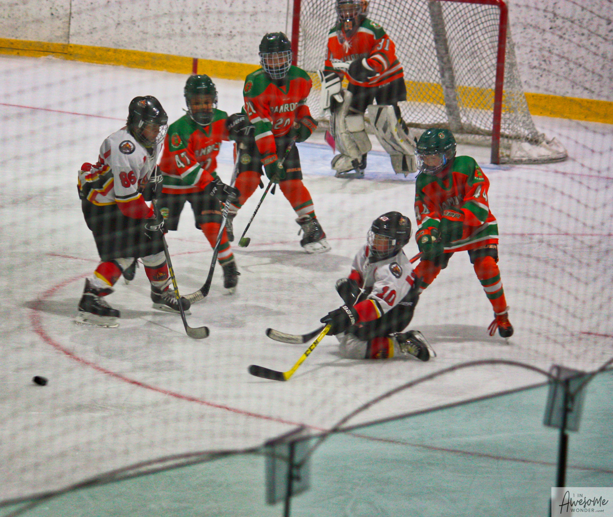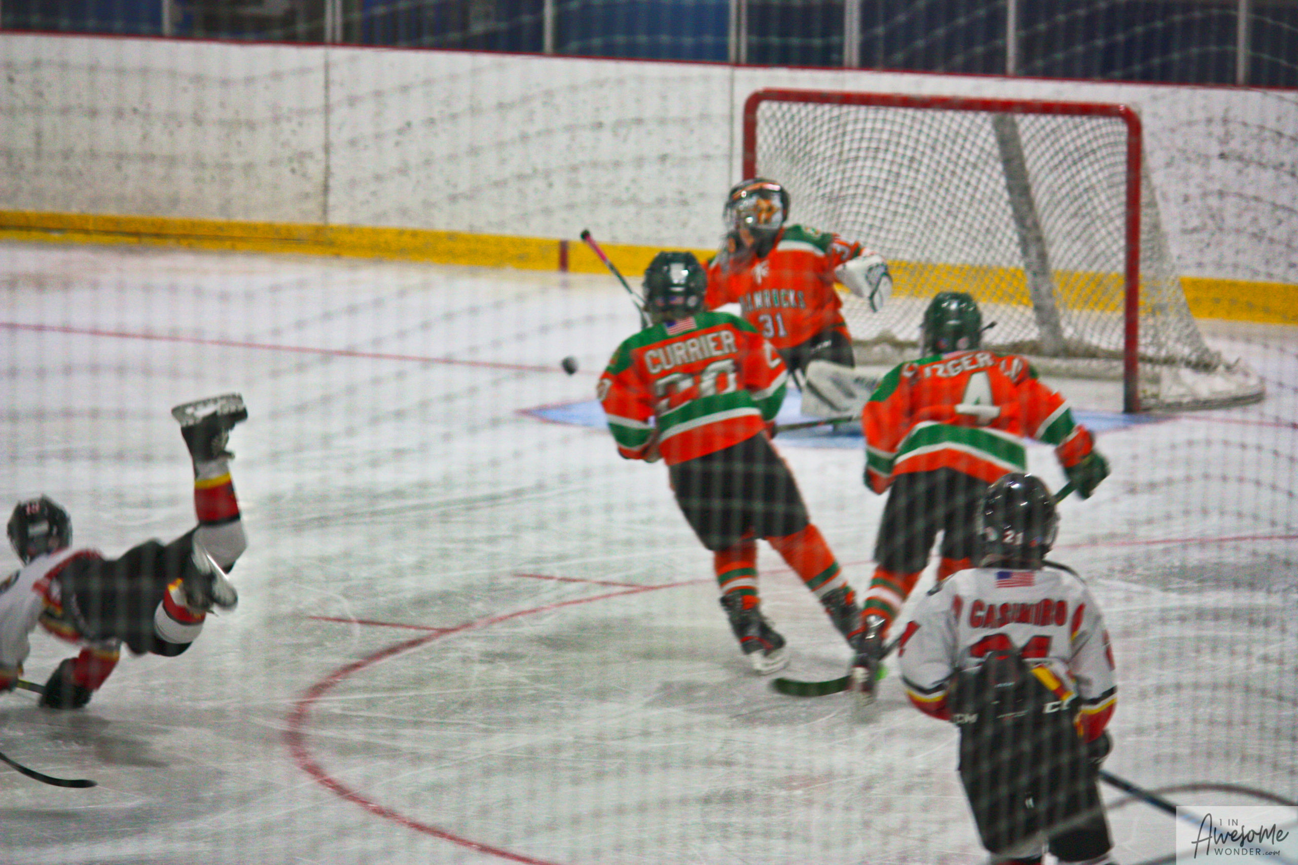 After a few rounds of the new hit show “Guess This Week’s Scorekeeper”, the puck was dropped for another youth hockey game. As it turned out, the game was excellent. Both teams competed hard, and neither one gave an inch. It was an intense game with lots of chances for both teams. Overall, the Flames had the better of the play, but the outcome was in question right into the final seconds of the game. I will tell more of the story in the pictures below, but before I do, I want to recognize the goaltender for the Shamrocks who made some huge saves throughout the game. I will get to the Flames goalie in a little bit.