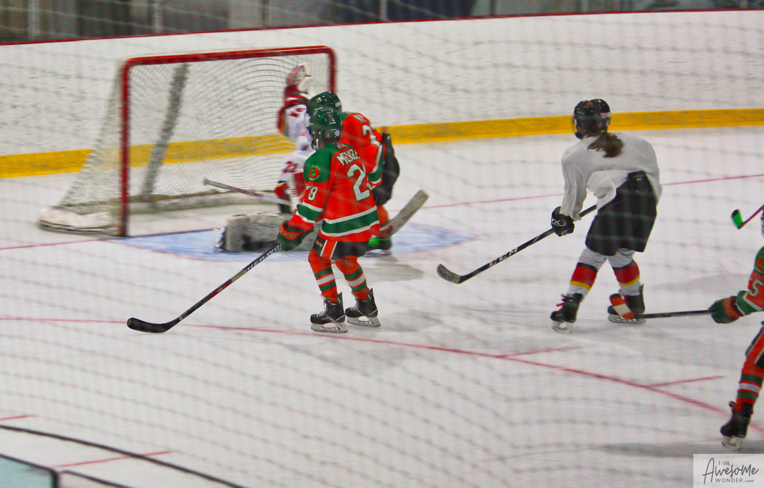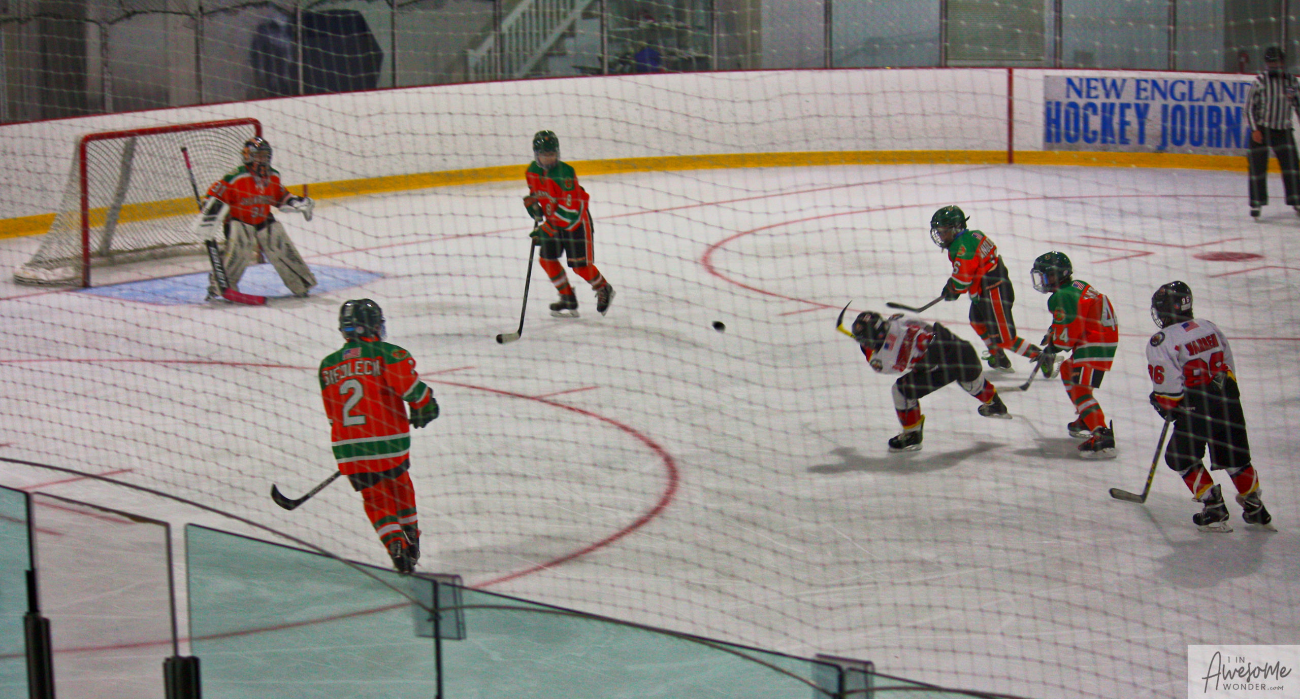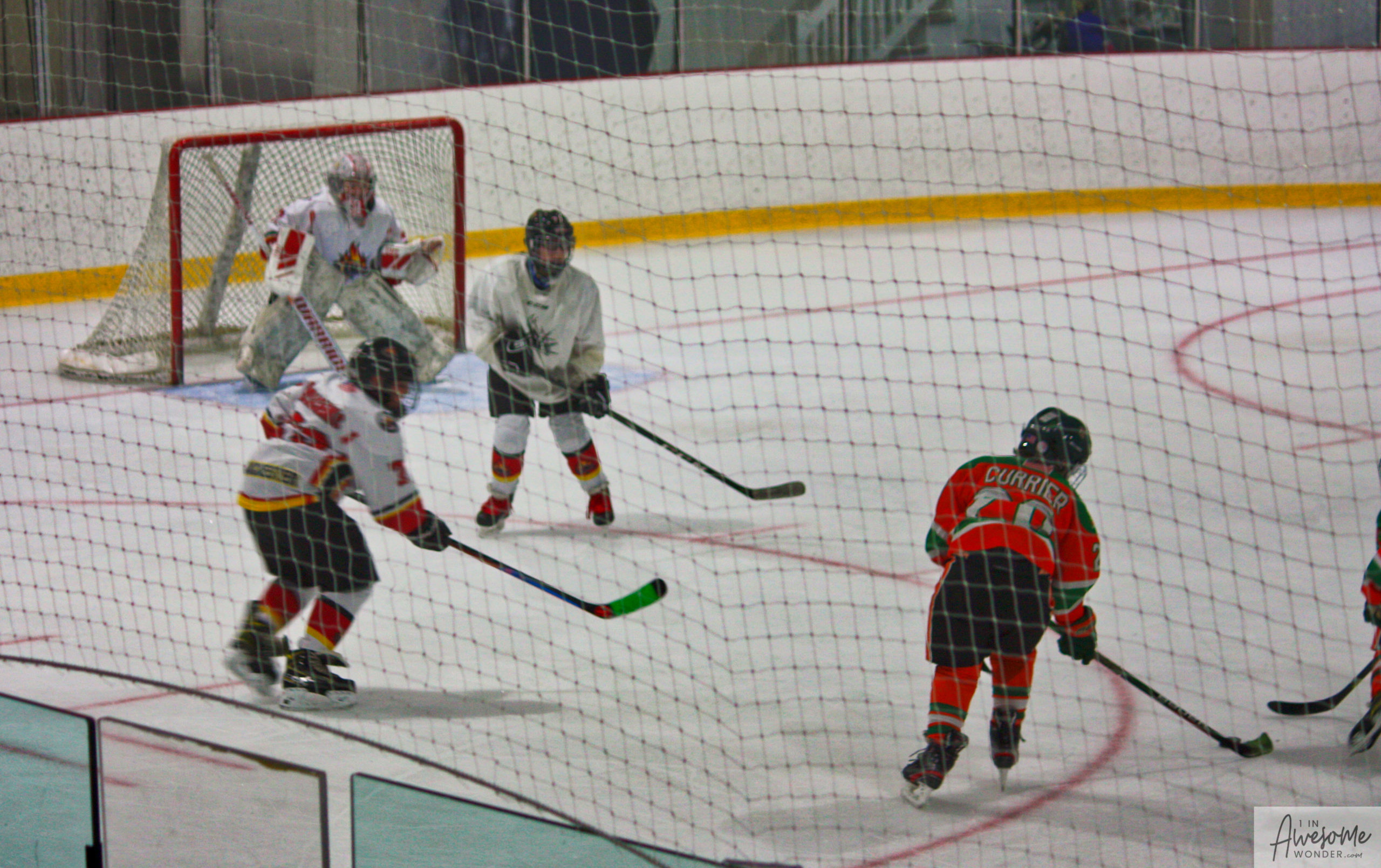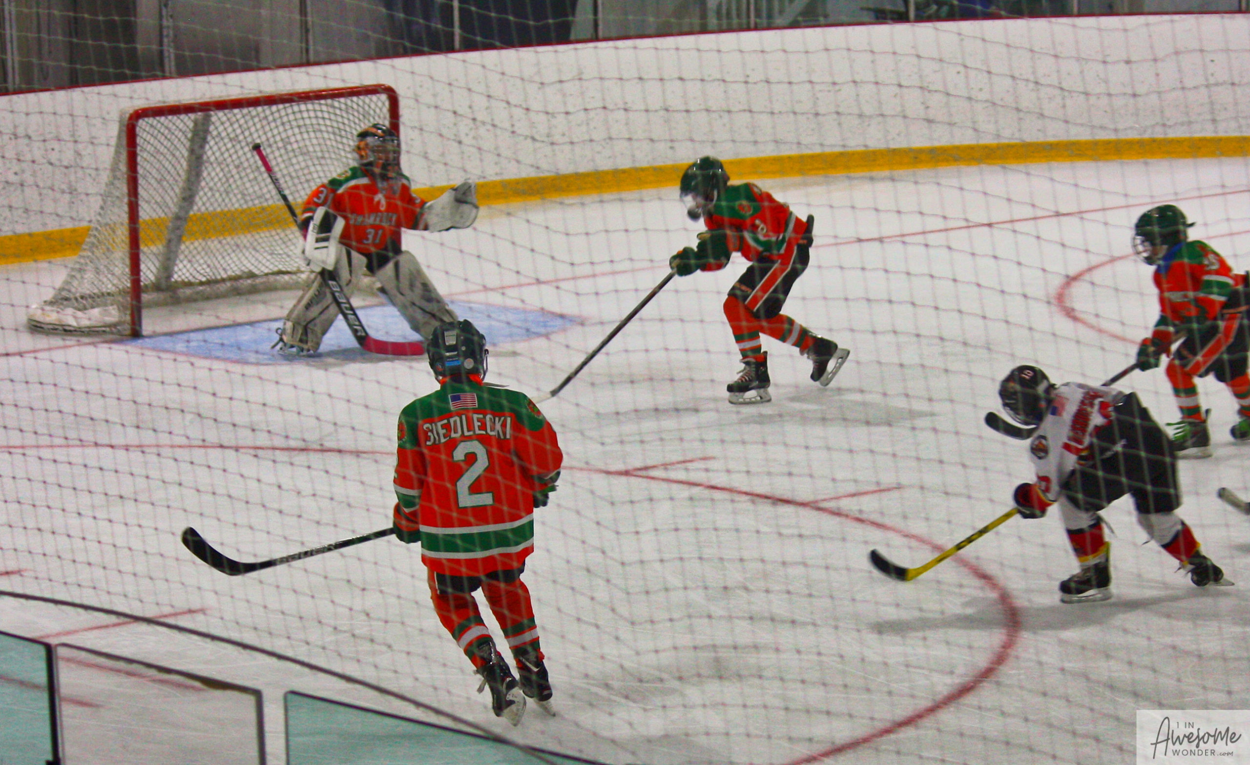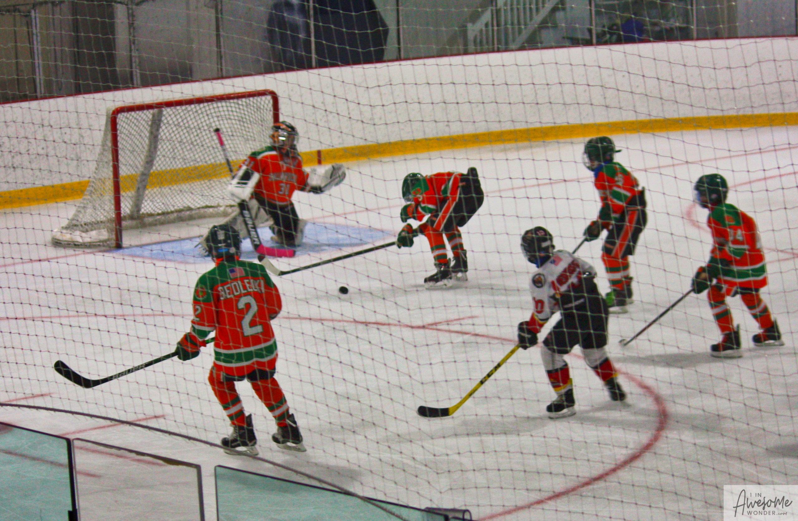 After a few rounds of the new hit show “Guess This Week’s Scorekeeper”, the puck was dropped for another youth hockey game. As it turned out, the game was excellent. Both teams competed hard, and neither one gave an inch. It was an intense game with lots of chances for both teams. Overall, the Flames had the better of the play, but the outcome was in question right into the final seconds of the game. I will tell more of the story in the pictures below, but before I do, I want to recognize the goaltender for the Shamrocks who made some huge saves throughout the game. I will get to the Flames goalie in a little bit.