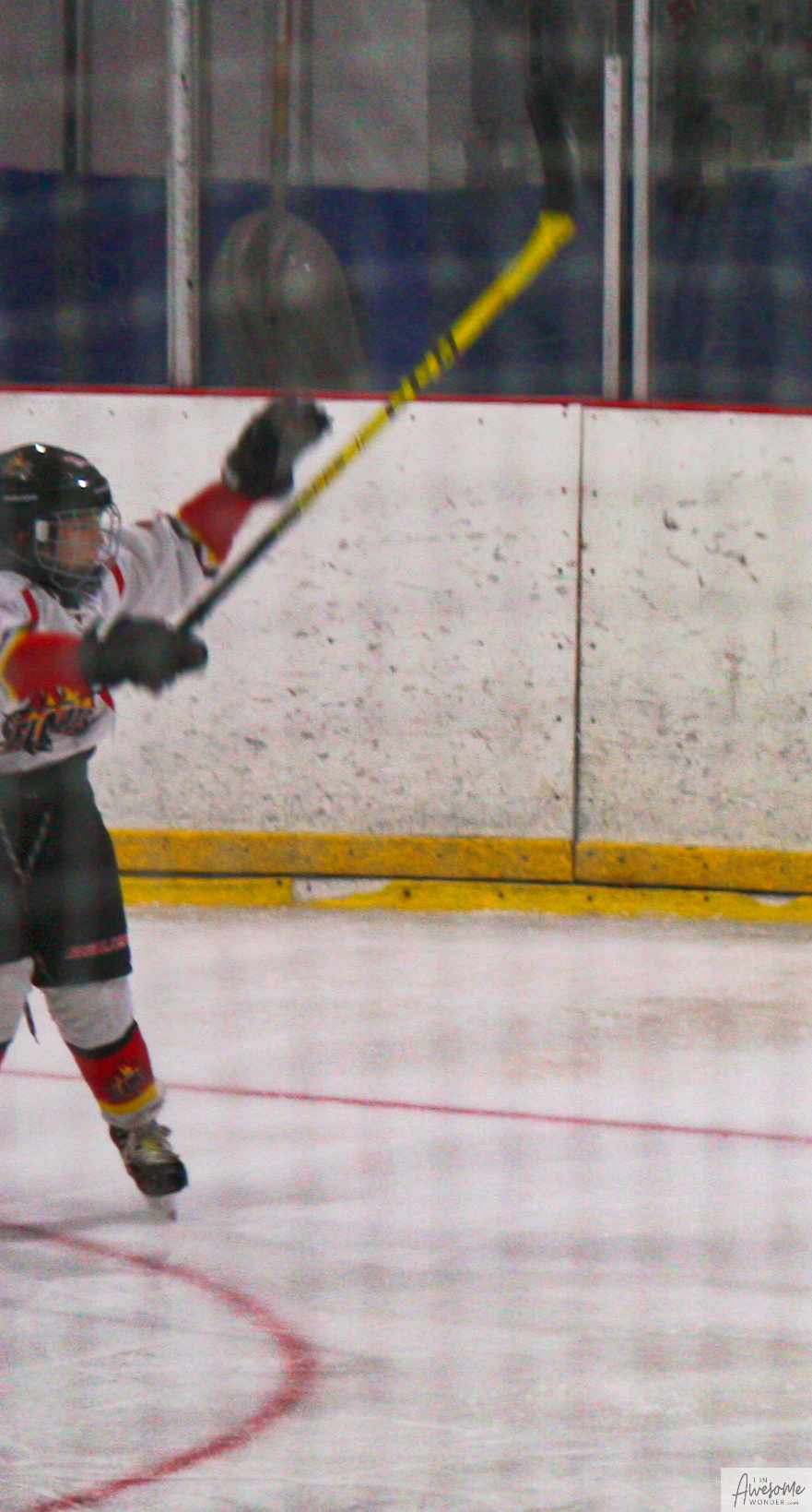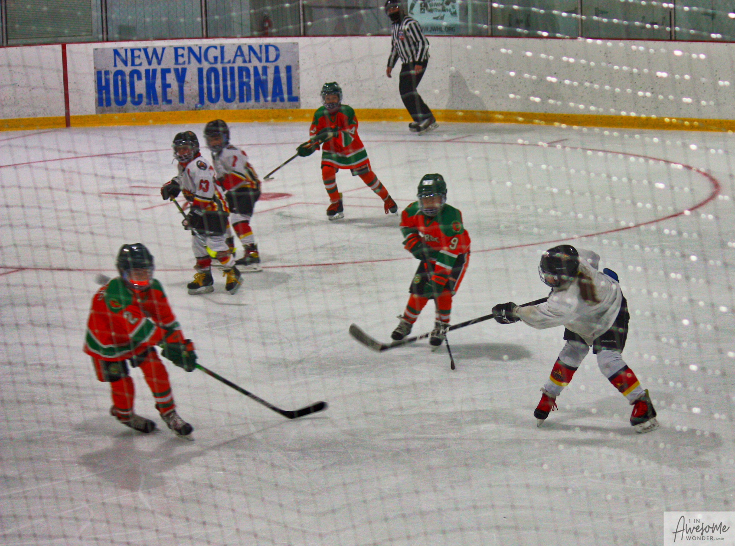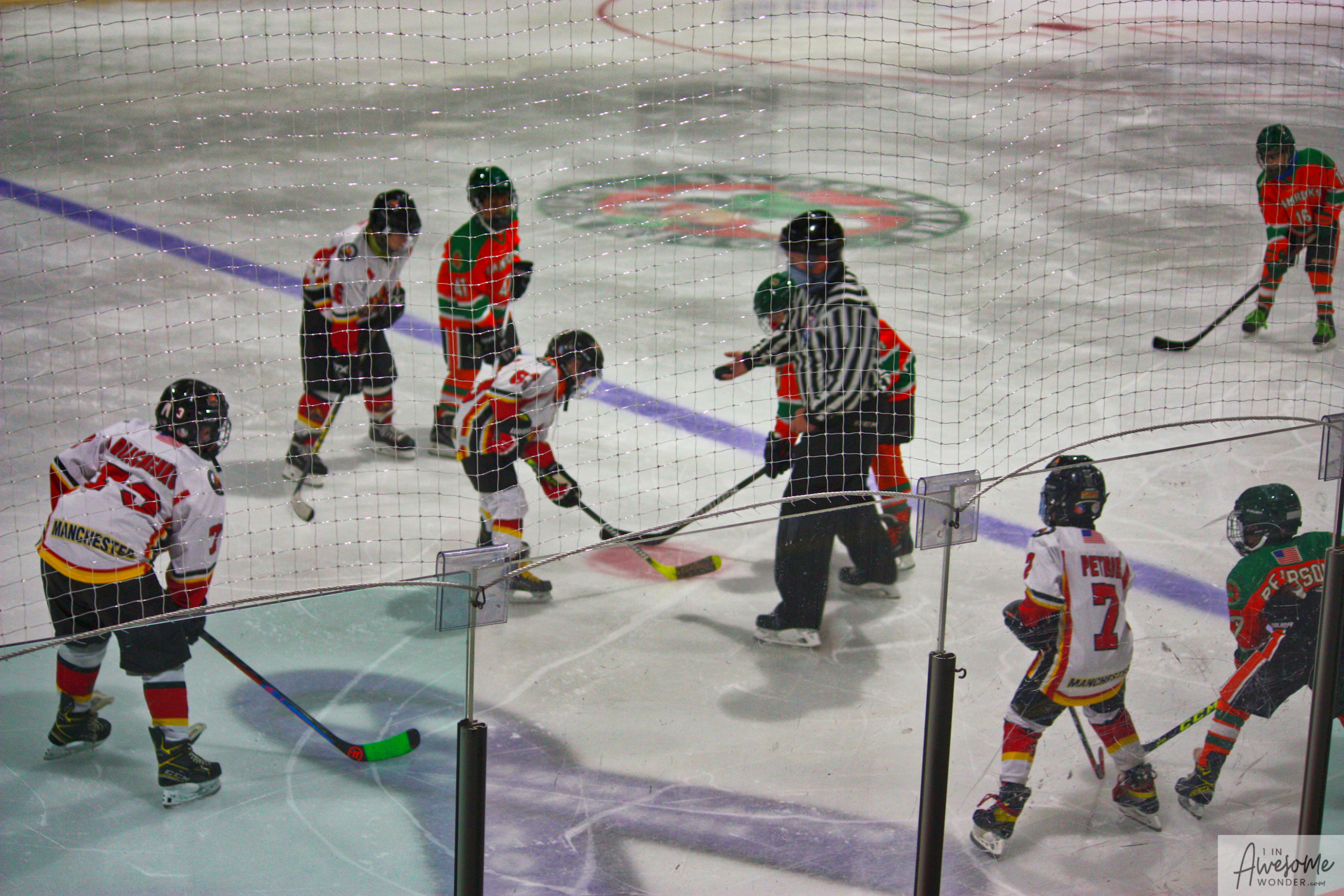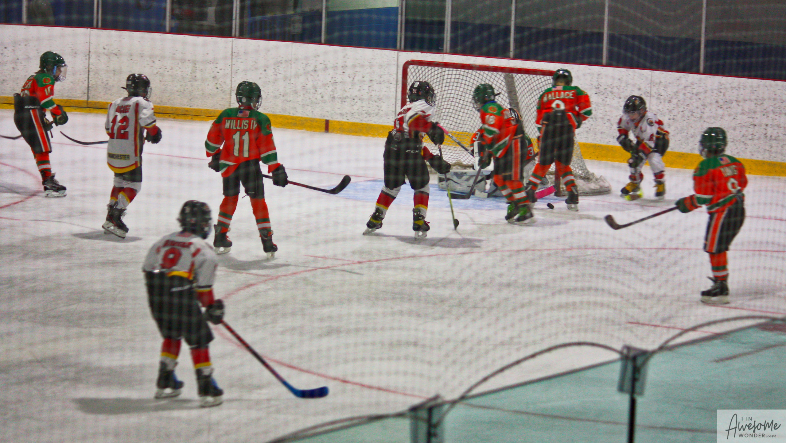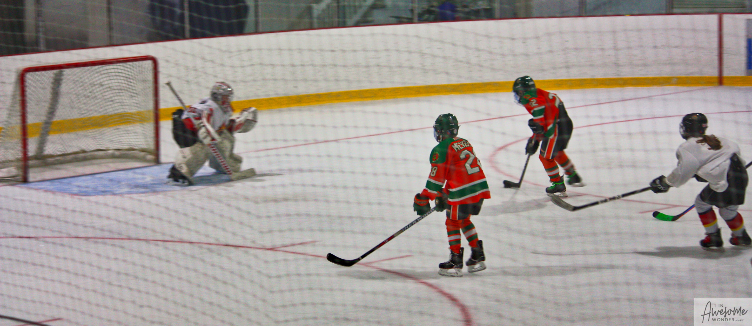 After a few rounds of the new hit show “Guess This Week’s Scorekeeper”, the puck was dropped for another youth hockey game. As it turned out, the game was excellent. Both teams competed hard, and neither one gave an inch. It was an intense game with lots of chances for both teams. Overall, the Flames had the better of the play, but the outcome was in question right into the final seconds of the game. I will tell more of the story in the pictures below, but before I do, I want to recognize the goaltender for the Shamrocks who made some huge saves throughout the game. I will get to the Flames goalie in a little bit.