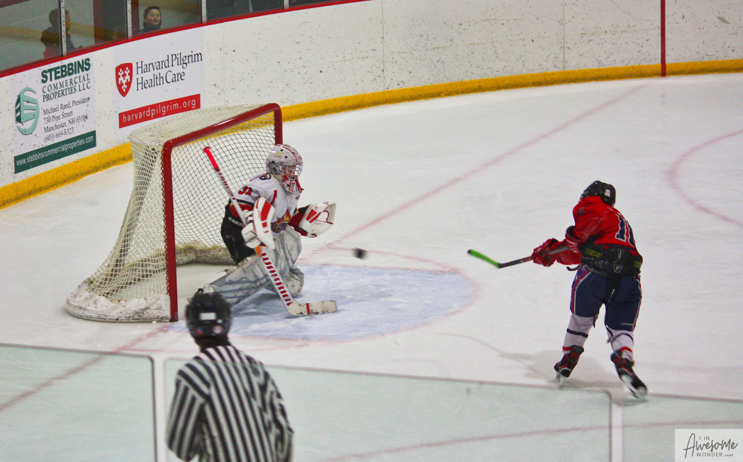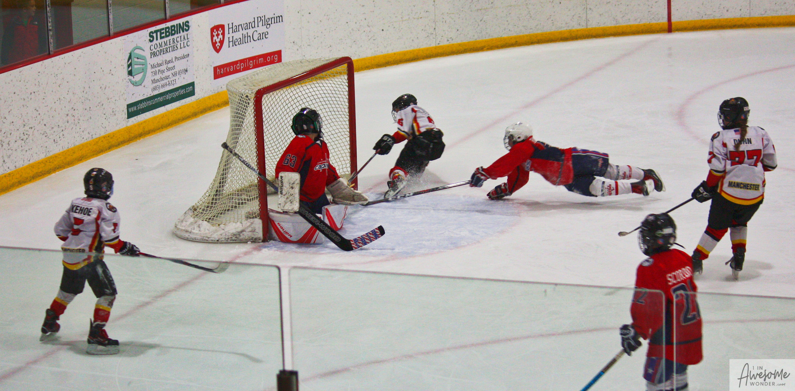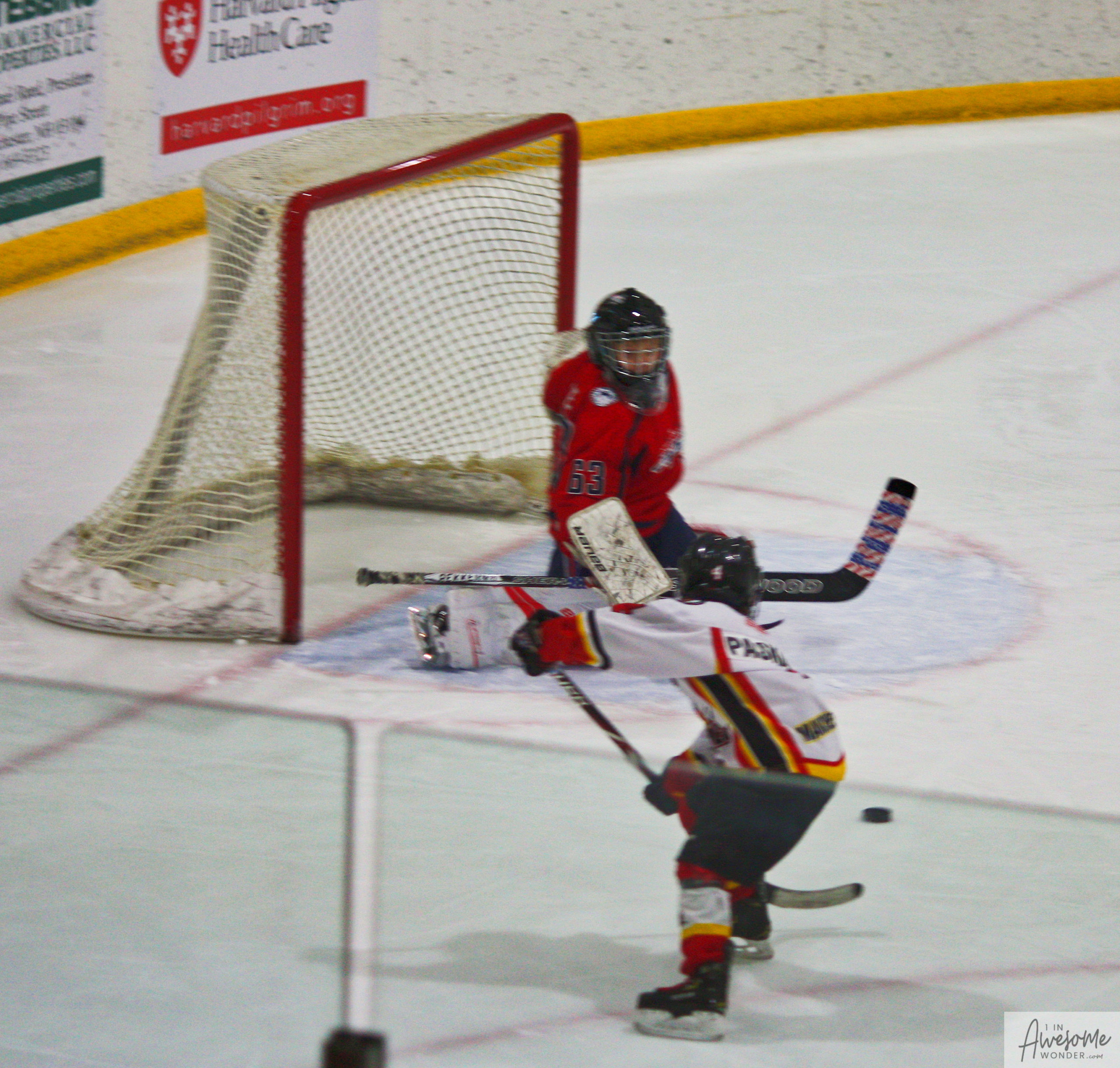 Teddy’s stick and the puck are in the net. The Concord player lays out to defend.