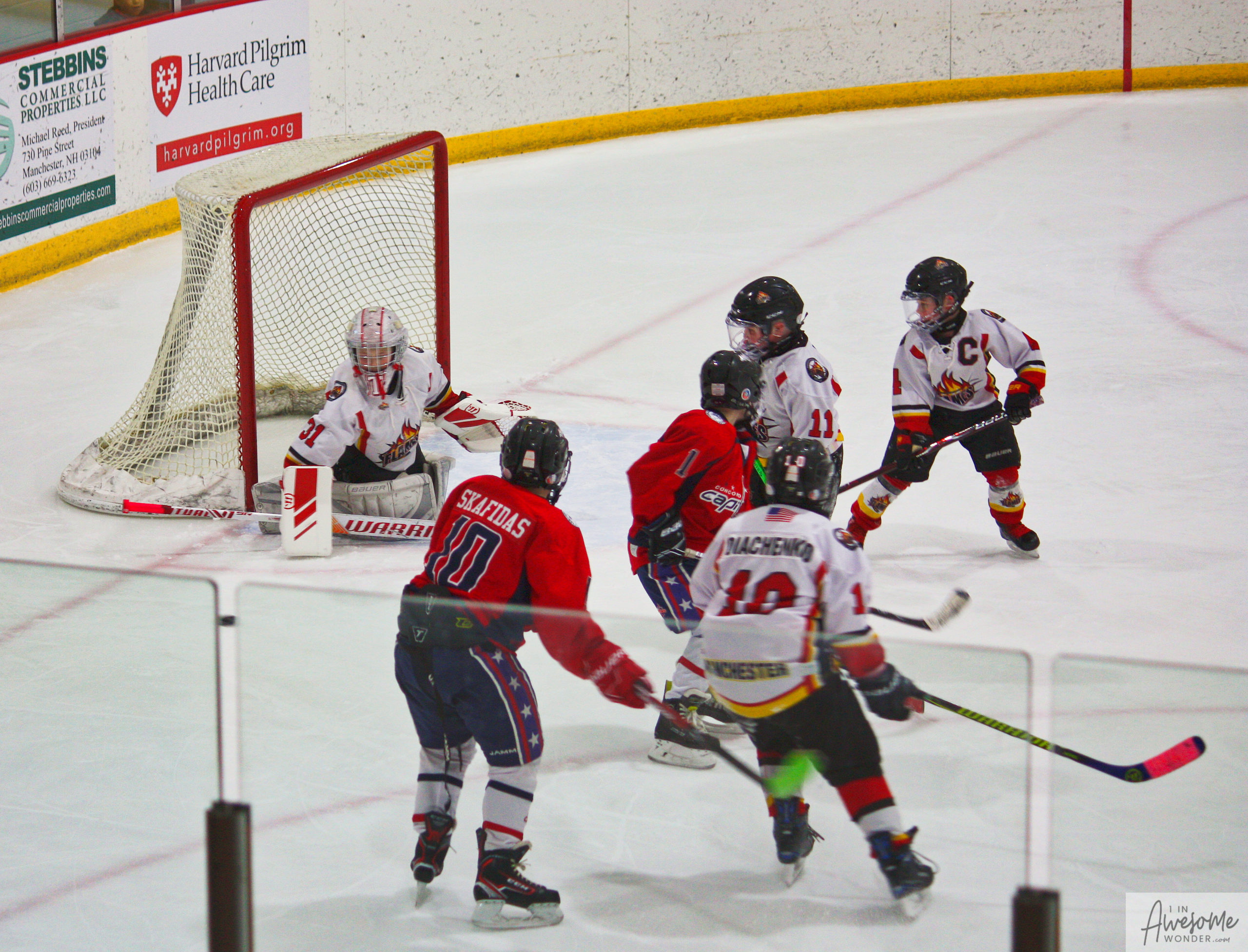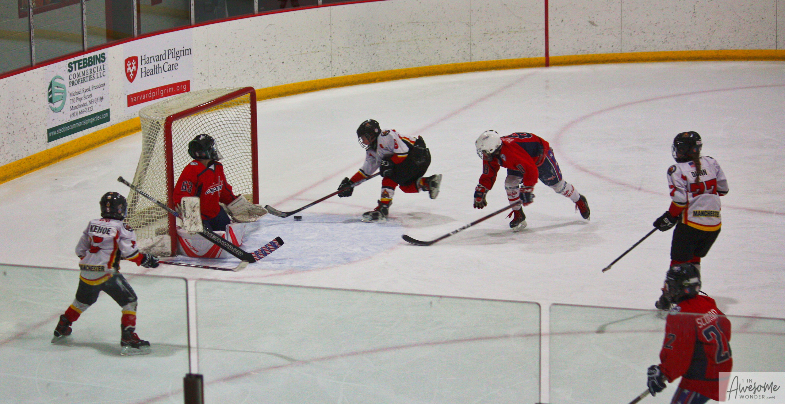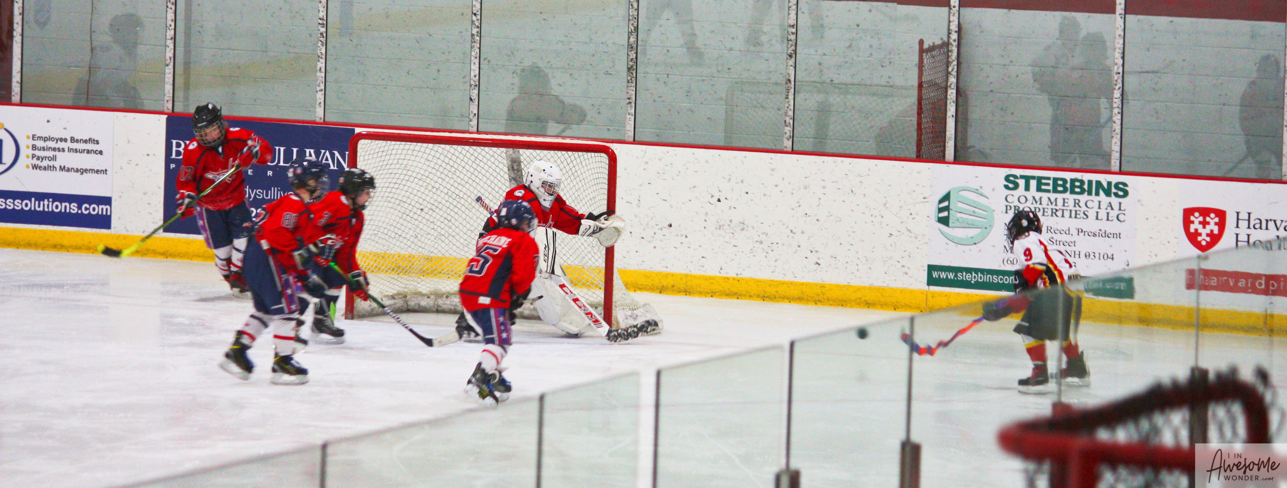 Teddy’s stick and the puck are in the net. The Concord player lays out to defend.