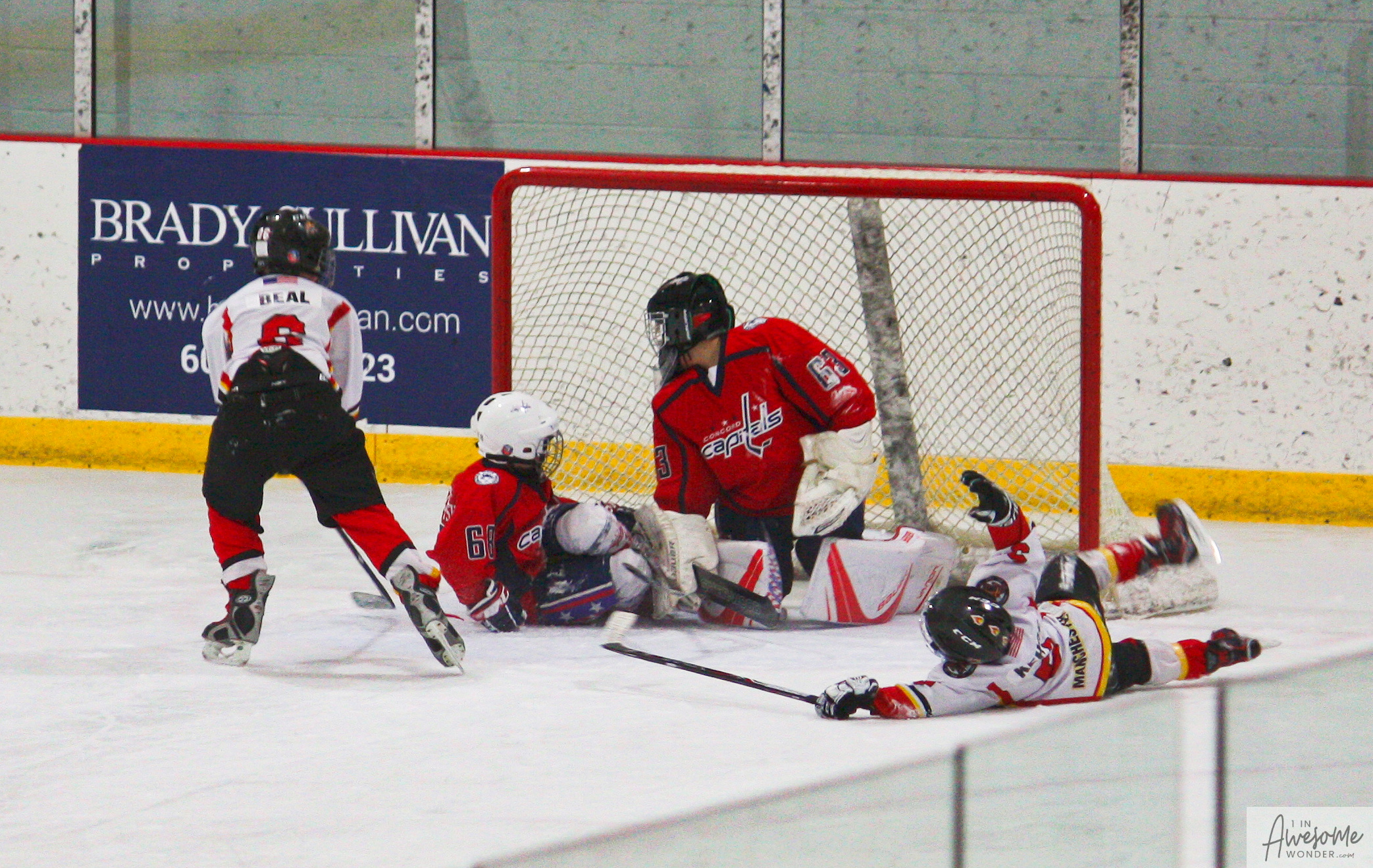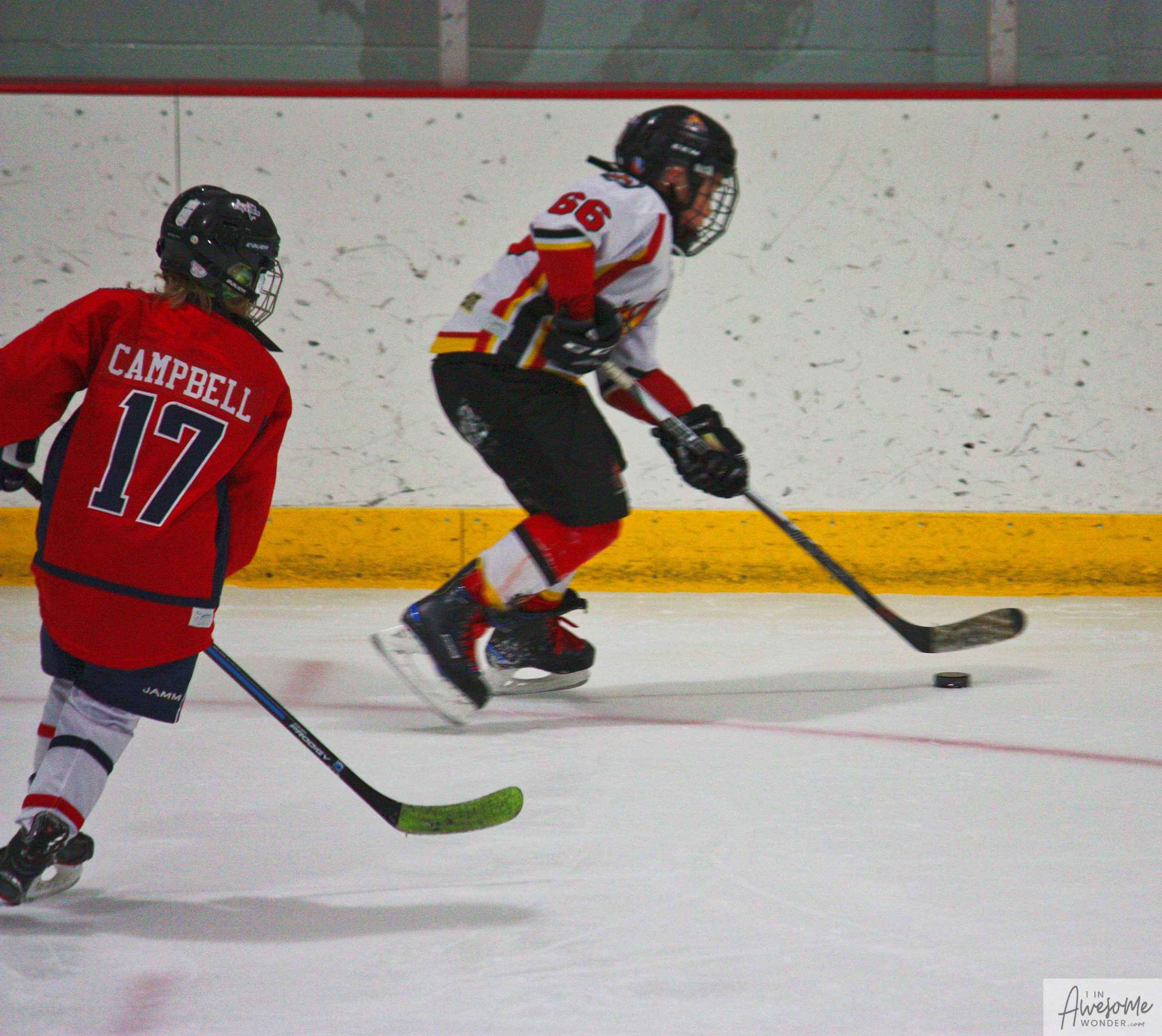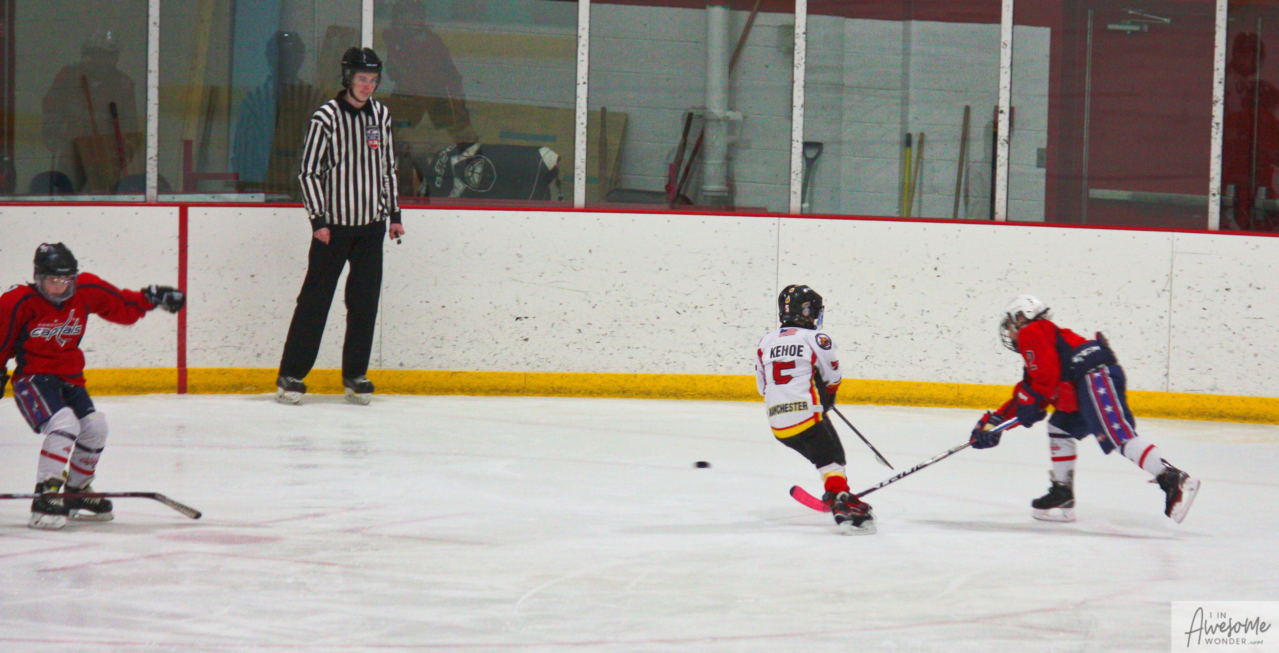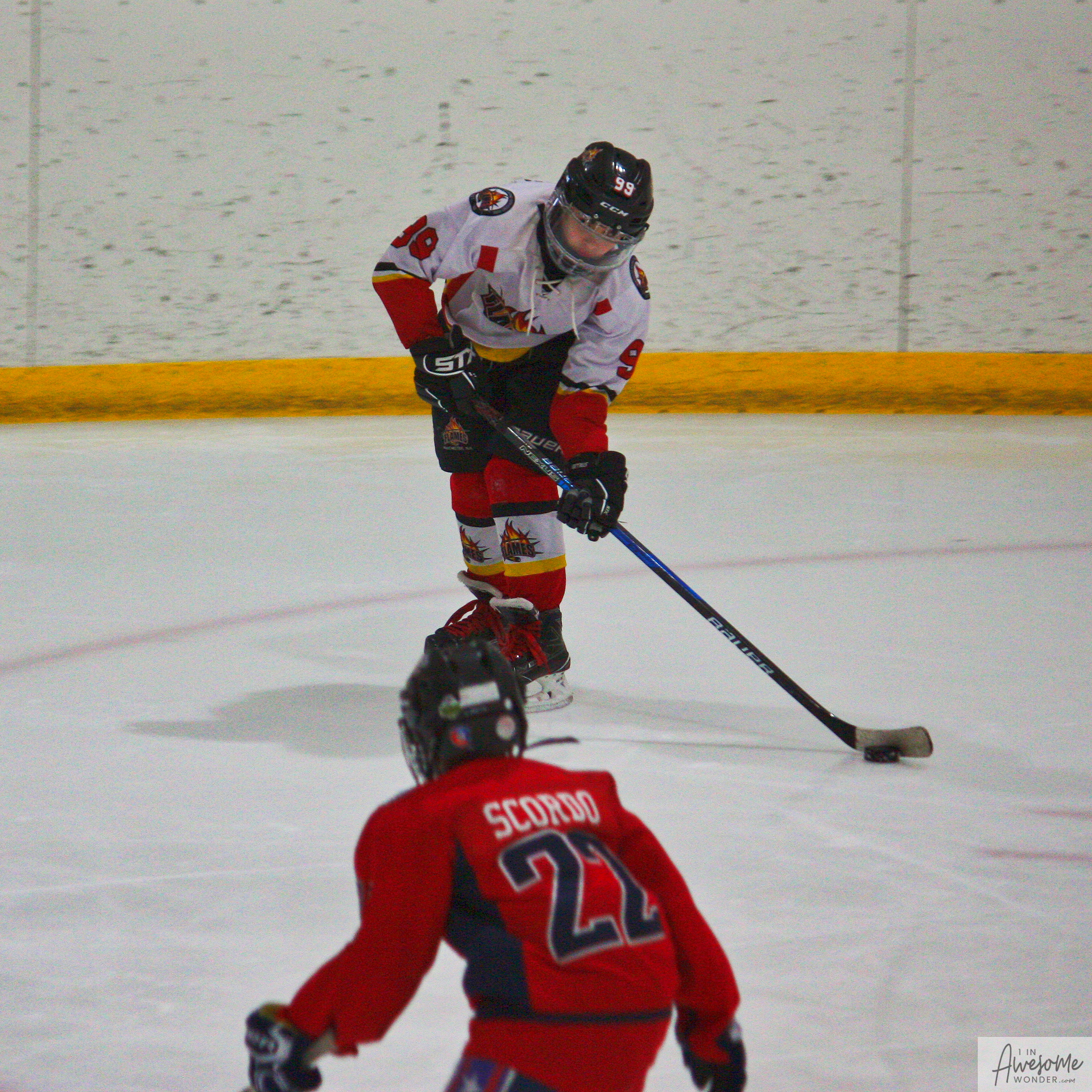 Colby shoots a puck toward the net. While Finley thinks, “Colby, why do you make it look like that hurts?”