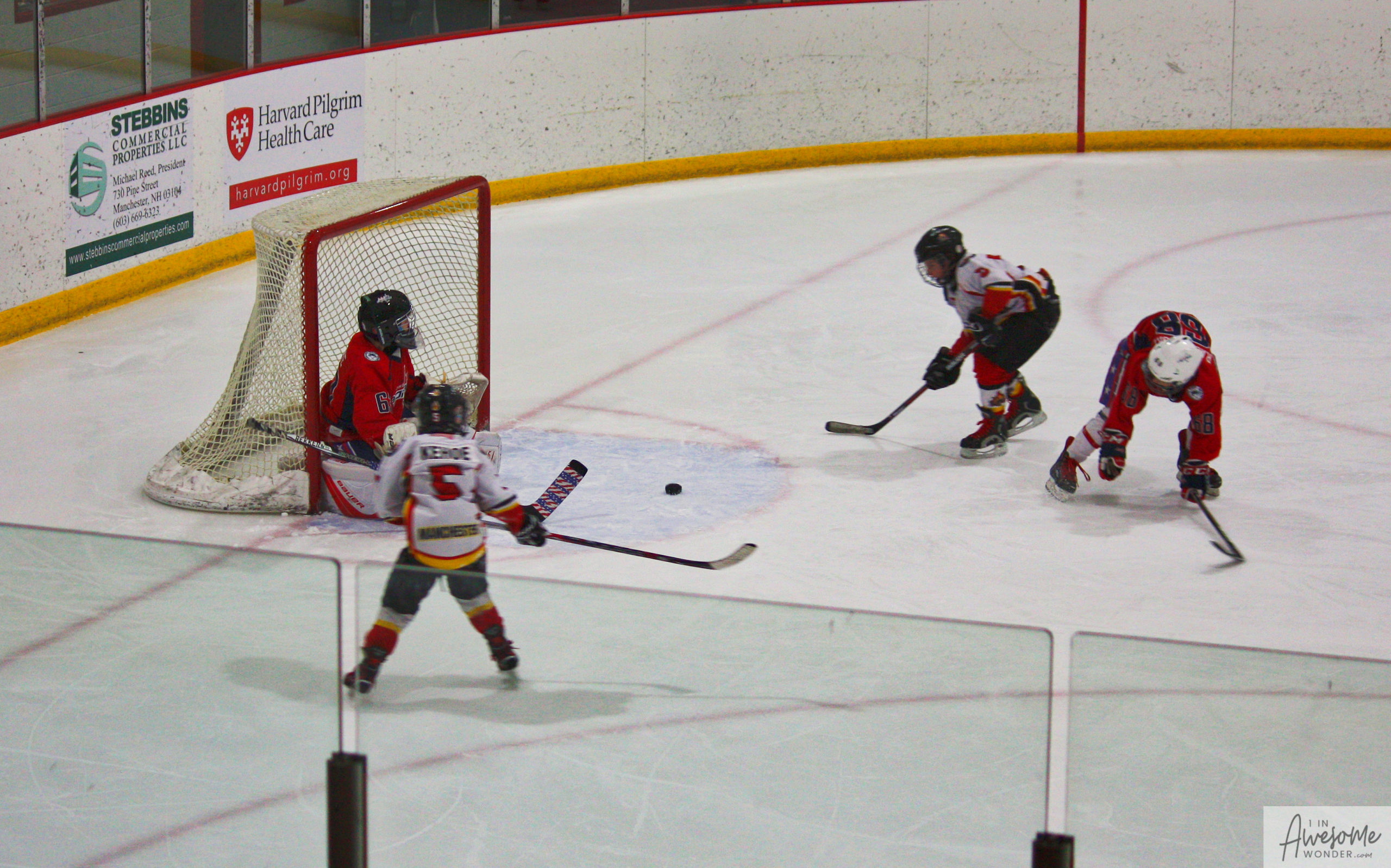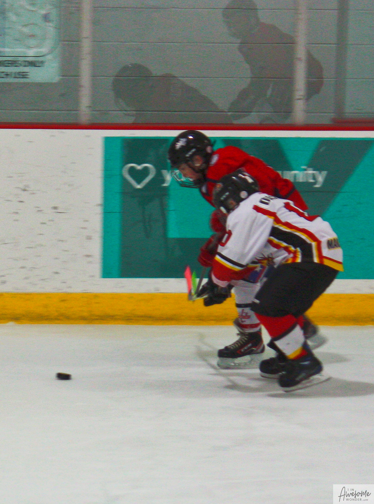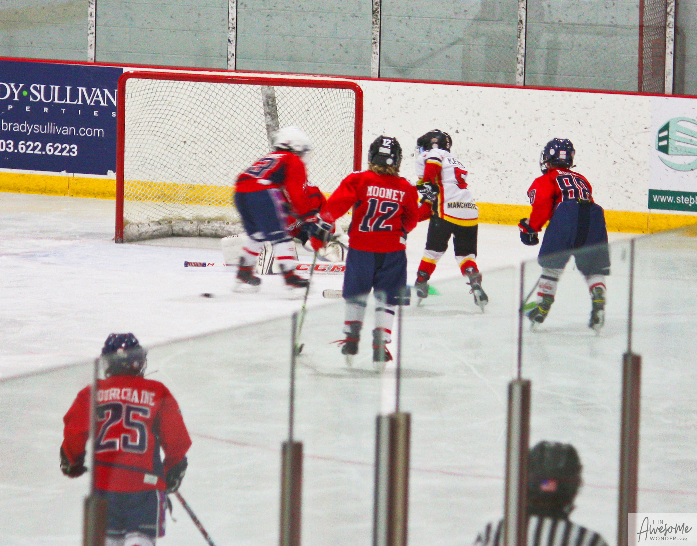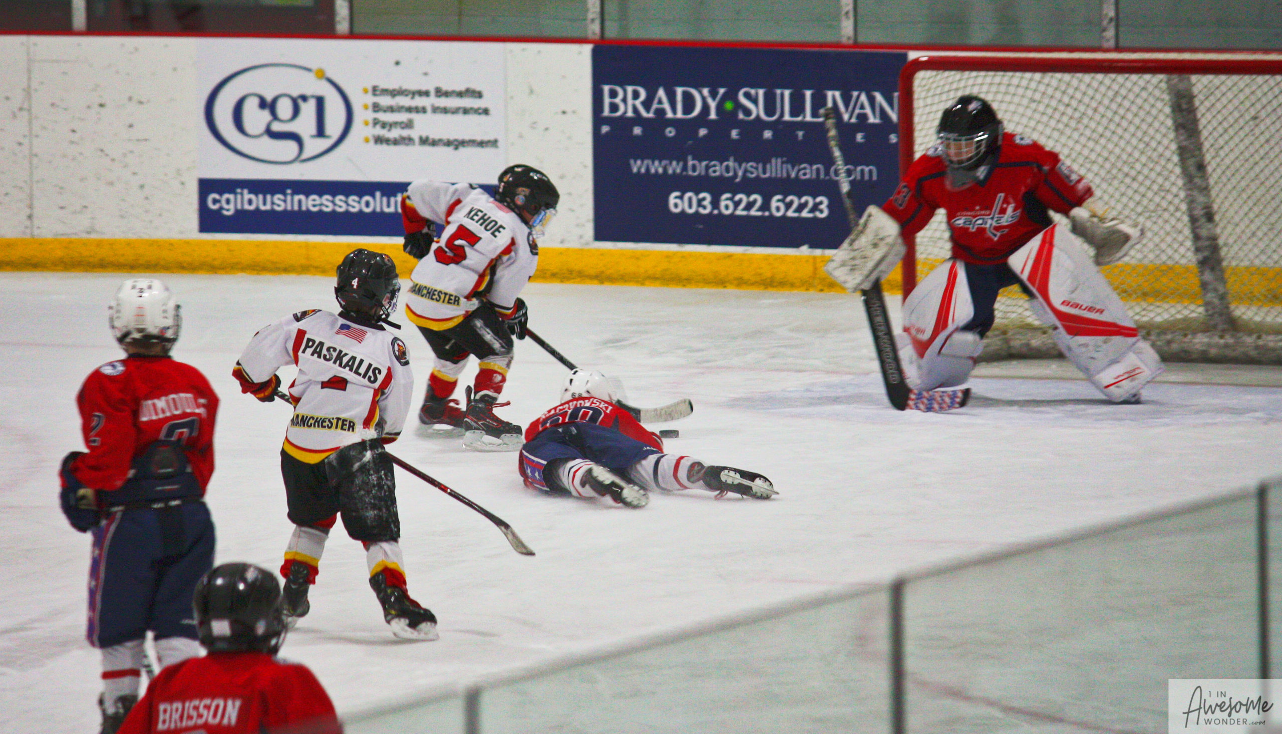 Colby shoots a puck toward the net. While Finley thinks, “Colby, why do you make it look like that hurts?”