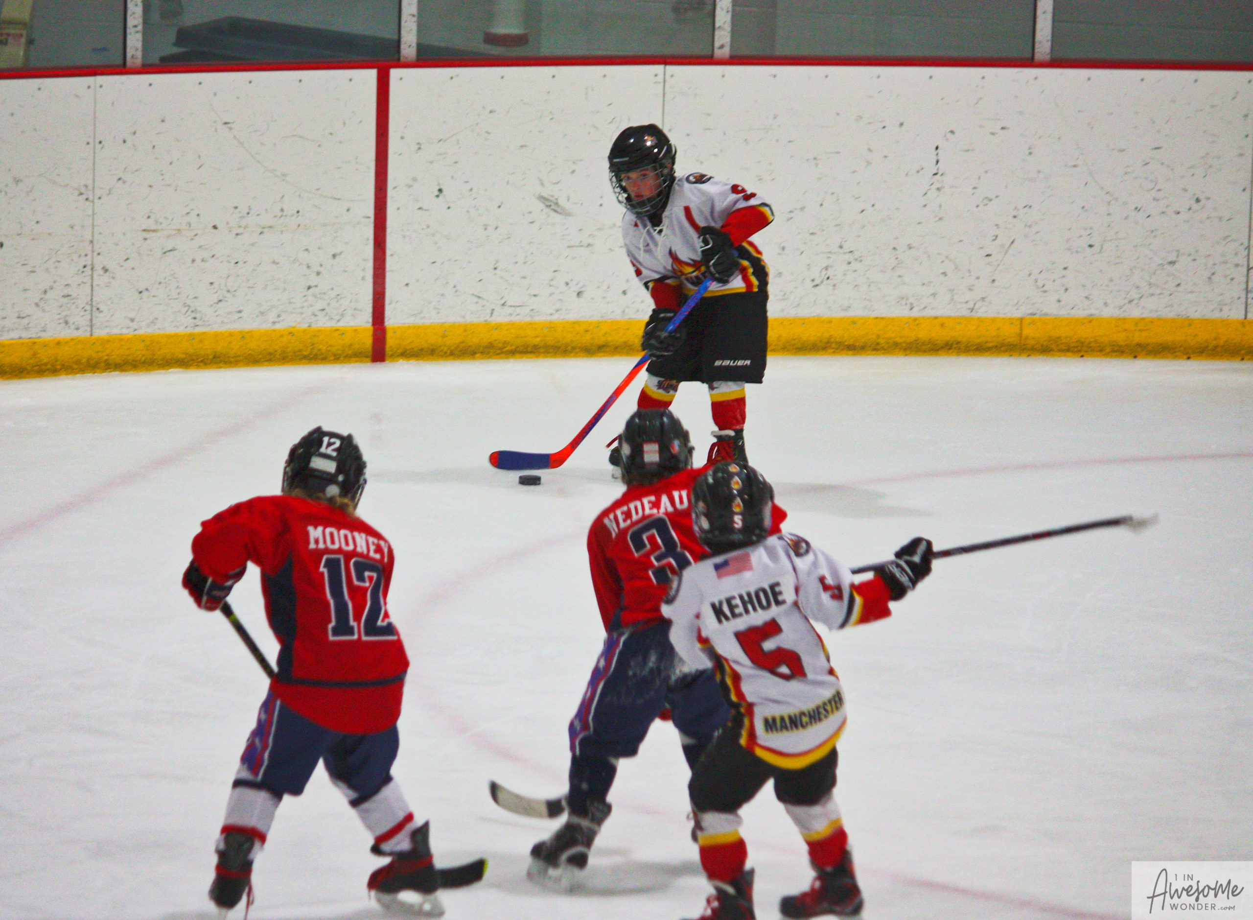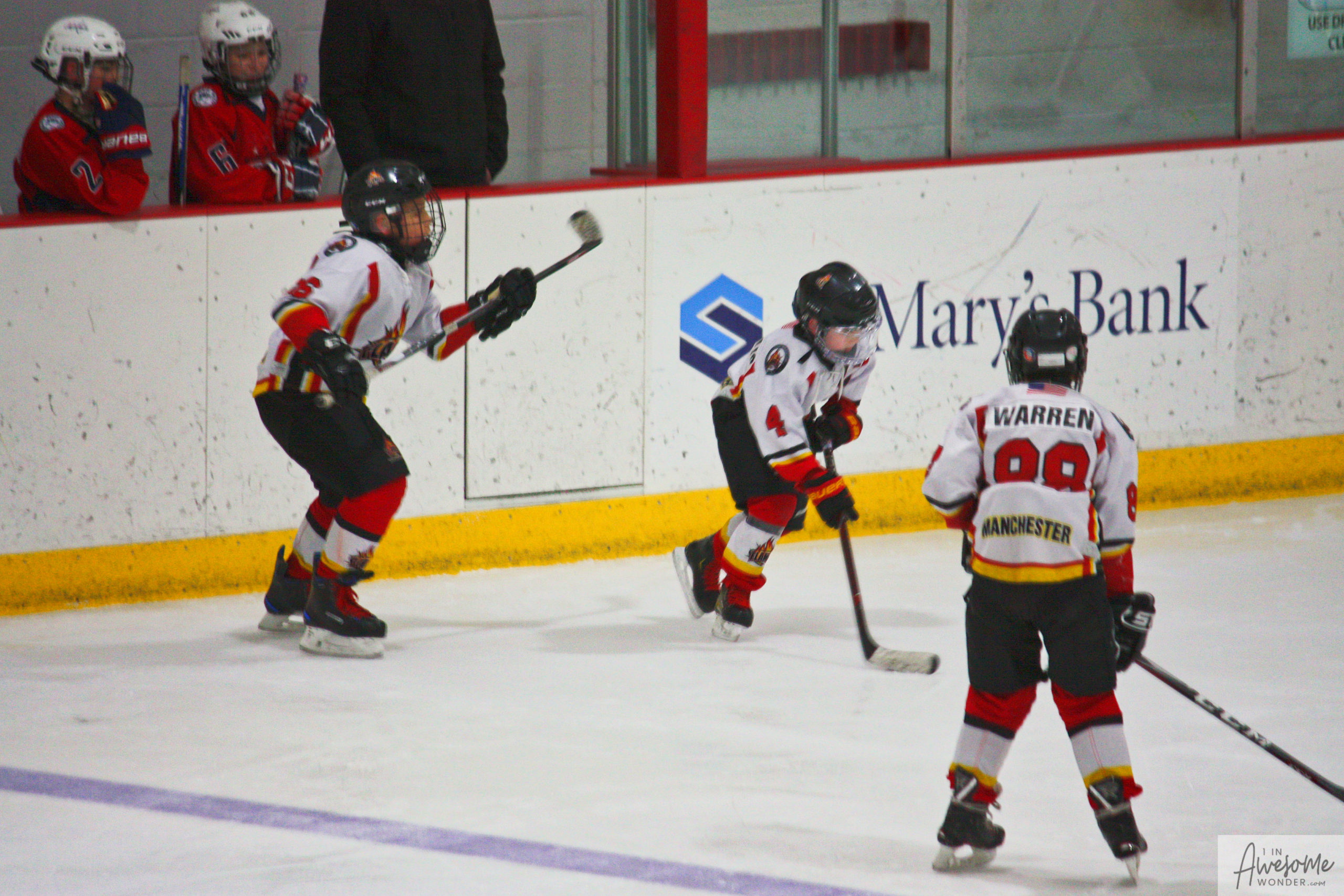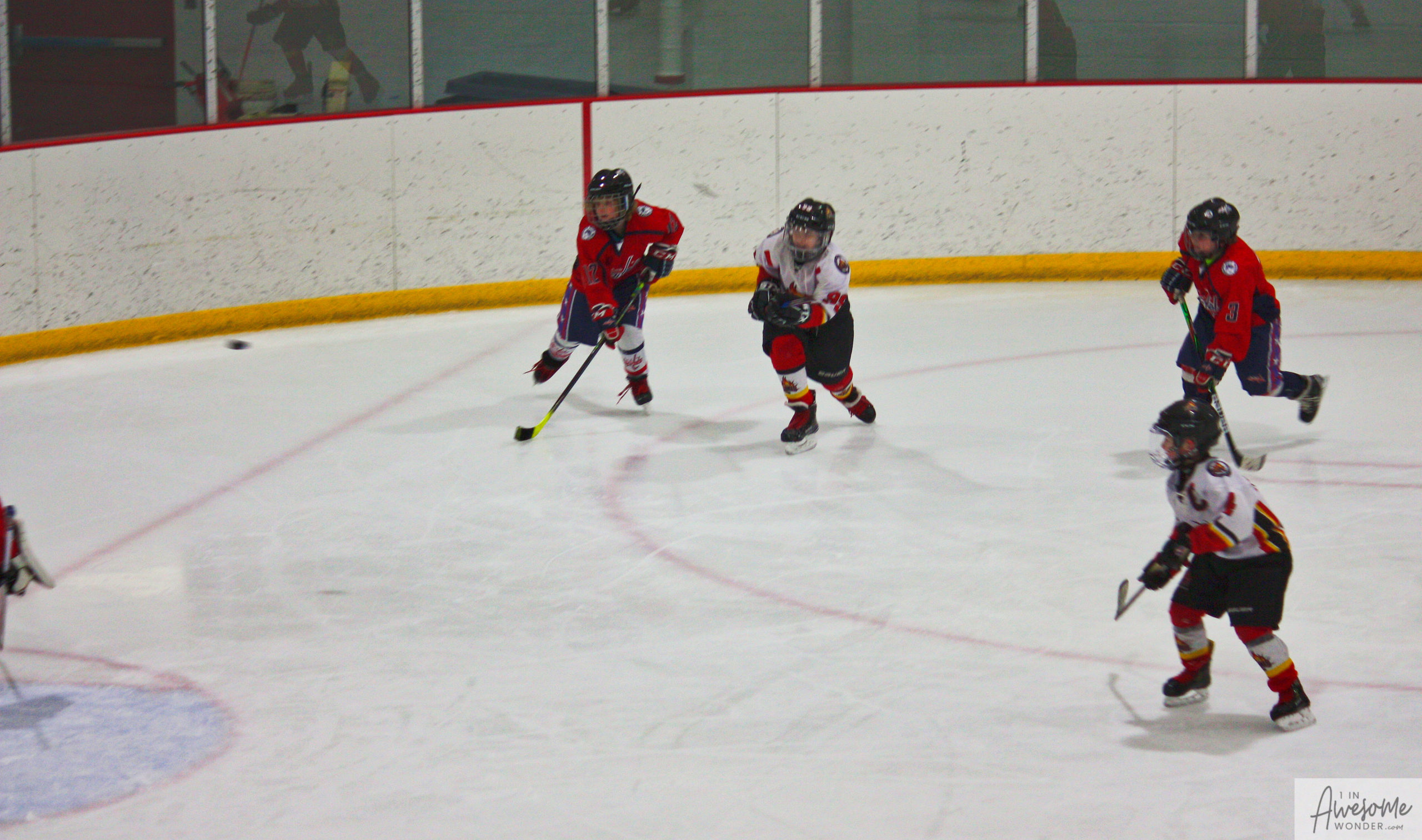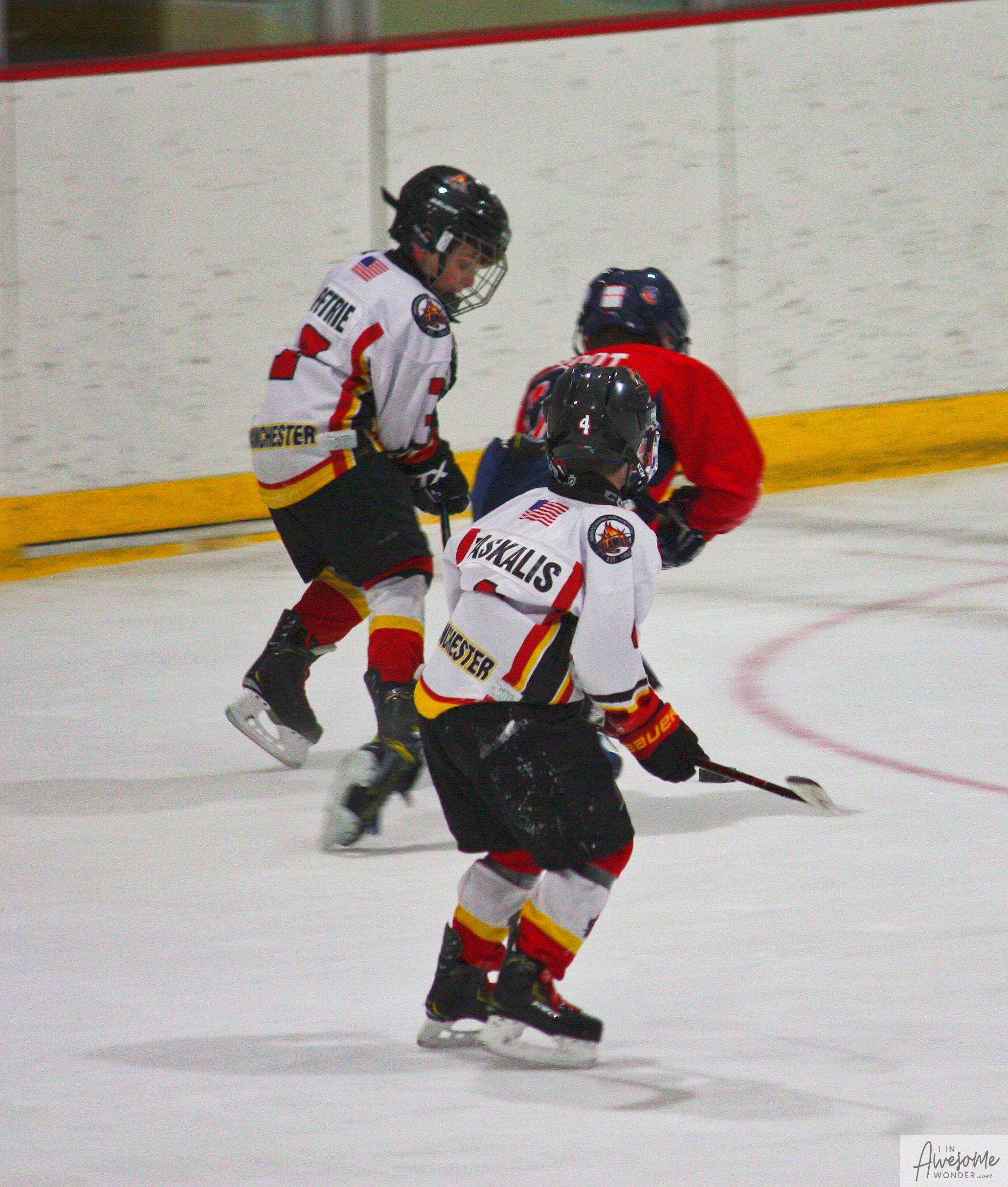Colby shoots a puck toward the net. While Finley thinks, “Colby, why do you make it look like that hurts?”
