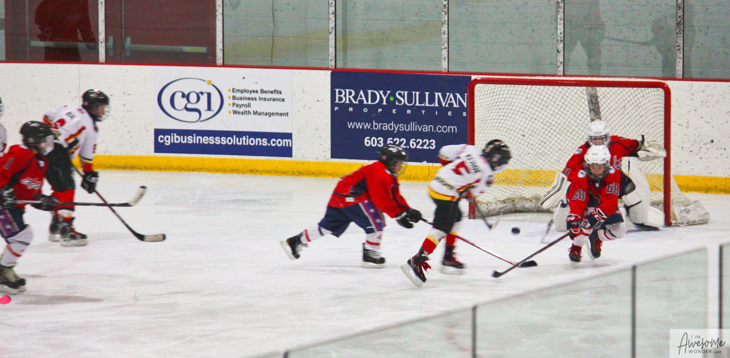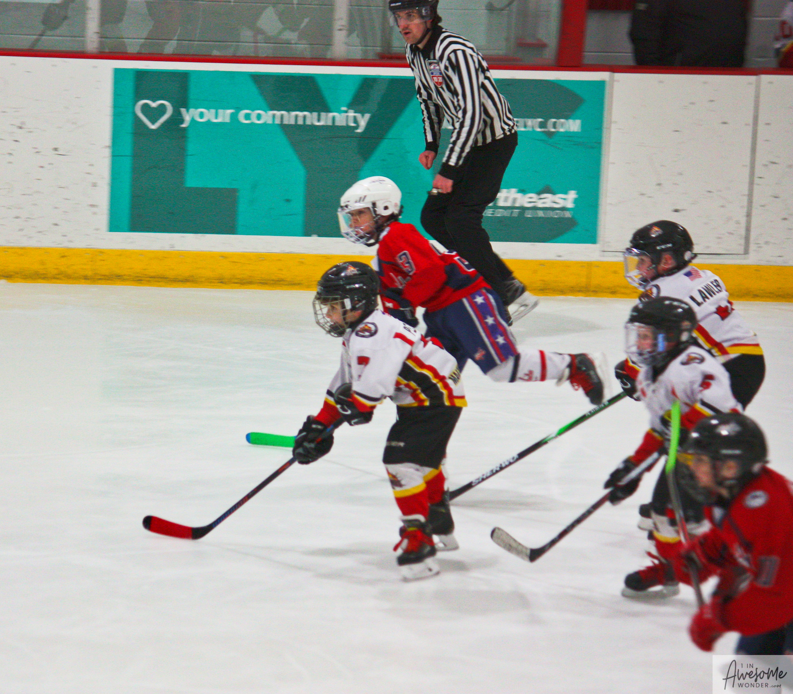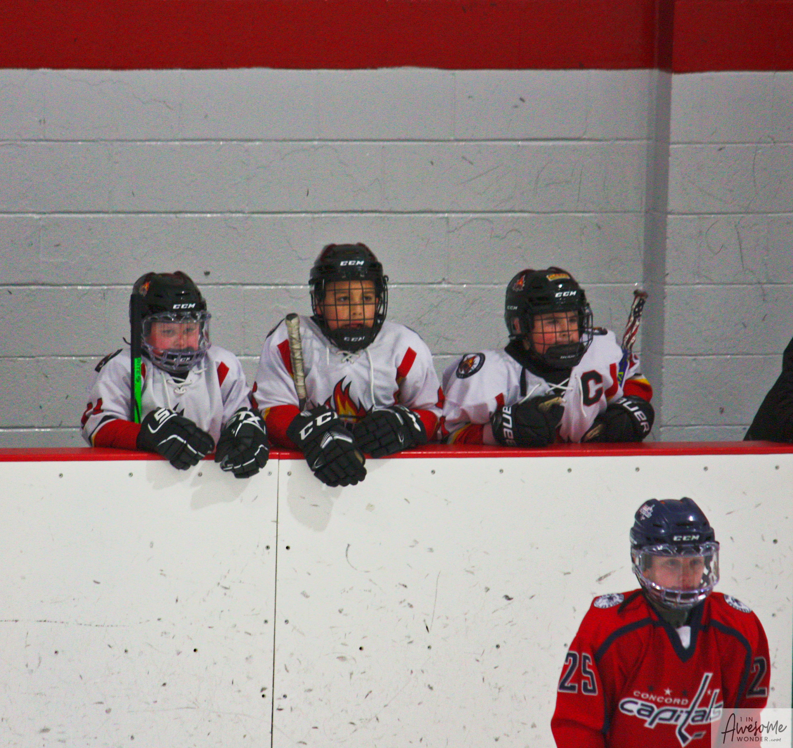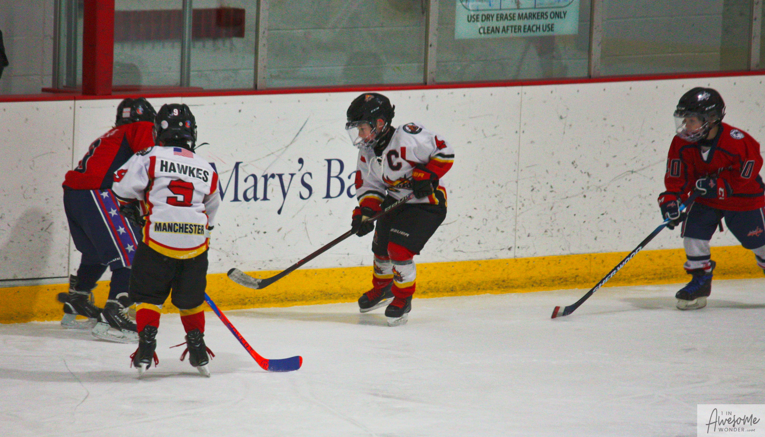 Colby shoots a puck toward the net. While Finley thinks, “Colby, why do you make it look like that hurts?”
