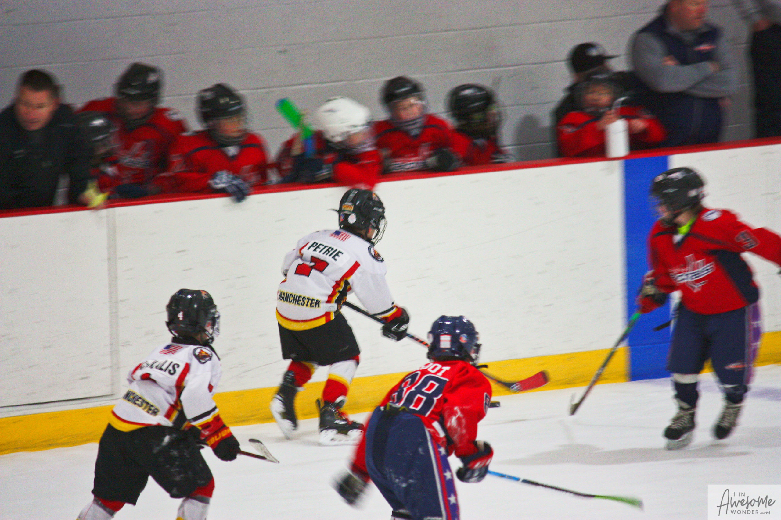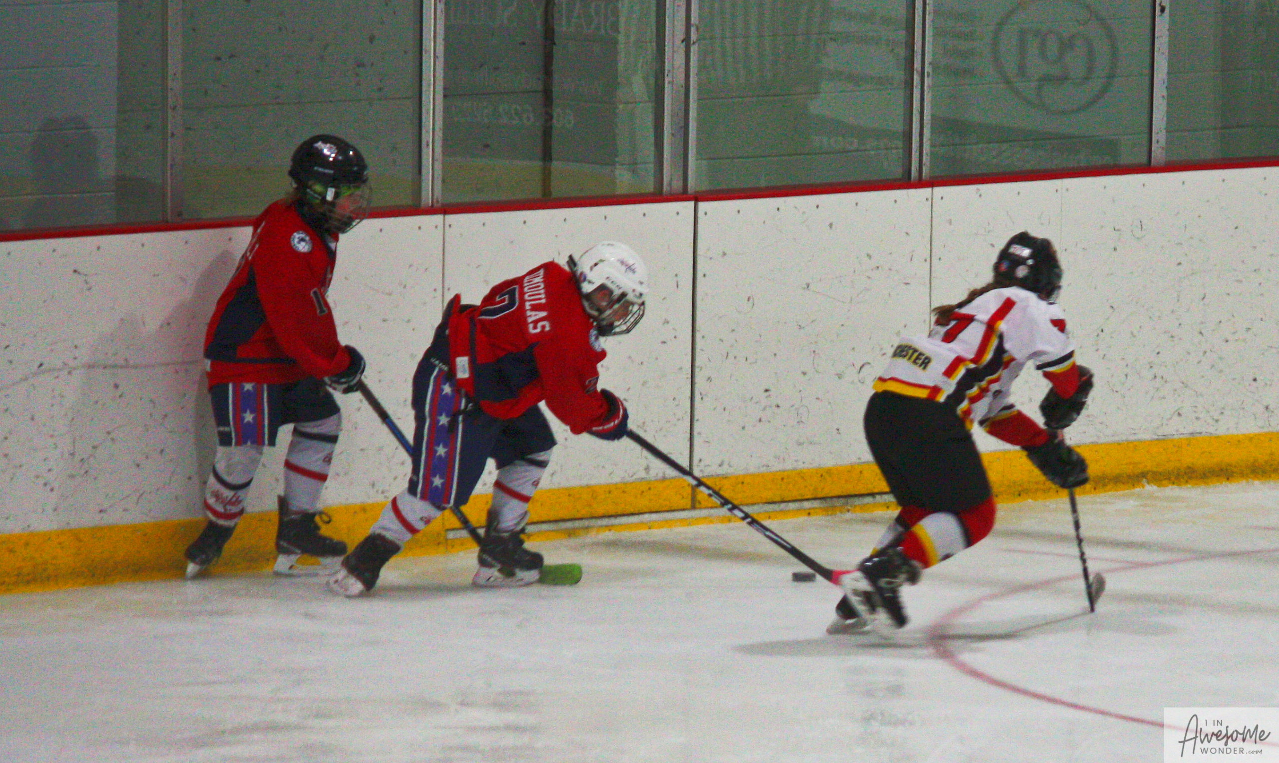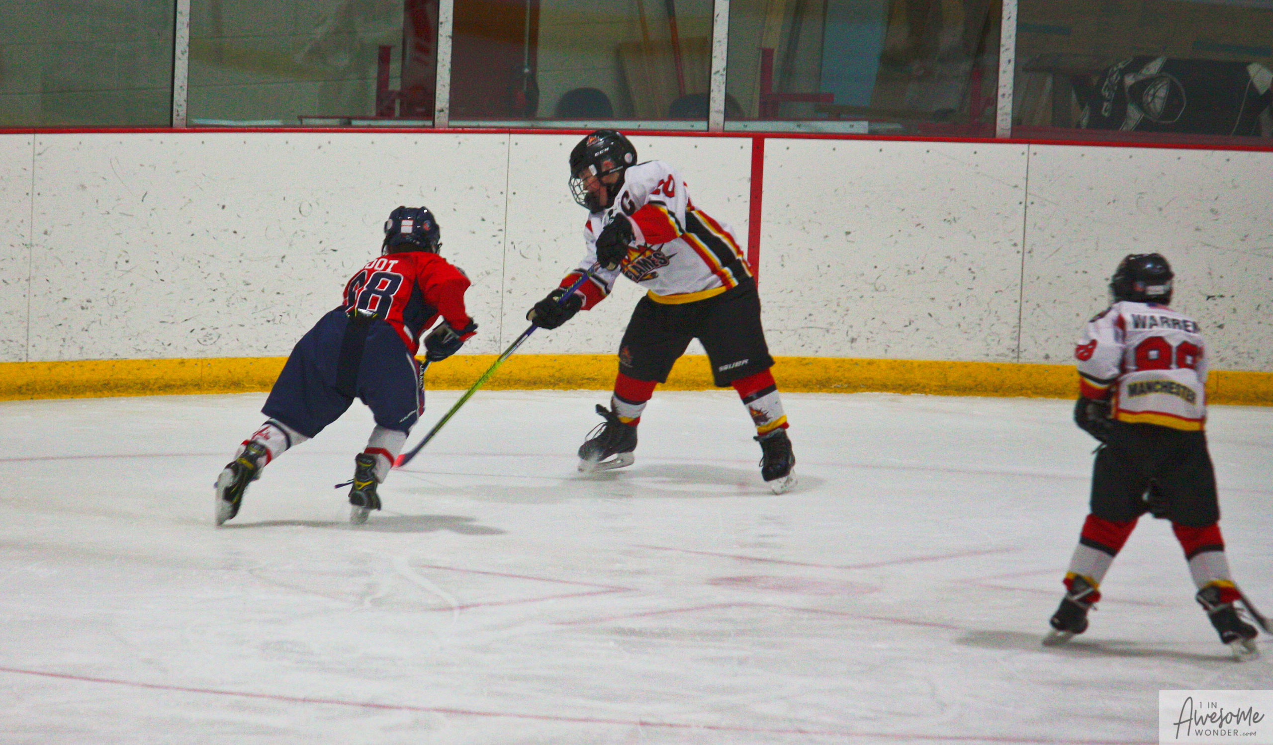 Austin hunts the puck while the Capitals player behind him almost completes the unthinkable, an end to end rush balancing a hockey stick perfectly on his skate boot.