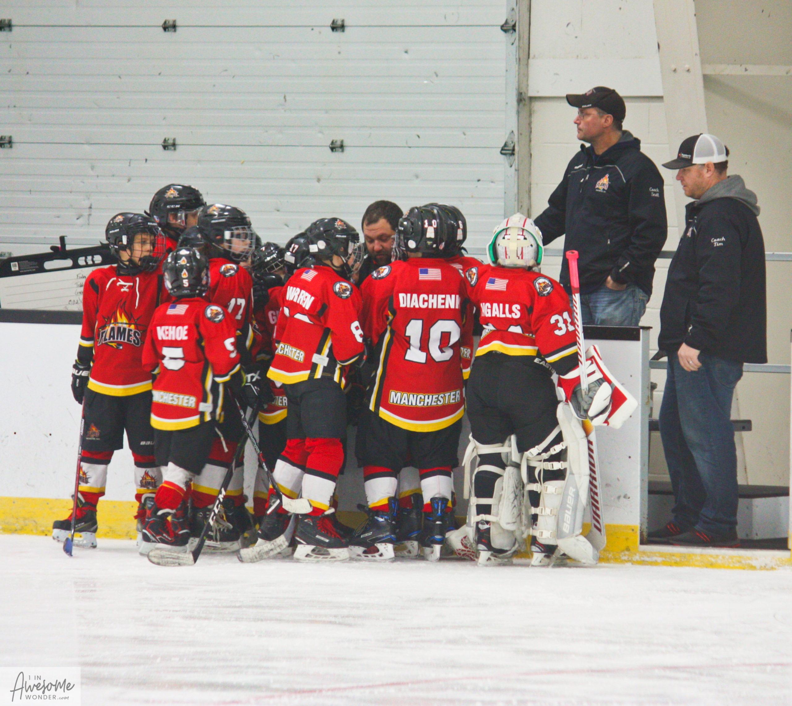The Flames get together in between periods.