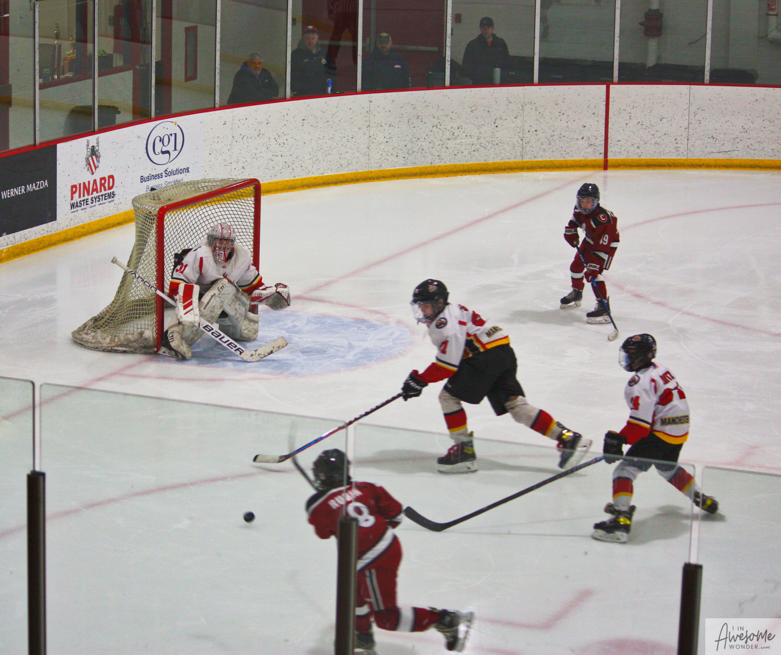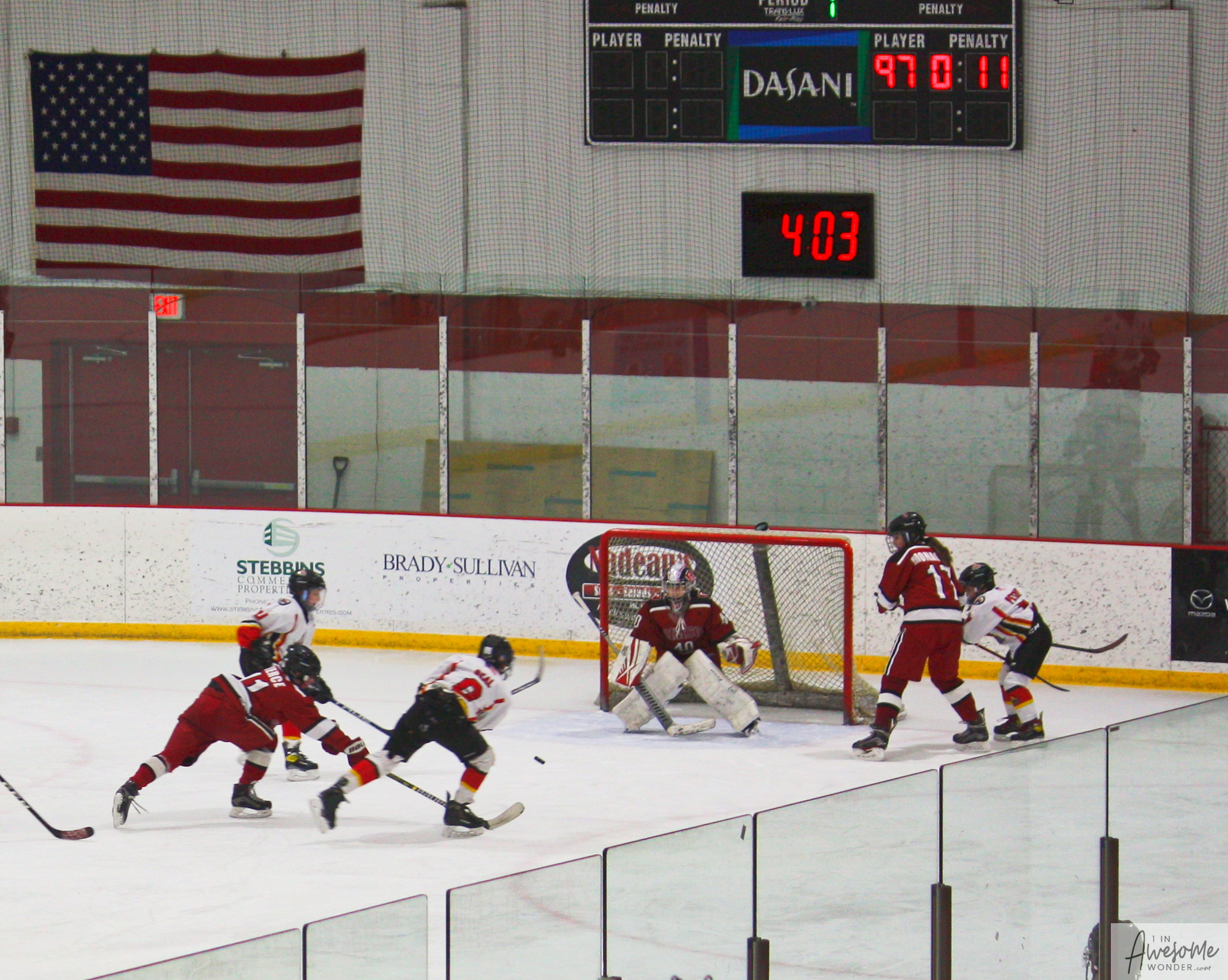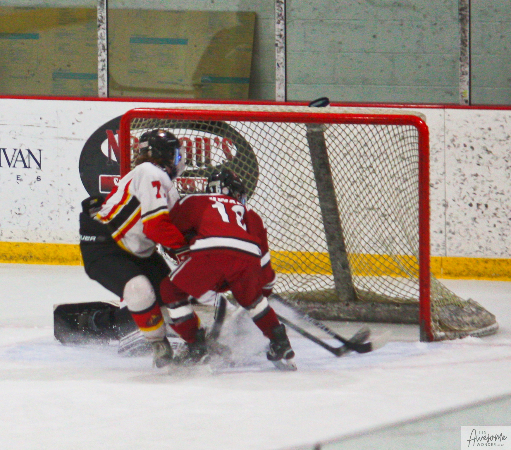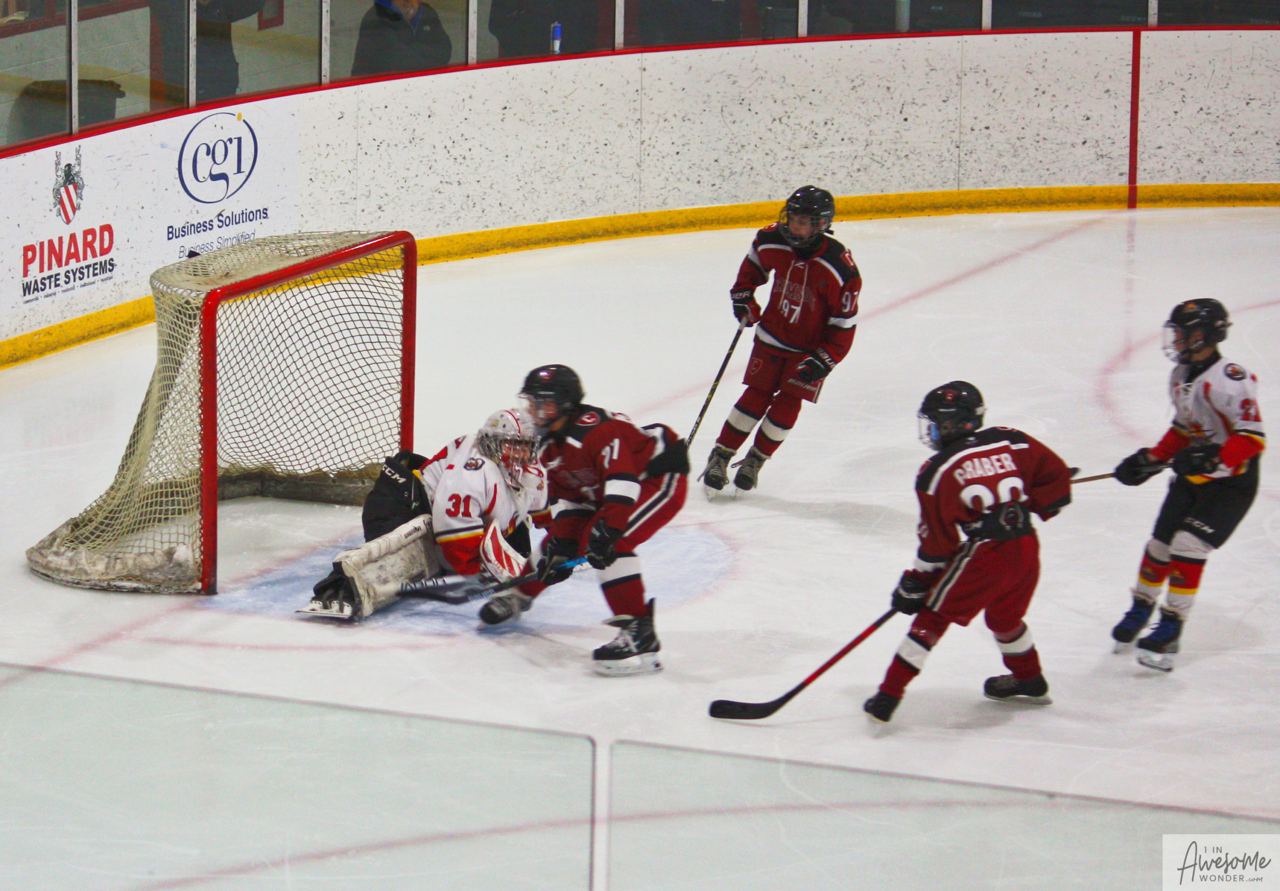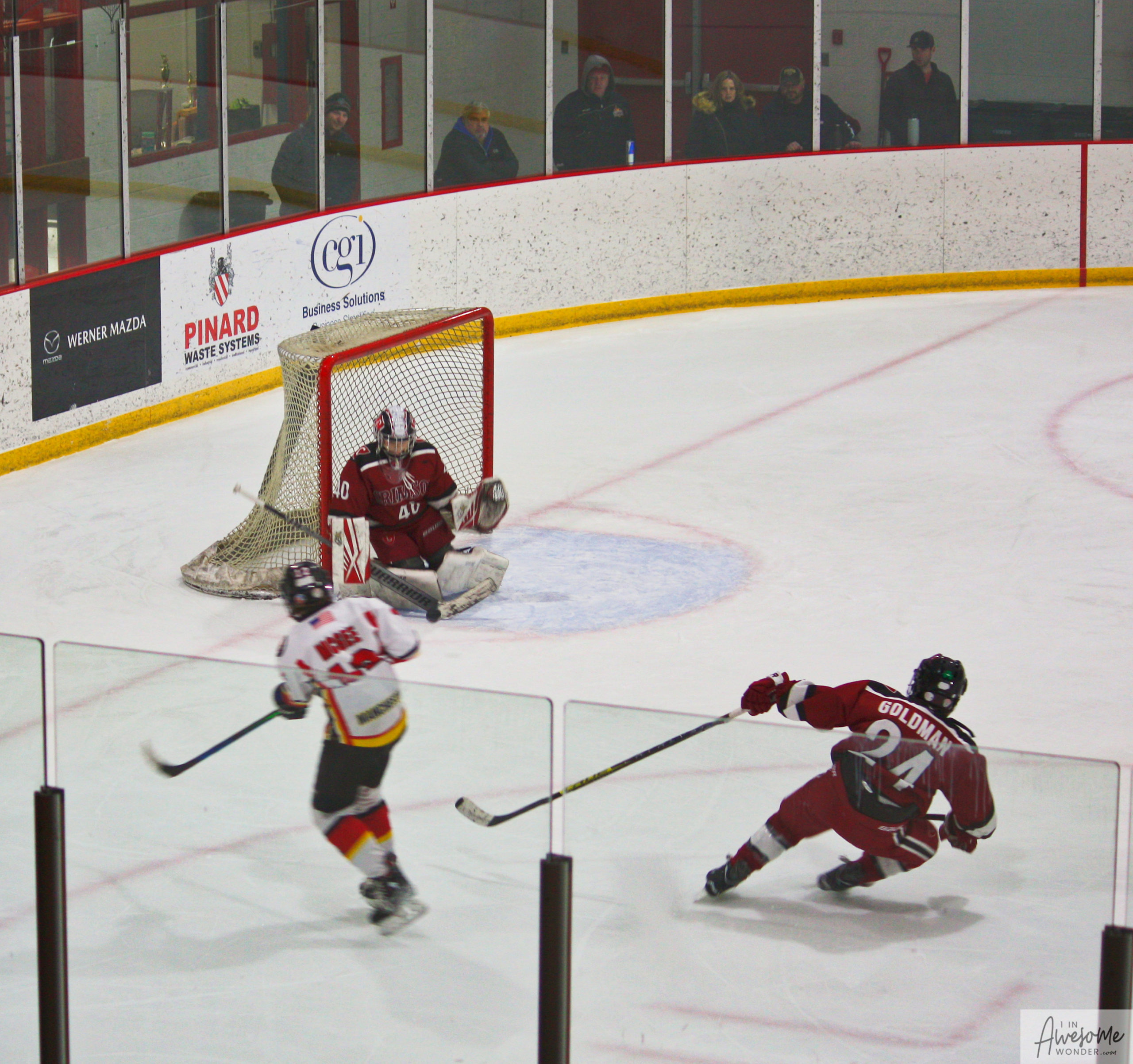 In game two of Saturday the Flames played host to the Crimson over at West Side Arena. Somehow, Travis Ingalls made a save on a 3-on-0 break to keep the game scoreless early in the game. The Flames scored first, on the power play. Logan McCain scored from the left point after intercepting a clearing attempt. The first period ended with the Flames leading, 1-0. After a few penalties and a goalie change in the second period, the Crimson tied the game, 1-1 on a 3-on-1 break. The second period ended with the score still tied at 1-1.