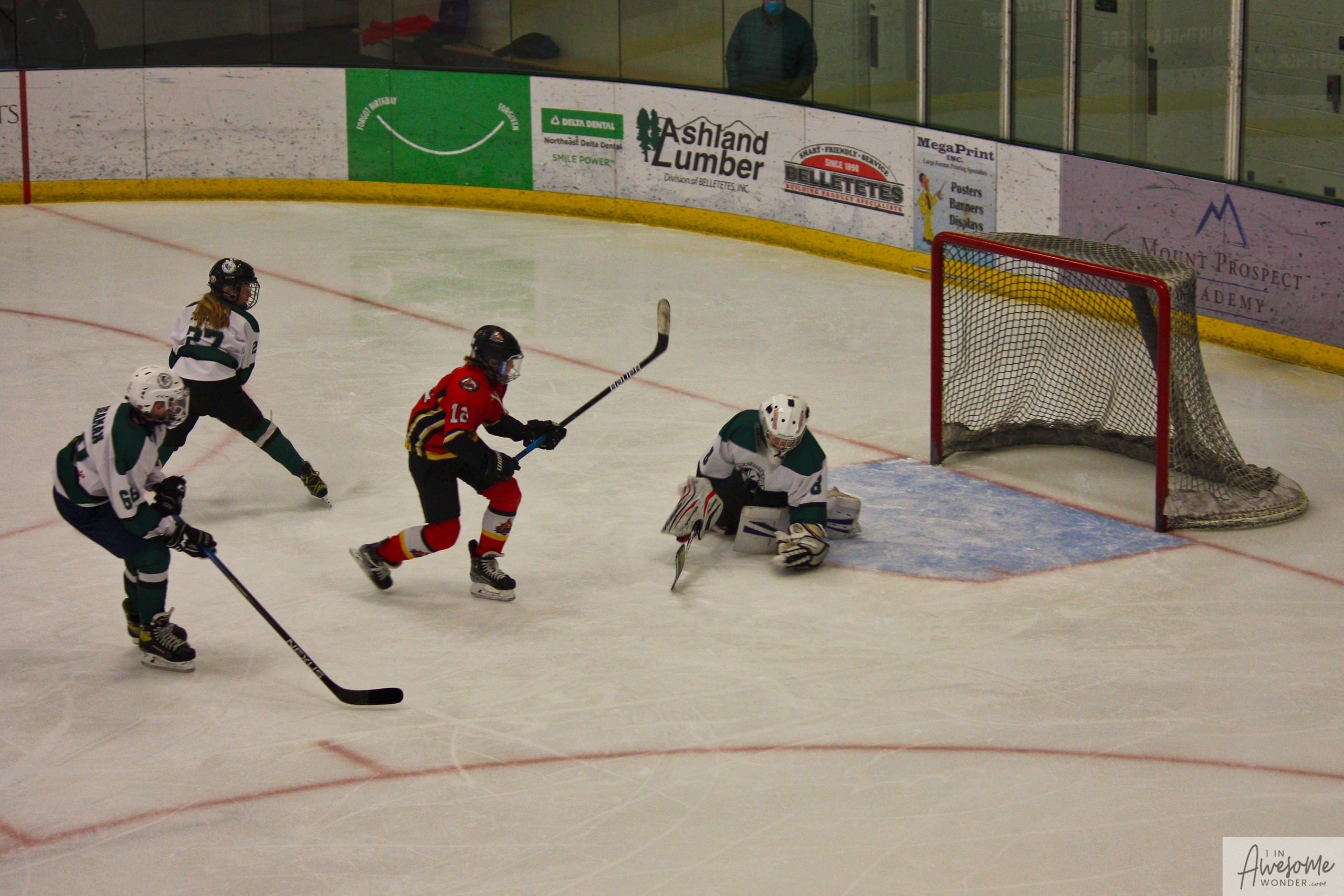 Will Rosenbeck came into the game and made an immediate impact, making a great save against a 3-on-1 break. Then he had a pair of saves on back to back breakaway bids. The Flames always seem to welcome Will to the game by letting the opponent skate in a few times to get him warmed up. The Flames were down, 3-2 after two periods.