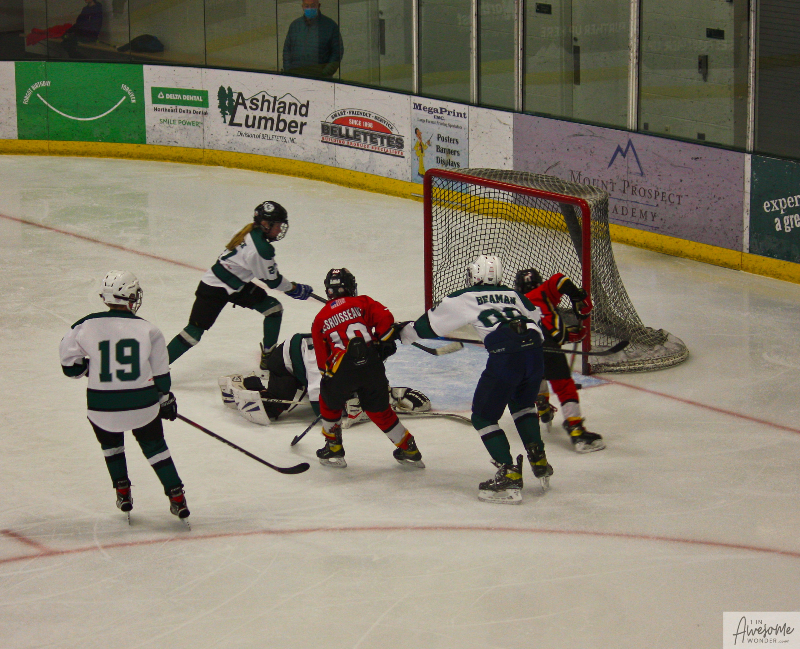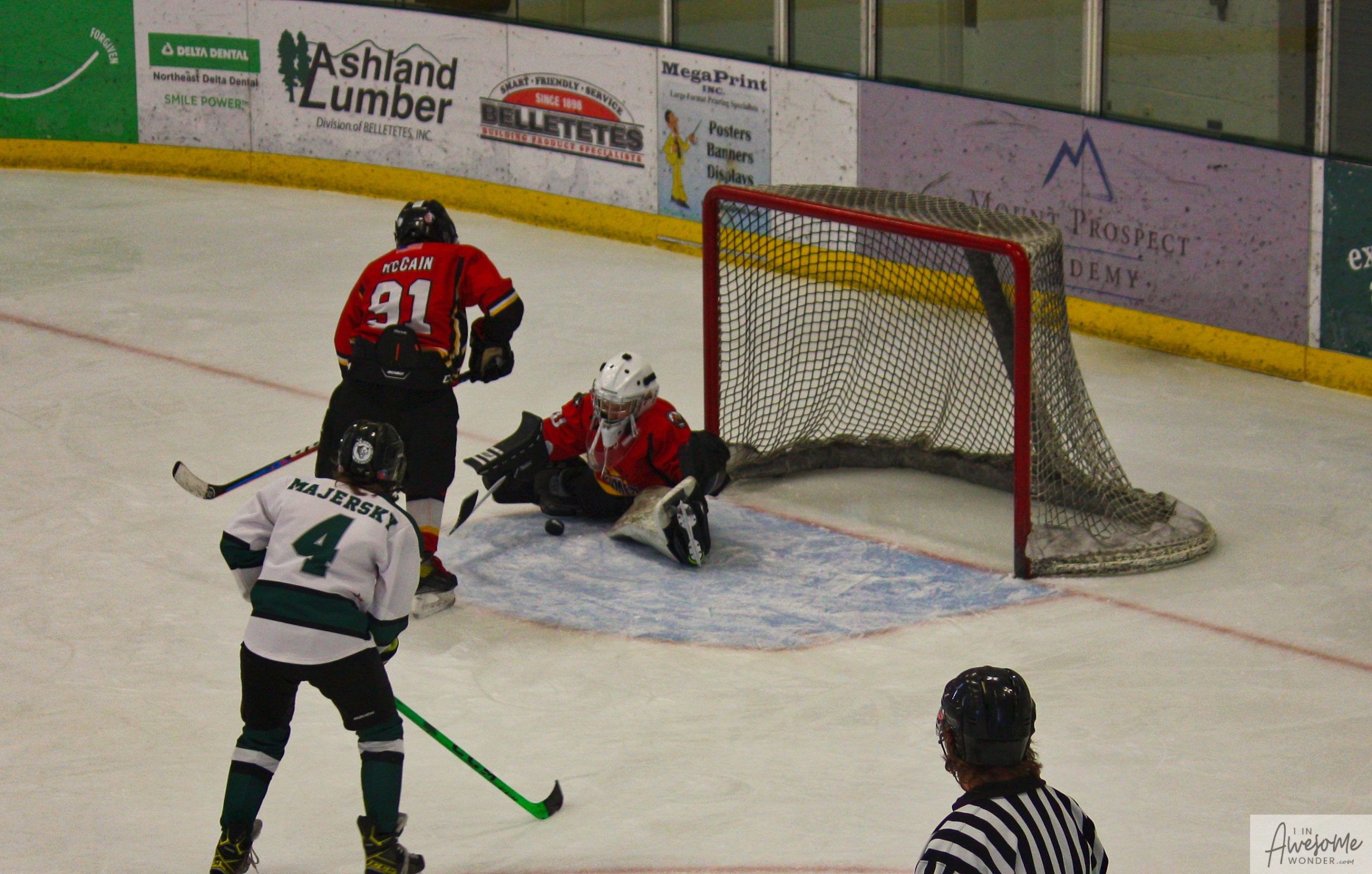 Early in the second period, the Flames took a tripping penalty and the Shamrocks scored almost immediately. Then, the Shamrocks scored another goal a minute later on a really nice redirection of a shot at the side of the net. The Flames trailed, 3-1. Travis Ingalls made some huge saves in this stretch to keep things from getting any worse. The Flames went on the power play themselves, and they scored to cut the lead to 3-2. Alex Panitz threw a turnaround shot toward the net and Cam Desruisseaux knocked it back to Jacob Casimiro who ripped a shot into the net.