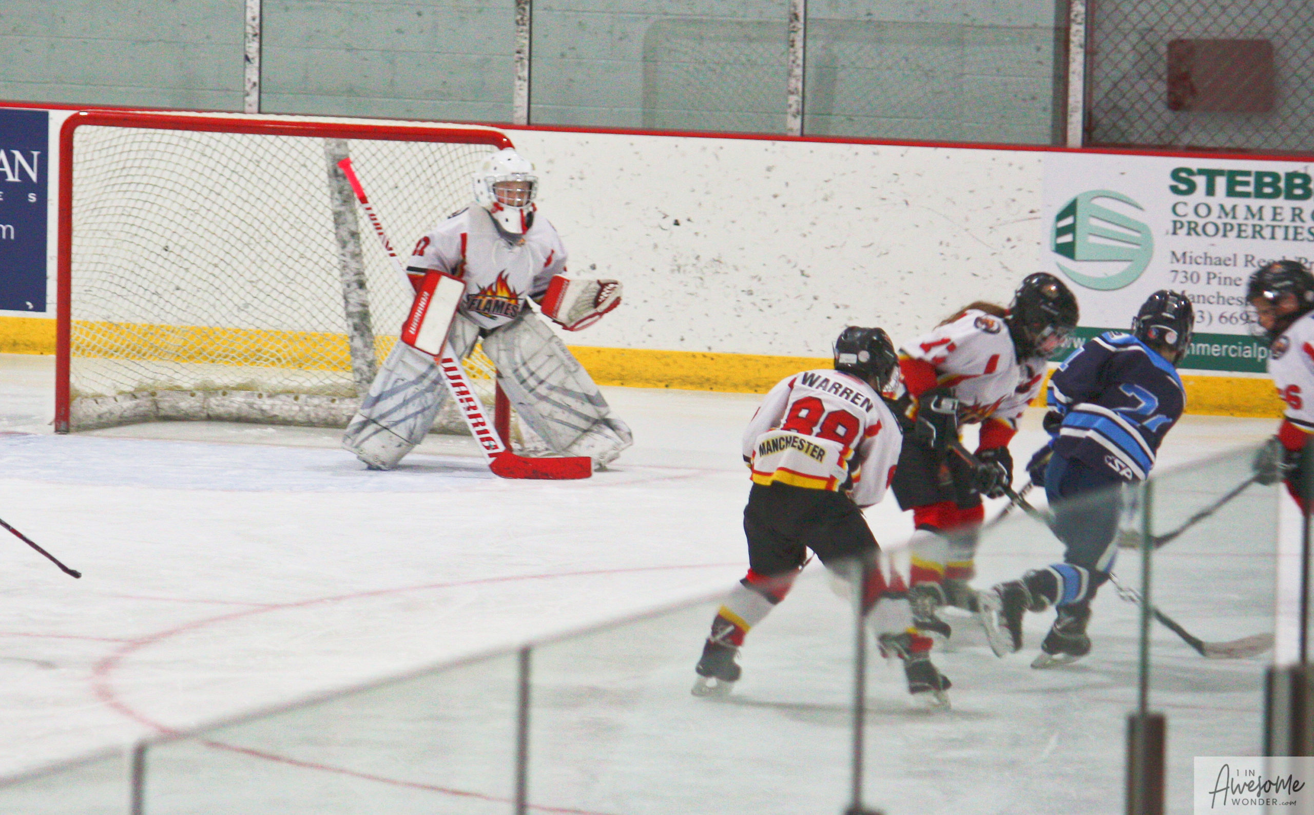 Little did we know that at 3-1, with two plus periods still to play, the Blazers would not score again. The Flames got some timely goaltending and good team defense while kicking up their offense a few gears. Manchester took a 4-3 lead after two periods, and then pulled away, with three more goals in the final period, for a 7-3 win at West Side Arena.