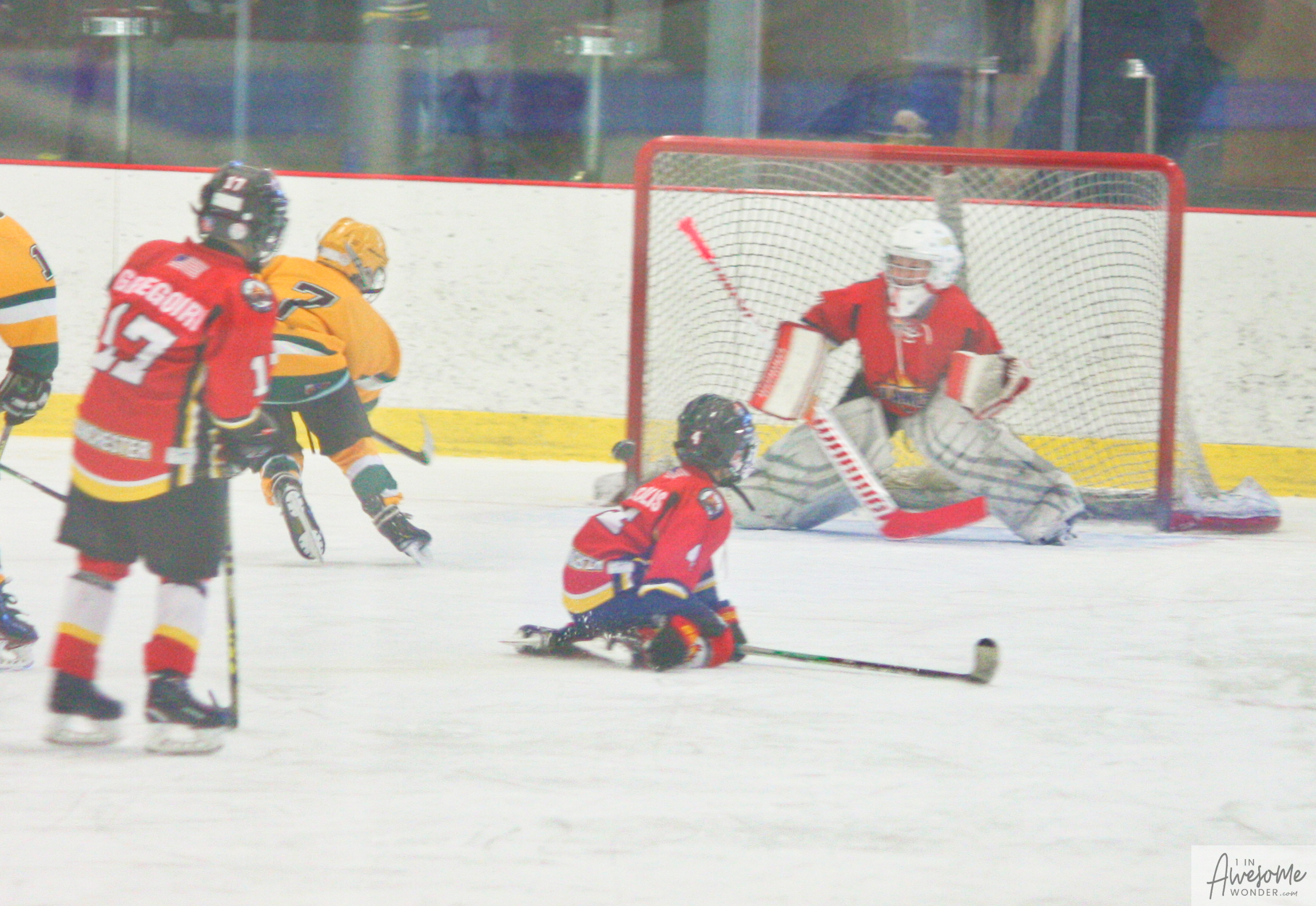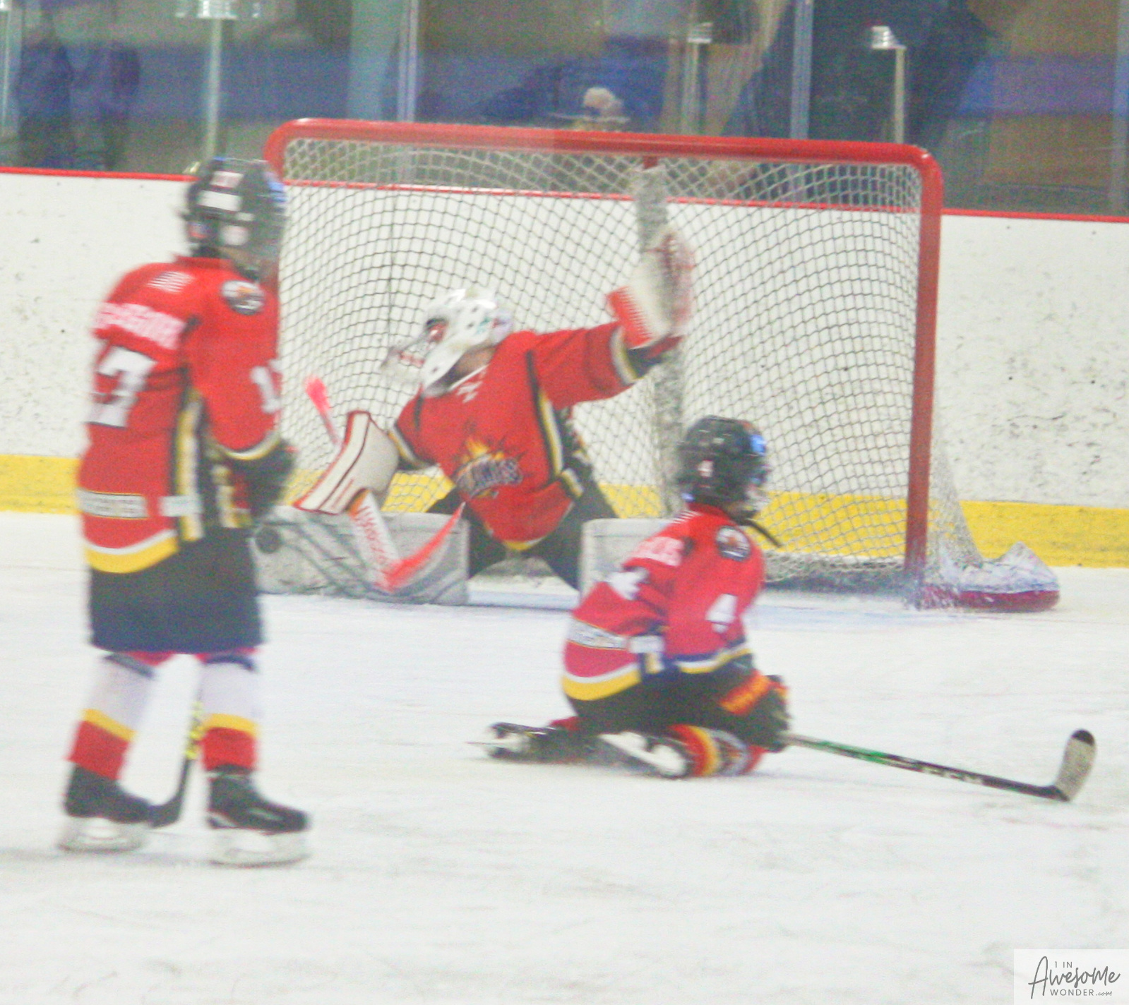 With Drew on his feet to get robbed by the SASA goalie, Logan practices his own form at taking the ice.