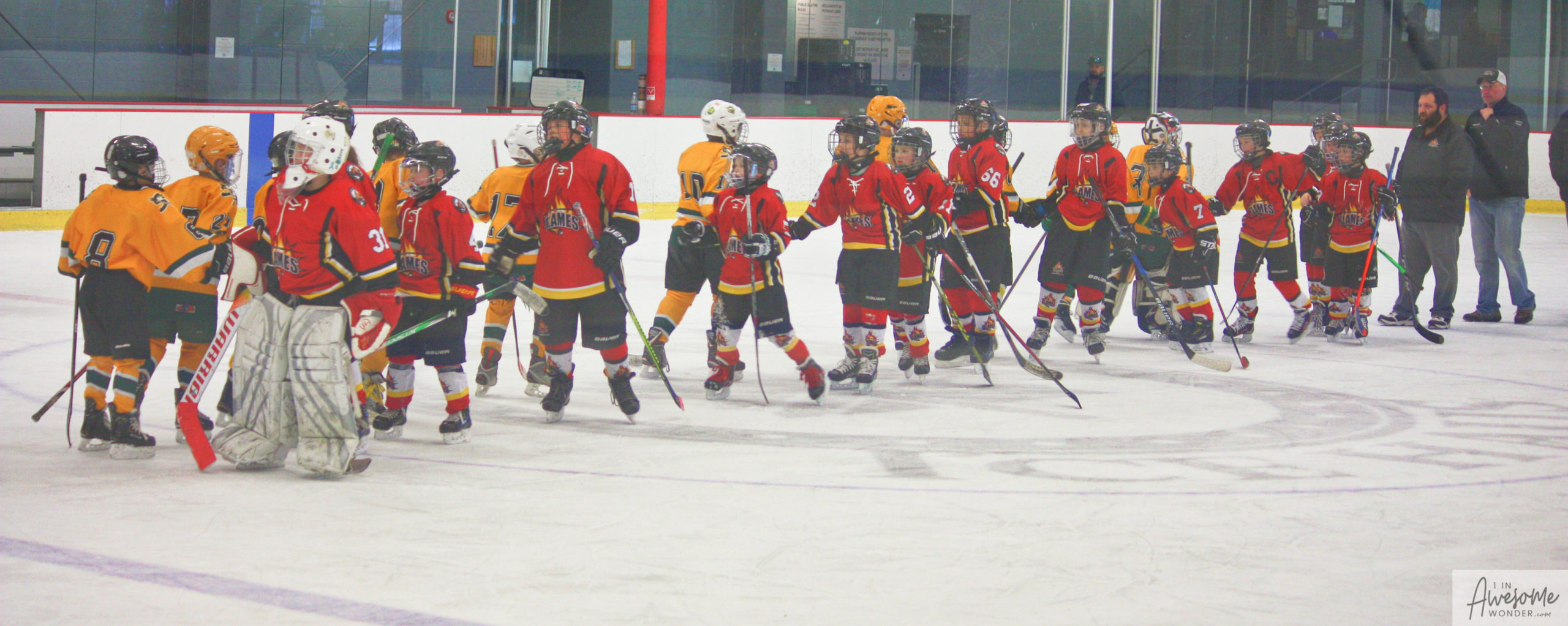 The Flames line up and shake hands with SASA after a well played game. Jax takes this moment to daydream of floating in the lazy river at the water park as soon as possible.