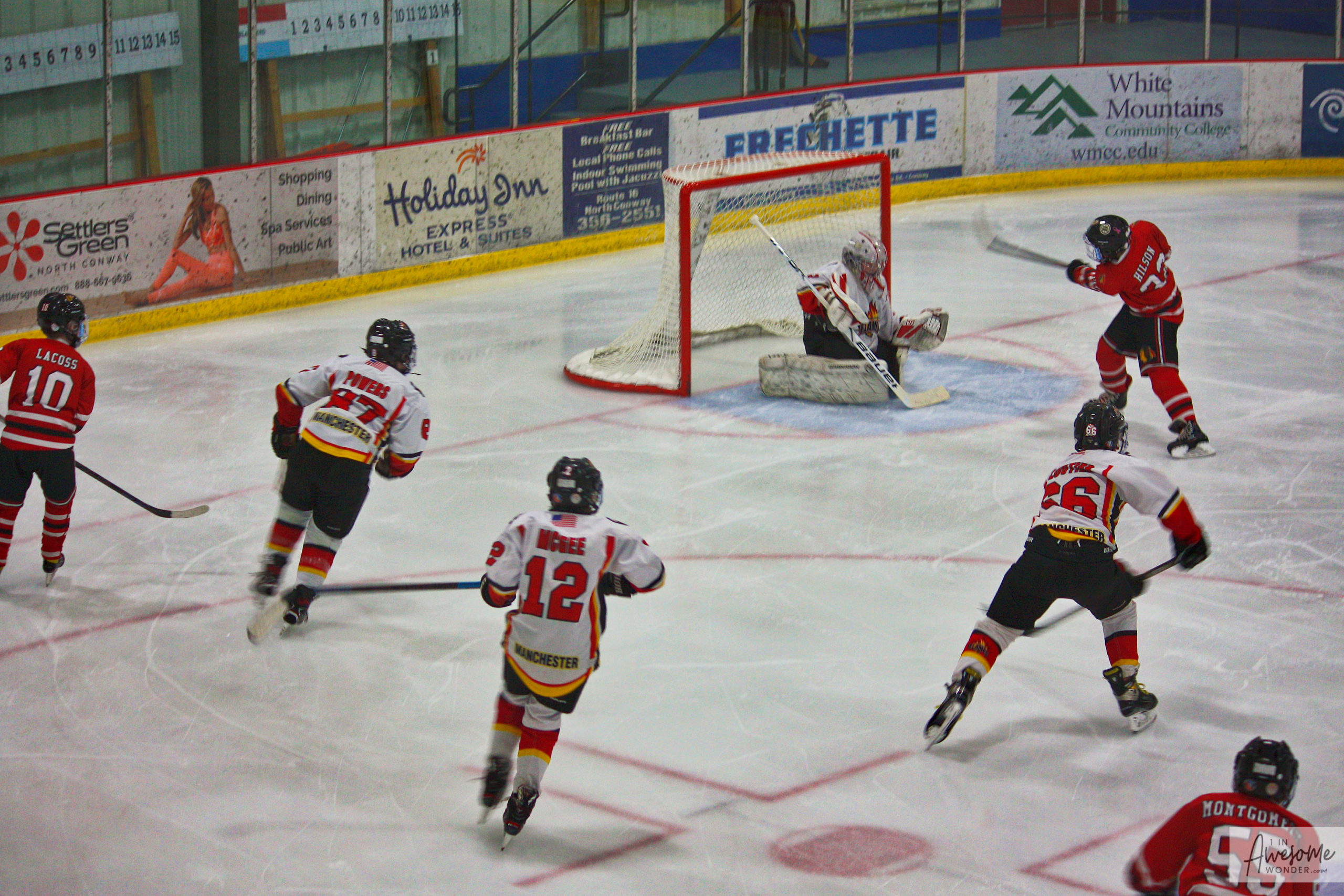 The 2010 Manchester Flames entered the GSL State Tournament as the #5 seed in the six-team field. The Flames caravan of players, coaches, and families made their way through the falling snow up to North Conway for the tournament being held at Ham Arena. Manchester had an impressive opening game before being shut down by the #4 and #1 seeds.