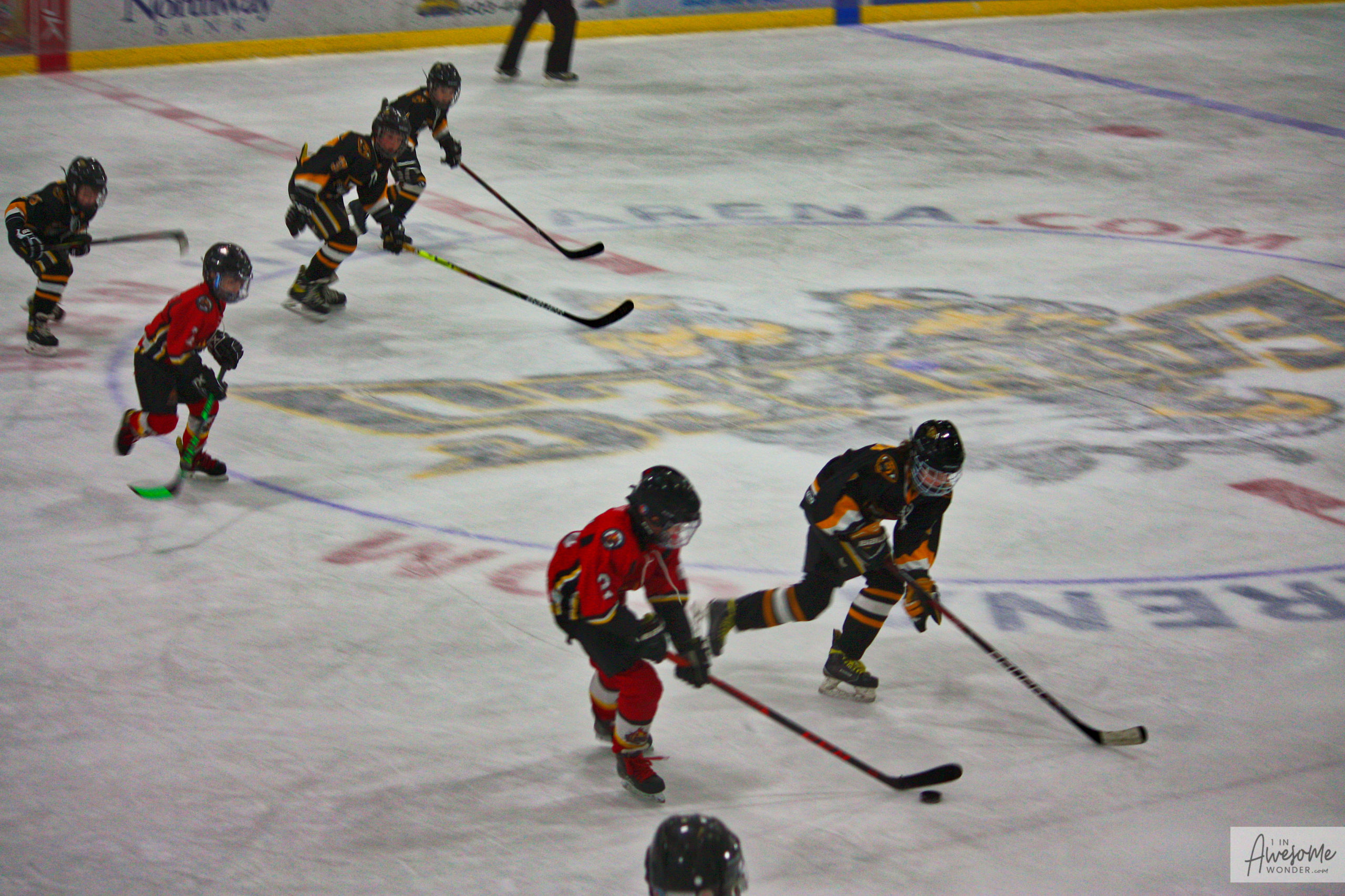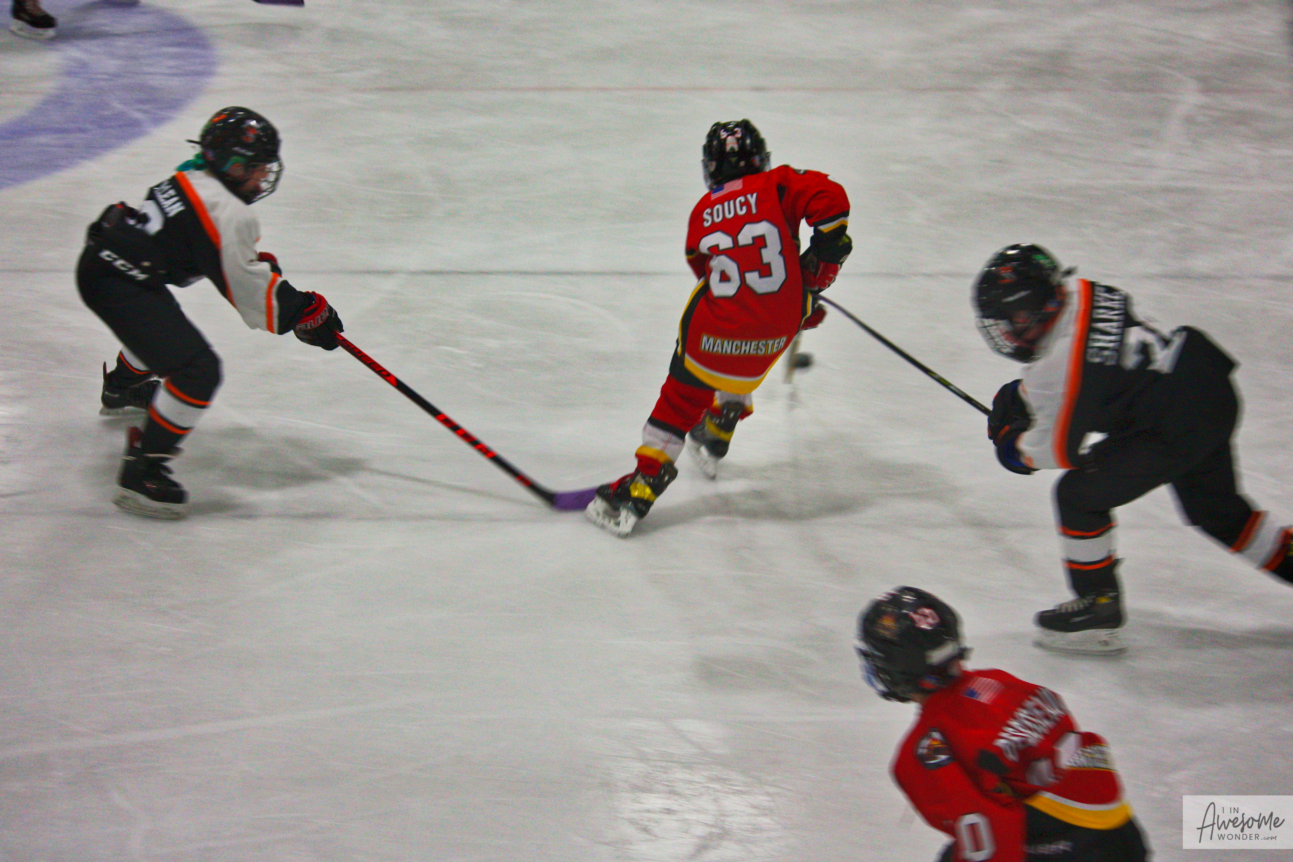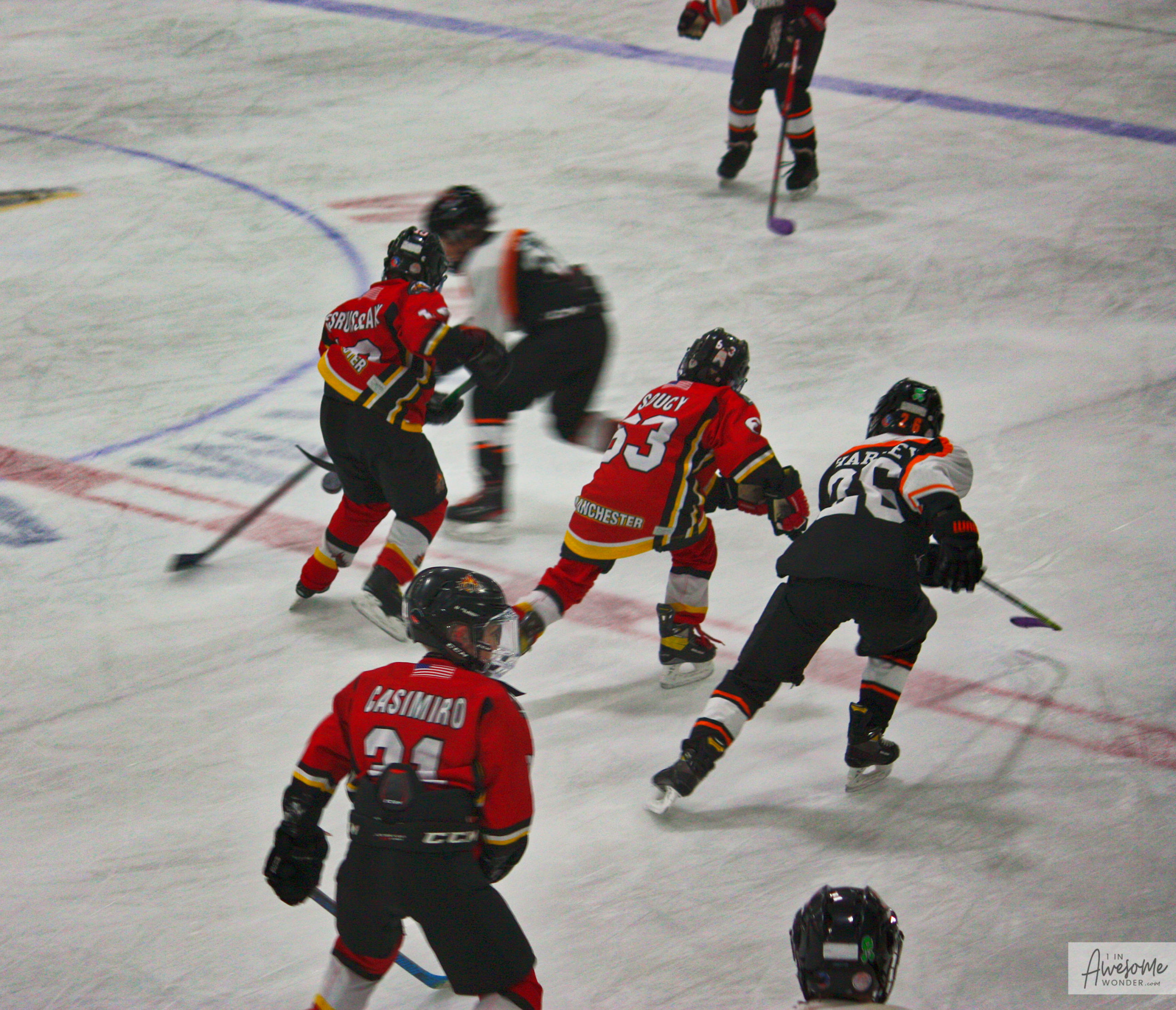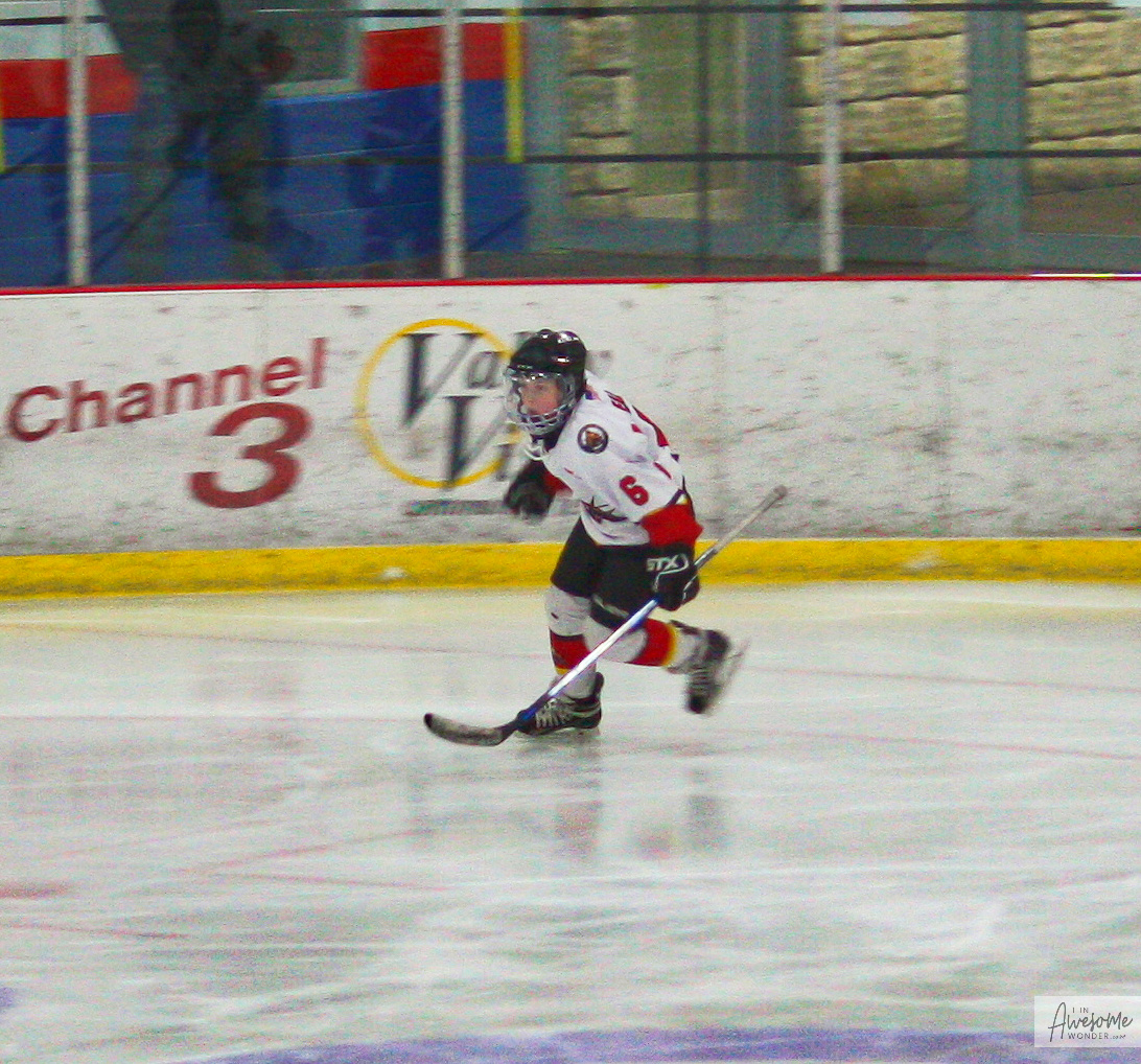 The Flames head up ice. Cam is skating so fast that his last name scrambled on his jersey.