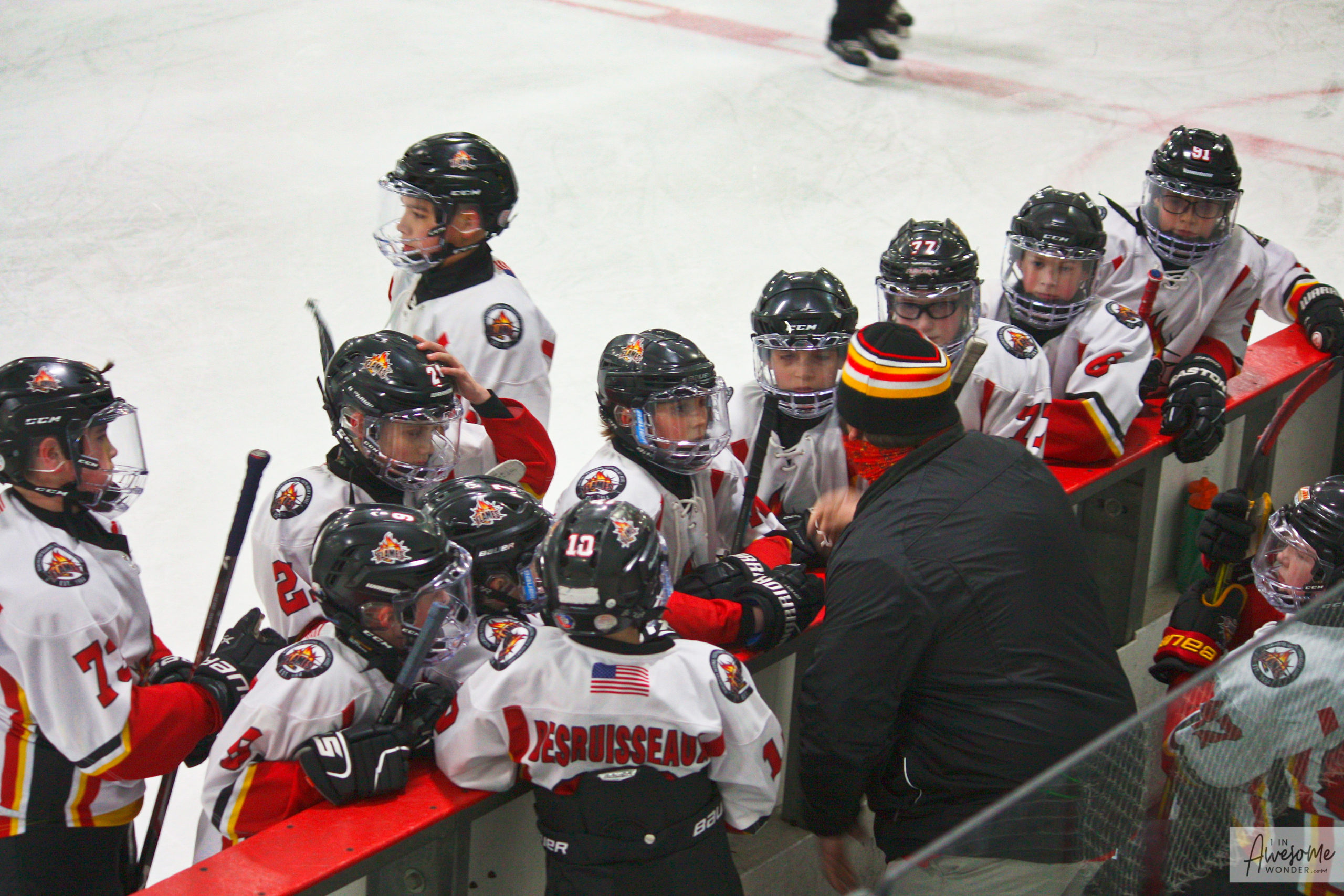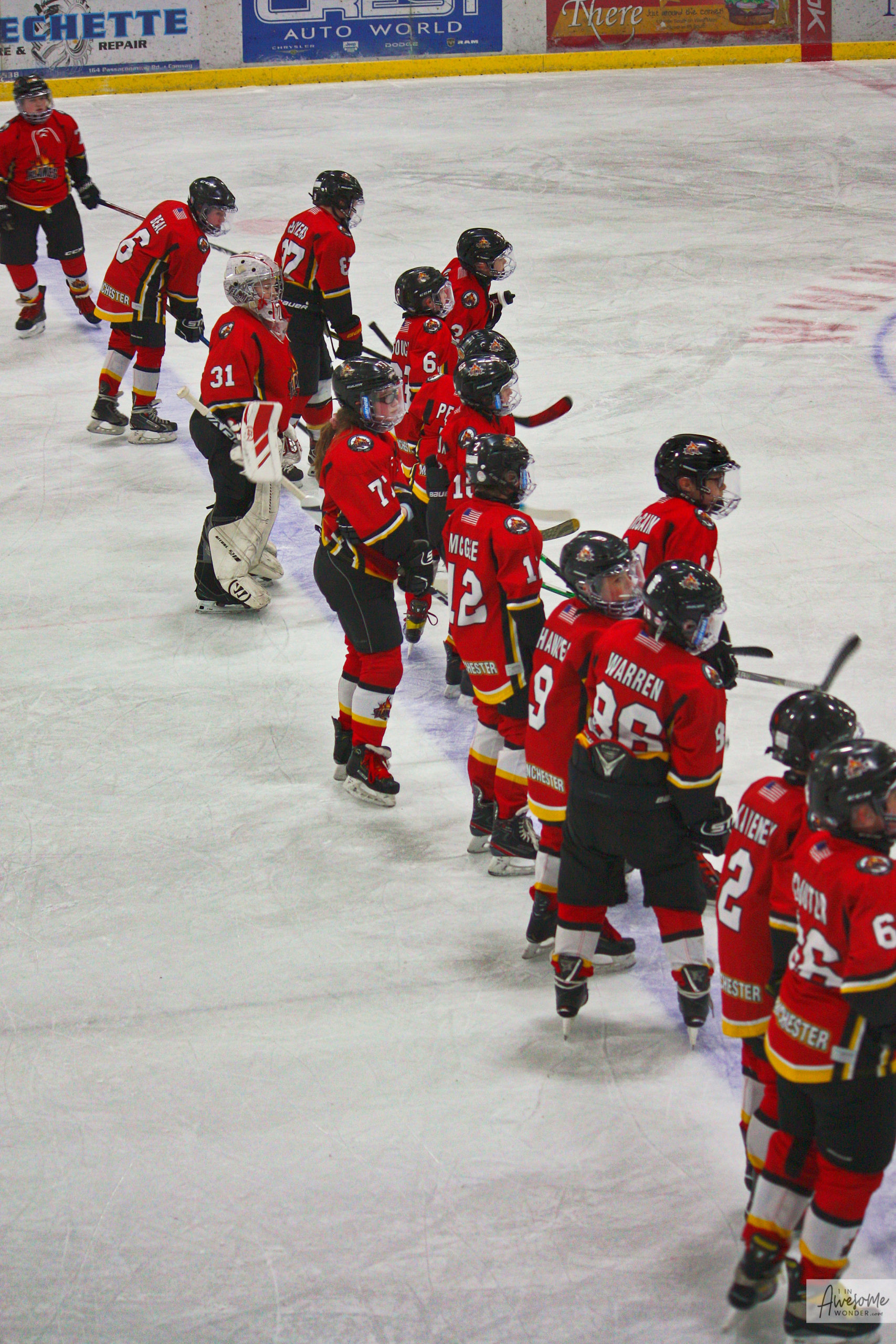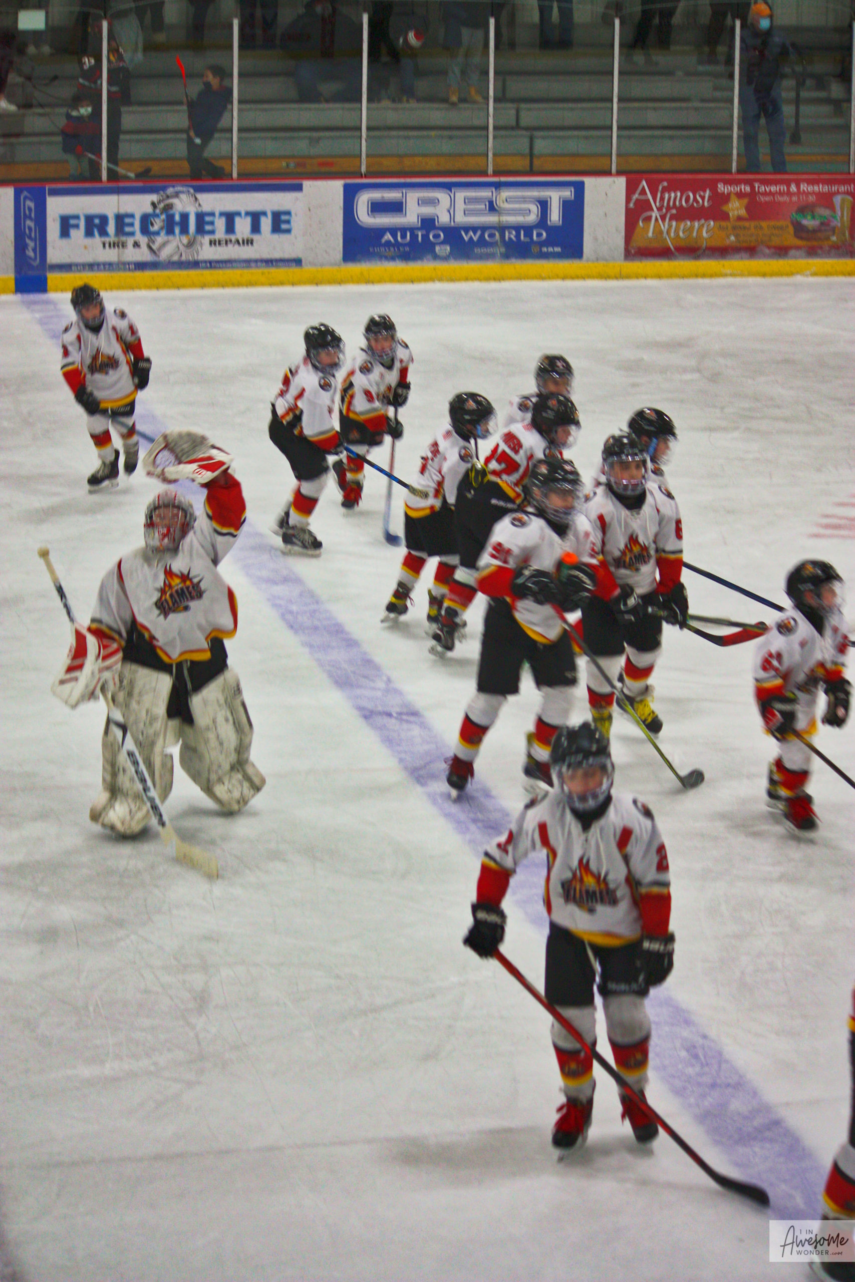 The Flames salute their opponent and skate off victoriously. Travis frantically waves me down to say hello.