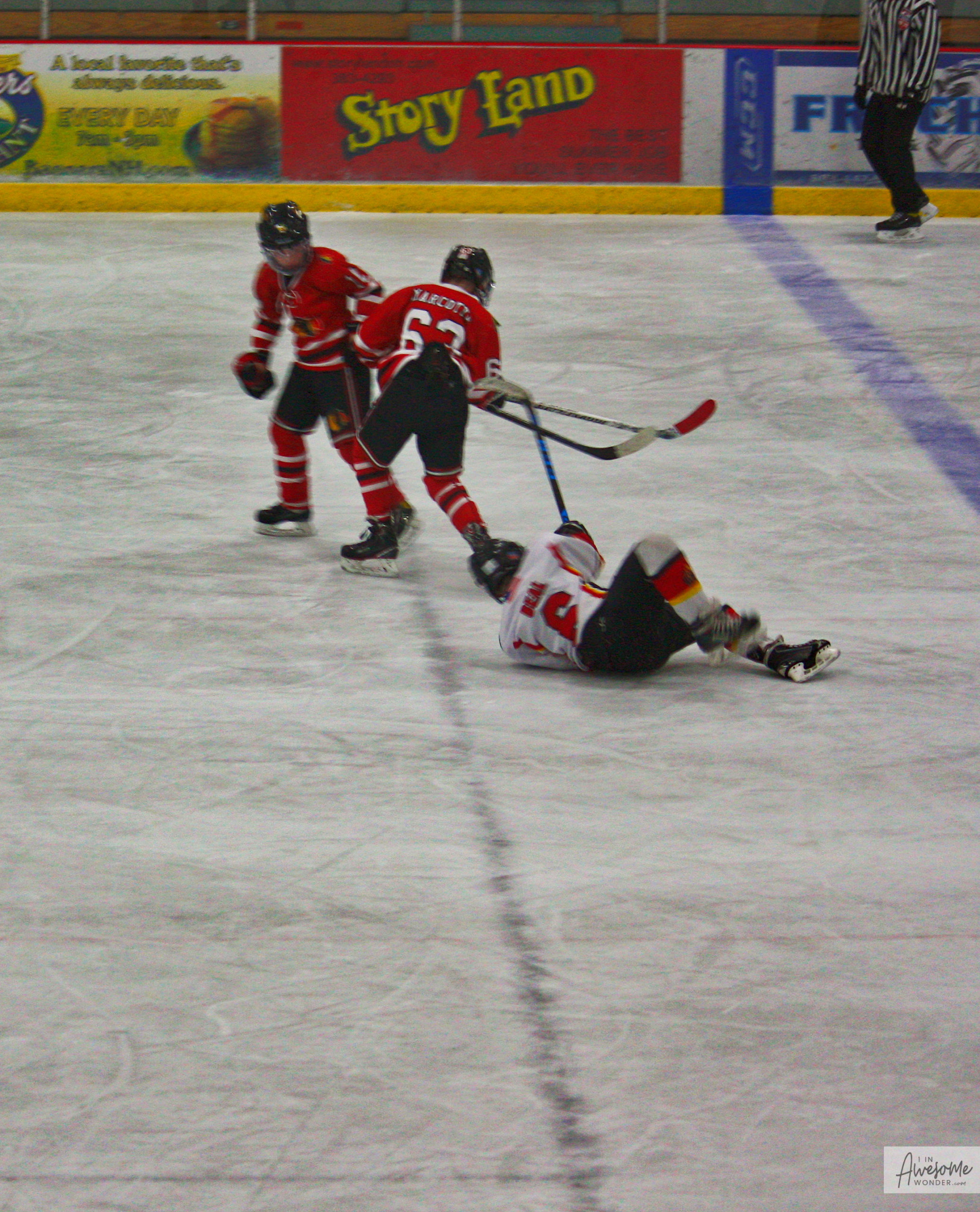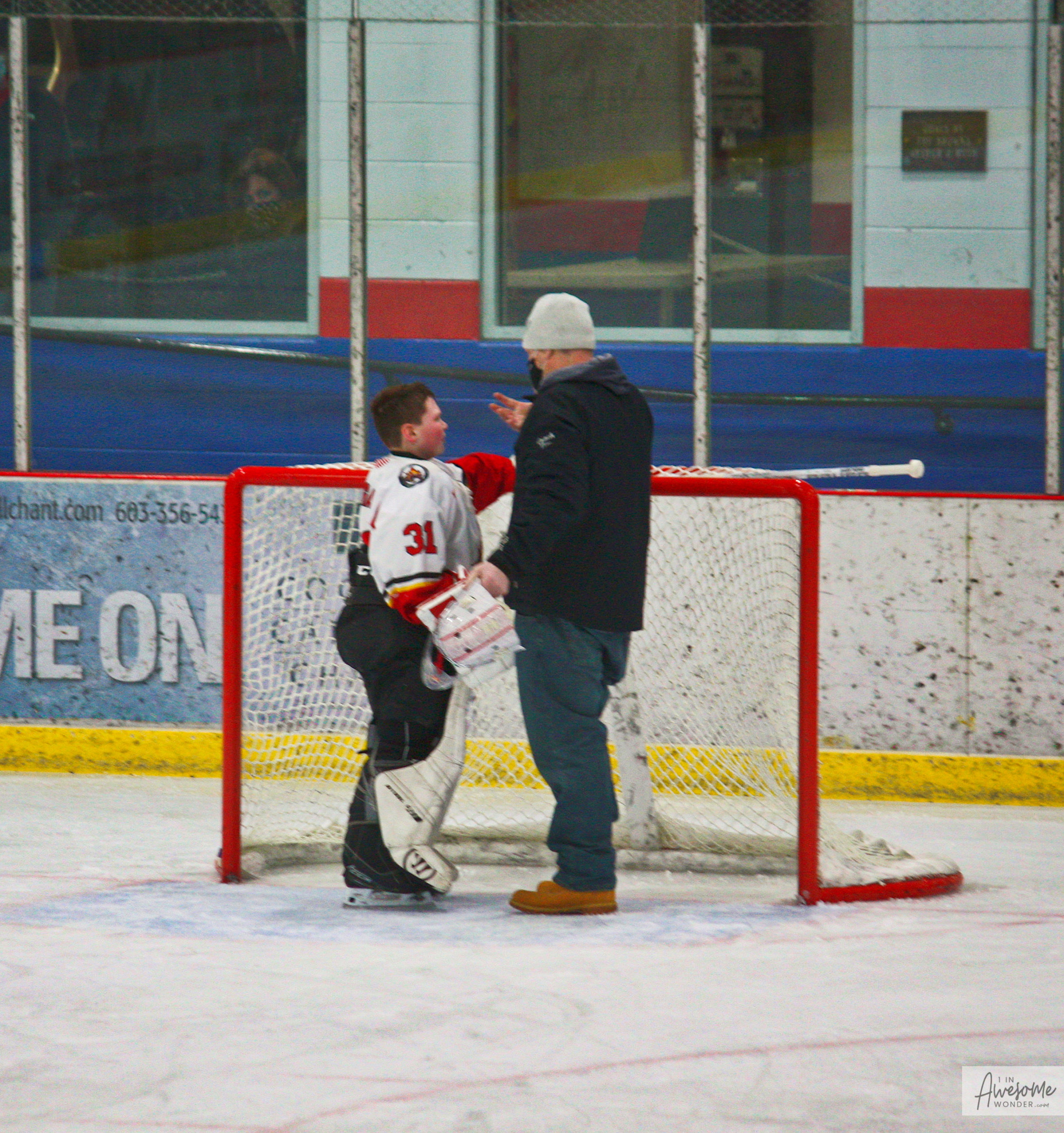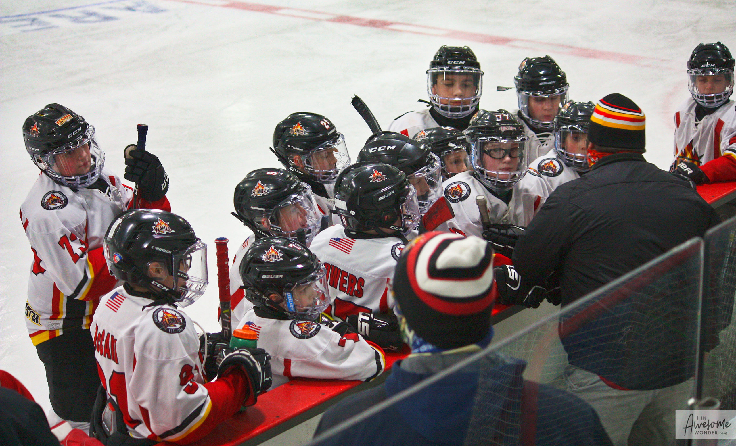 The Flames salute their opponent and skate off victoriously. Travis frantically waves me down to say hello.