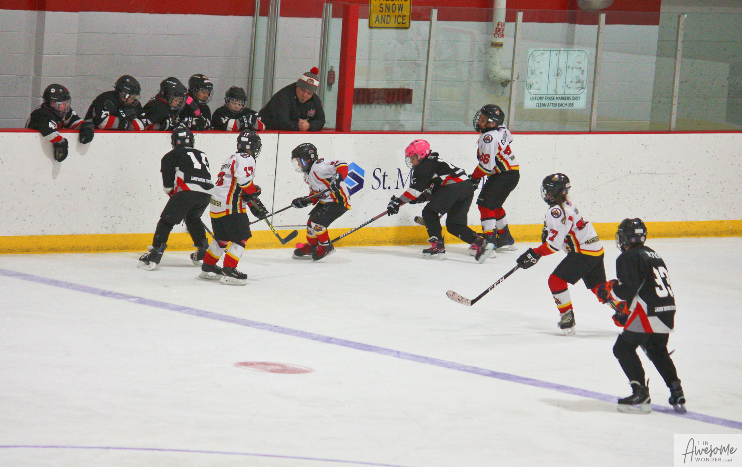 The sign says snow and ice. The dry erase board looks like someone diagrammed their Thanksgiving turkey, and the Lakers bench is very much focused on the game. Somehow Colby is skating in his sleep.