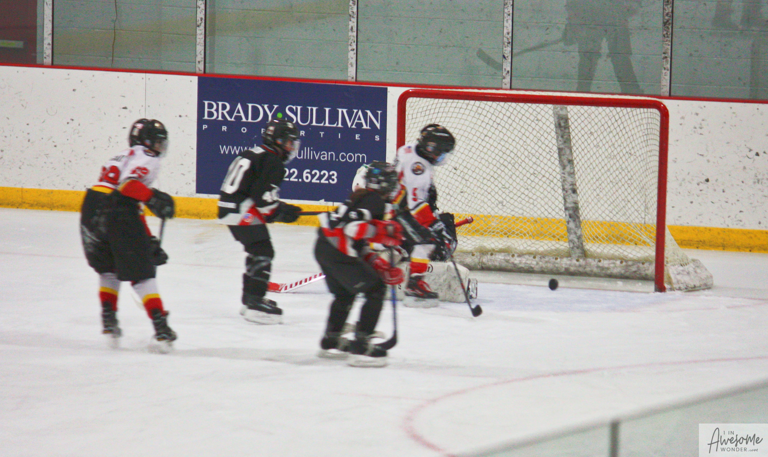 The puck is just beyond the goaltender’s reach and headed for the back of the net.