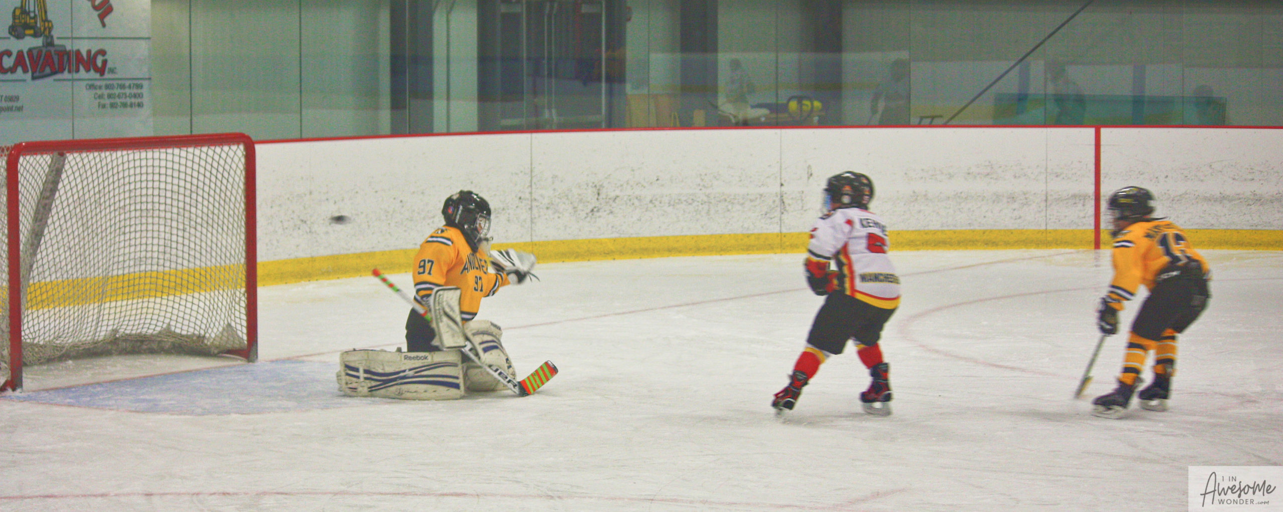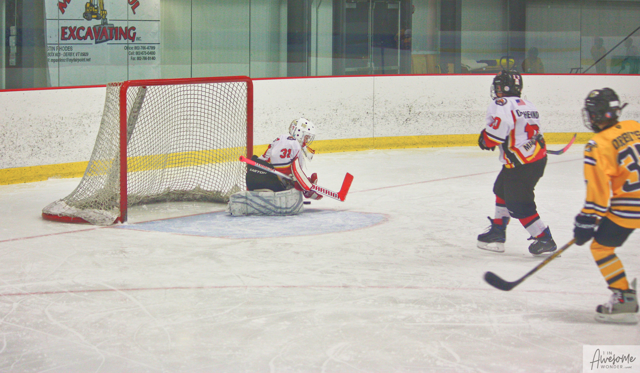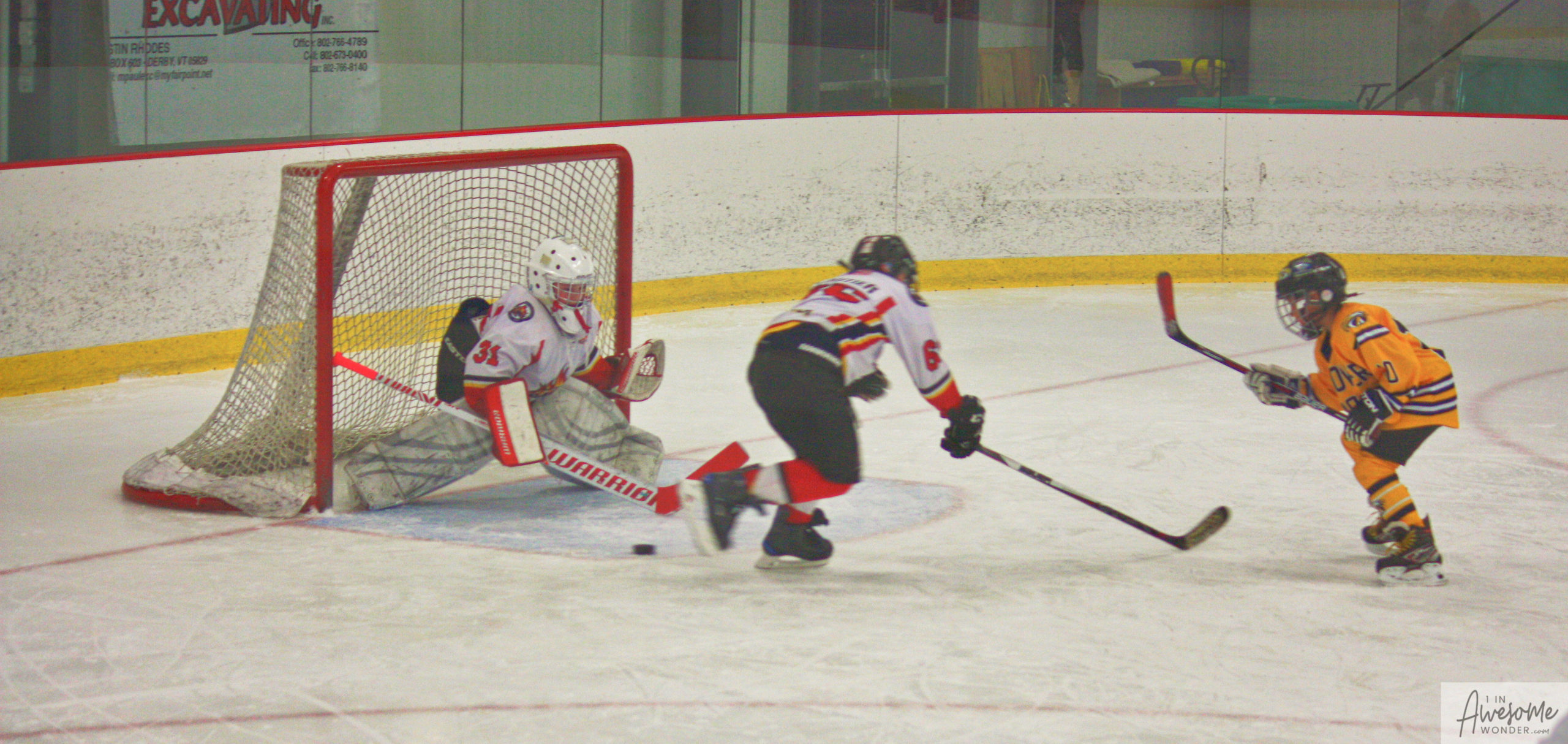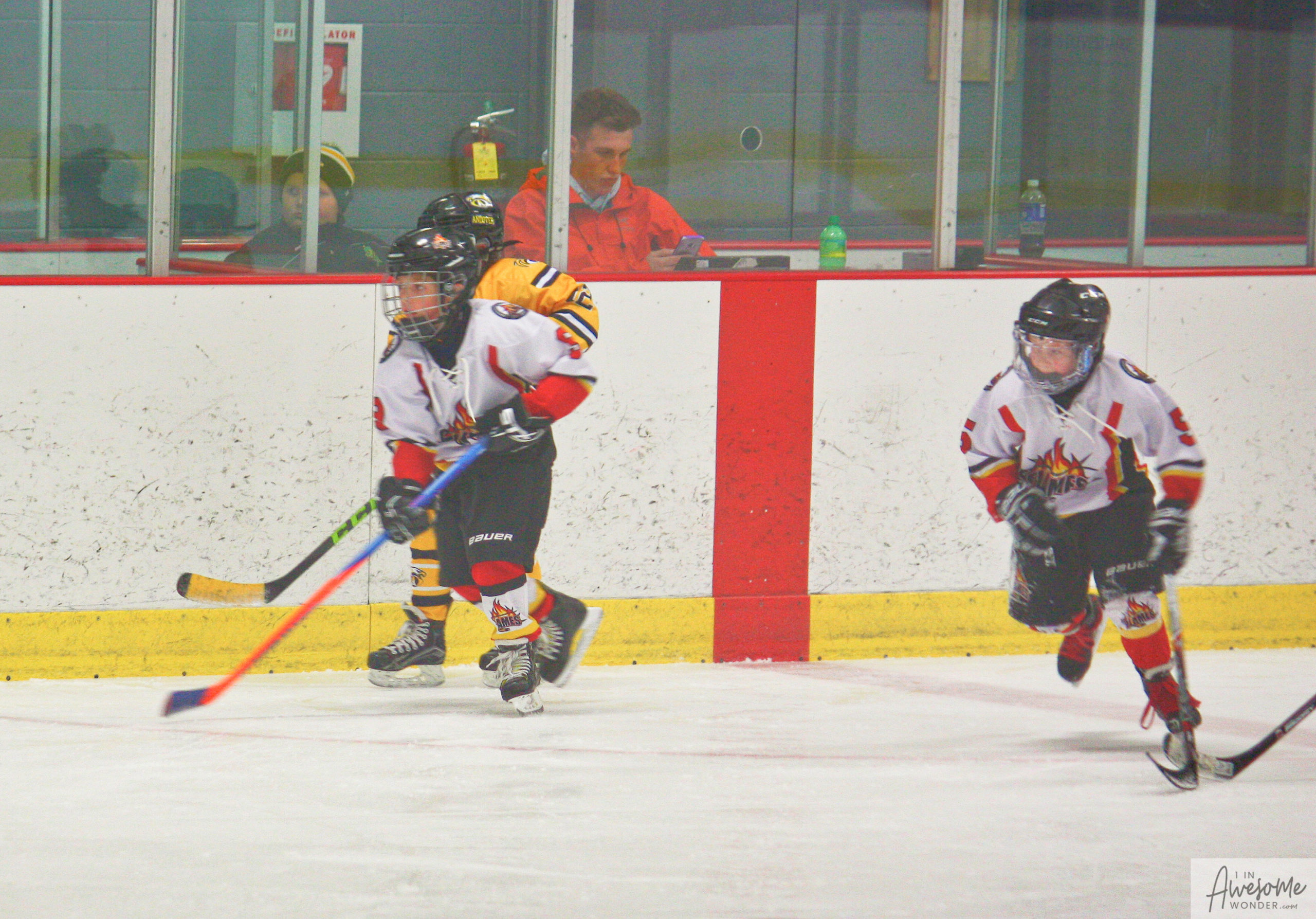 Jordan and Austin are hustling up ice while the scorekeeper seems to think that watching the game on his phone is better than the live action right in front of him.