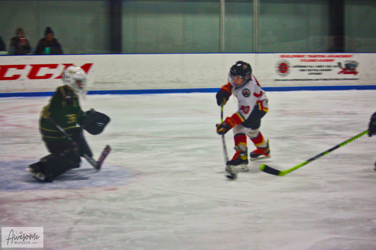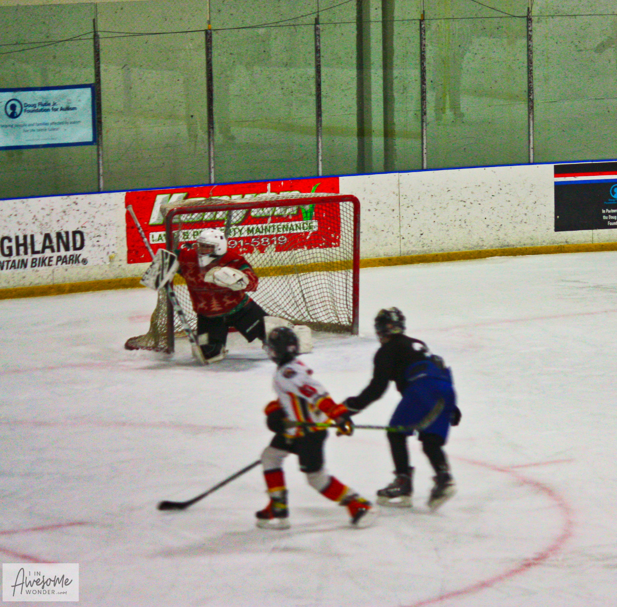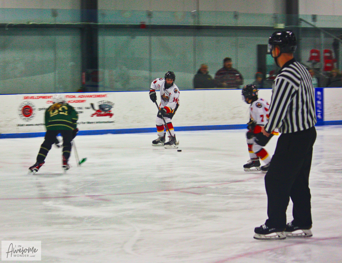 The Flames battled with the Mad Dogs again, as well as one official that just seemed to be auditioning for Broadway, or the WWE. Animation in real life. Anyways, the Flames took three penalties in the opening period. Regardless, the Flames got a shorthanded goal by Logan McCain and led, 1-0 after one period.
