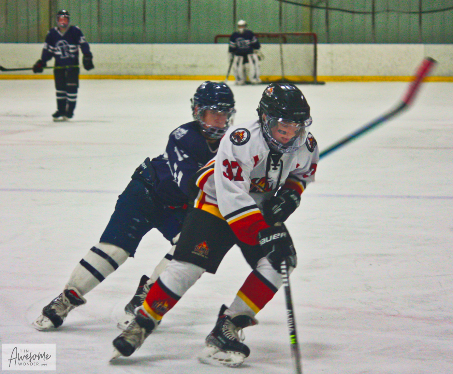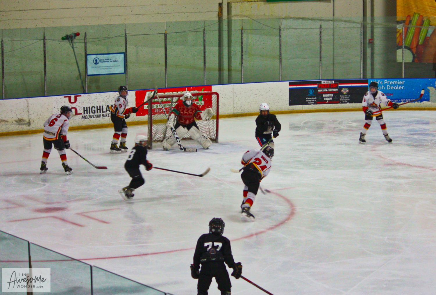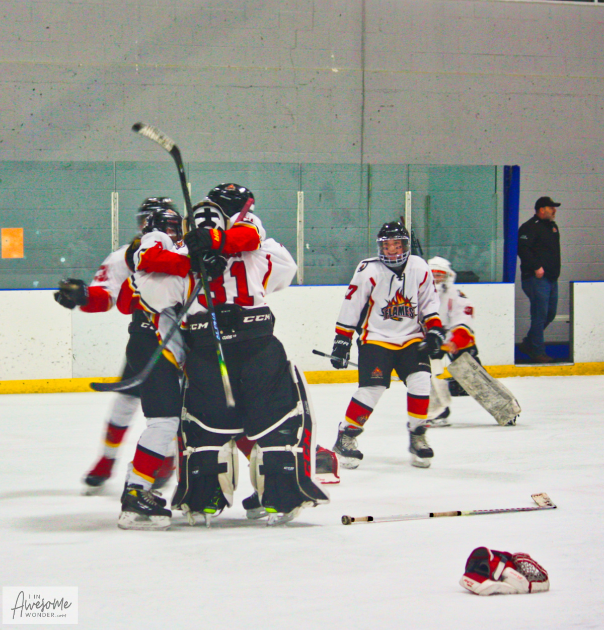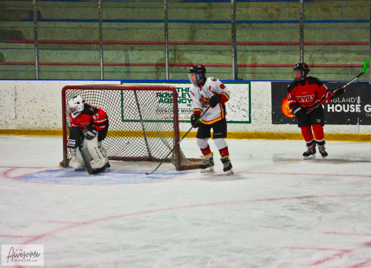 The Flames got their motivational intermission speech from the coaching staff and they came out to execute their plan. I don’t know what the plan was, but on the opening shift the Flames scored. Ian Kaveney, Jacob St. Pierre, and Teddy Beal took the puck up the ice and worked themselves into position to score. They executed good passes leading to Ian’s goal at the front of the net, and a fist pump that the whole team felt. The Flames had turned whatever the second period was leading to, into a two goal lead on the first shift of the final period.