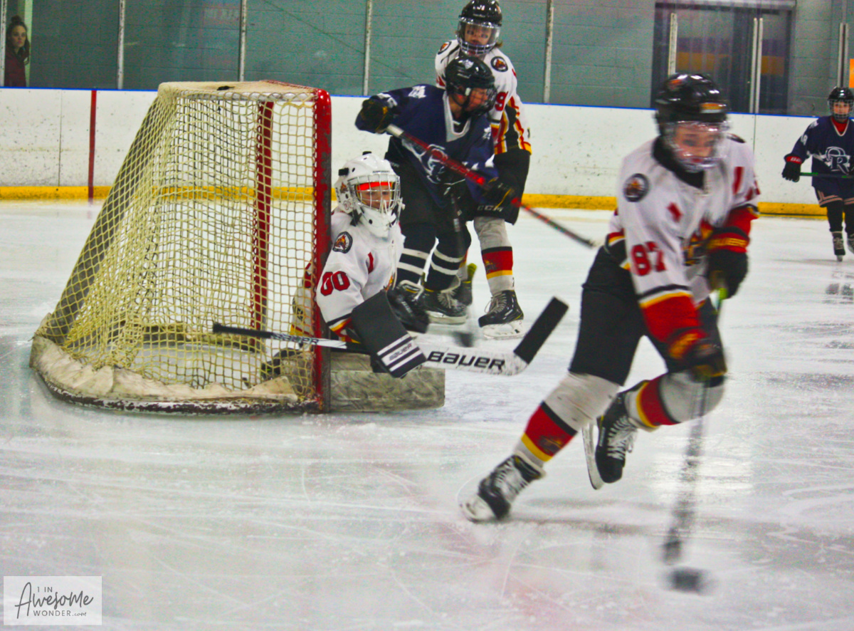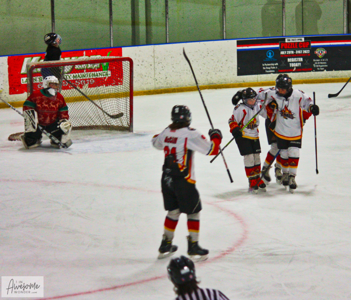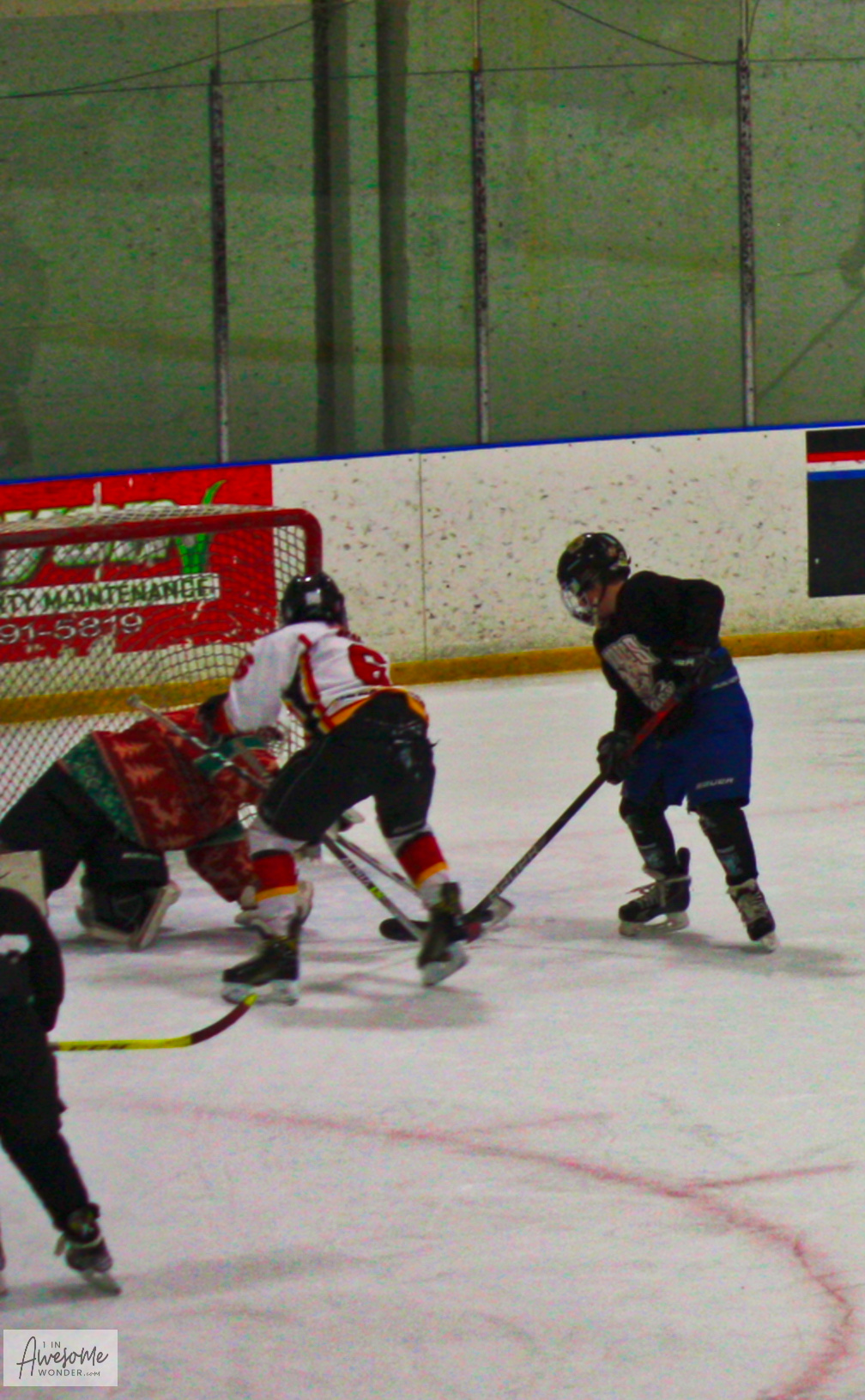 The Flames got their motivational intermission speech from the coaching staff and they came out to execute their plan. I don’t know what the plan was, but on the opening shift the Flames scored. Ian Kaveney, Jacob St. Pierre, and Teddy Beal took the puck up the ice and worked themselves into position to score. They executed good passes leading to Ian’s goal at the front of the net, and a fist pump that the whole team felt. The Flames had turned whatever the second period was leading to, into a two goal lead on the first shift of the final period.