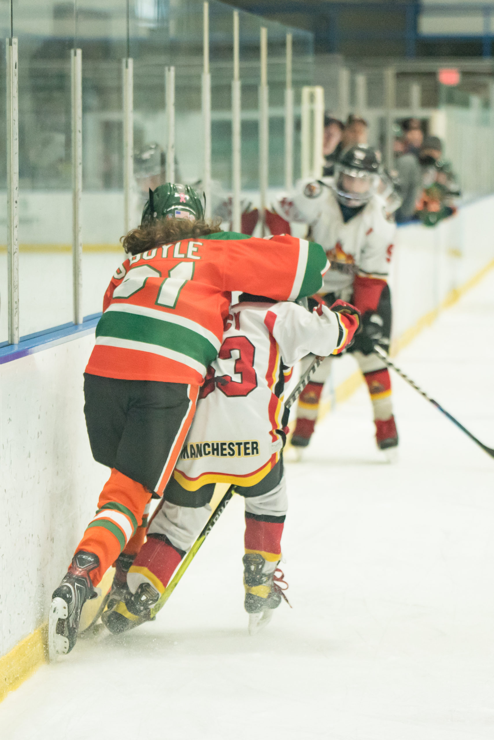 In the second period, the Flames scored again when Teddy Beal tipped a pass back to Dunn at the left point and she let a nice hard shot fly. The puck found the net and the Flames led, 2-0. The Shamrocks answered almost immediately with a power play goal when their shot hit the post but caromed into the net. The home team raised their play and were winning pucks all over the ice. This caused the Flames to take a pair of penalties, but they were able to kill them both. The Flames held the lead into the final period.