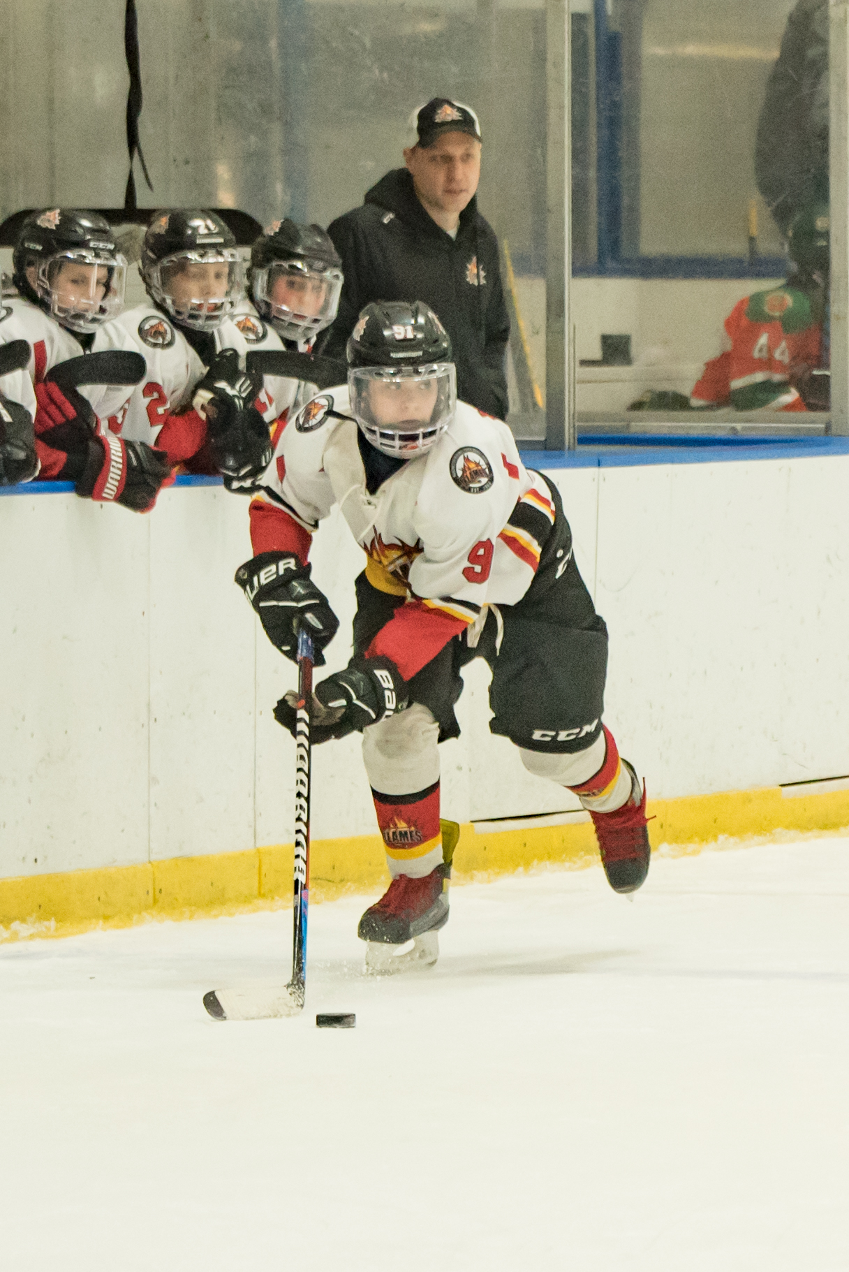 As for the weekend games, the 2010 Flames played pretty well. They dispatched of the Crimson West team, breaking open a 3-2 game, with five unanswered goals to win, 8-2 on Saturday. Cam Desruisseaux scored from Andy Soucy and Jacob Casimiro to get the Flames on the board in the opening minute. The Flames had a long 5-on-3 power play but didn’t score. Once the penalties were over, Alex Panitz took his sixth shot (give or take) in the last two minutes and it rebounded off of the goalie, right to Sean McGee who put the puck in the net. Desruisseaux struck again, with a redirected shot from Casimiro to give the Flames a 3-0 lead.