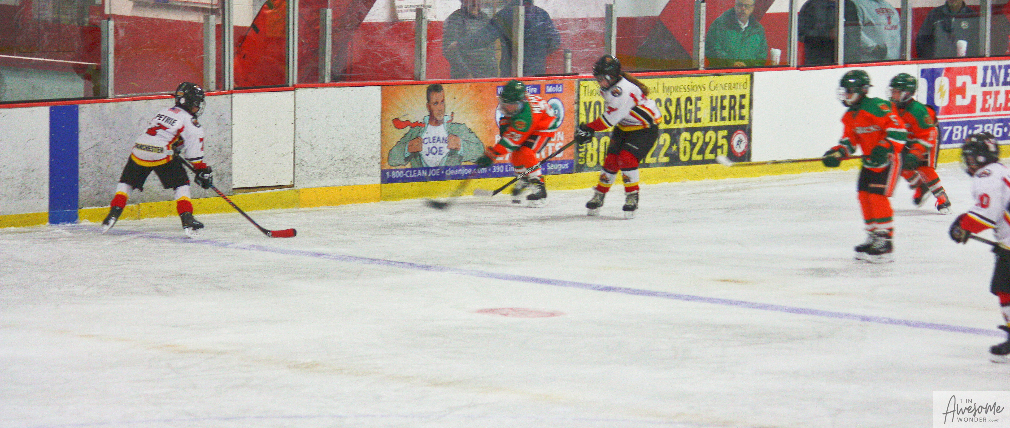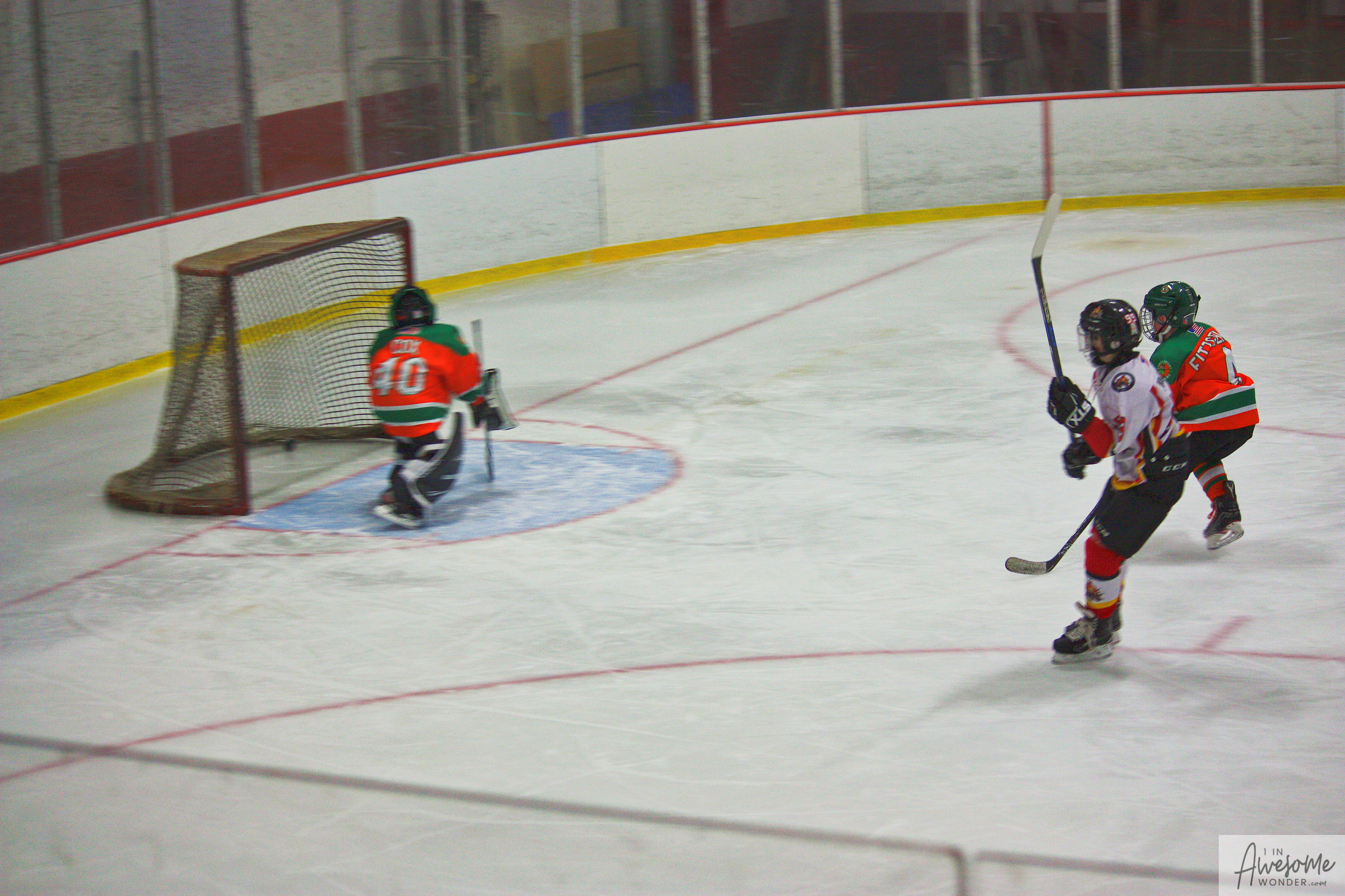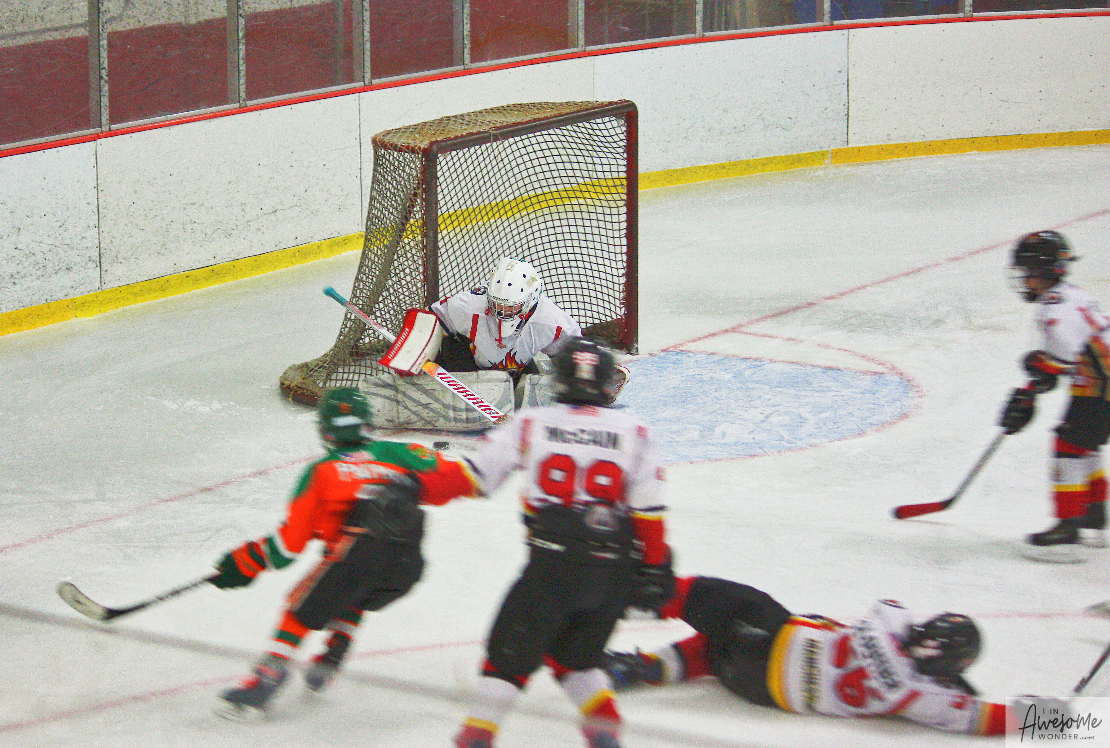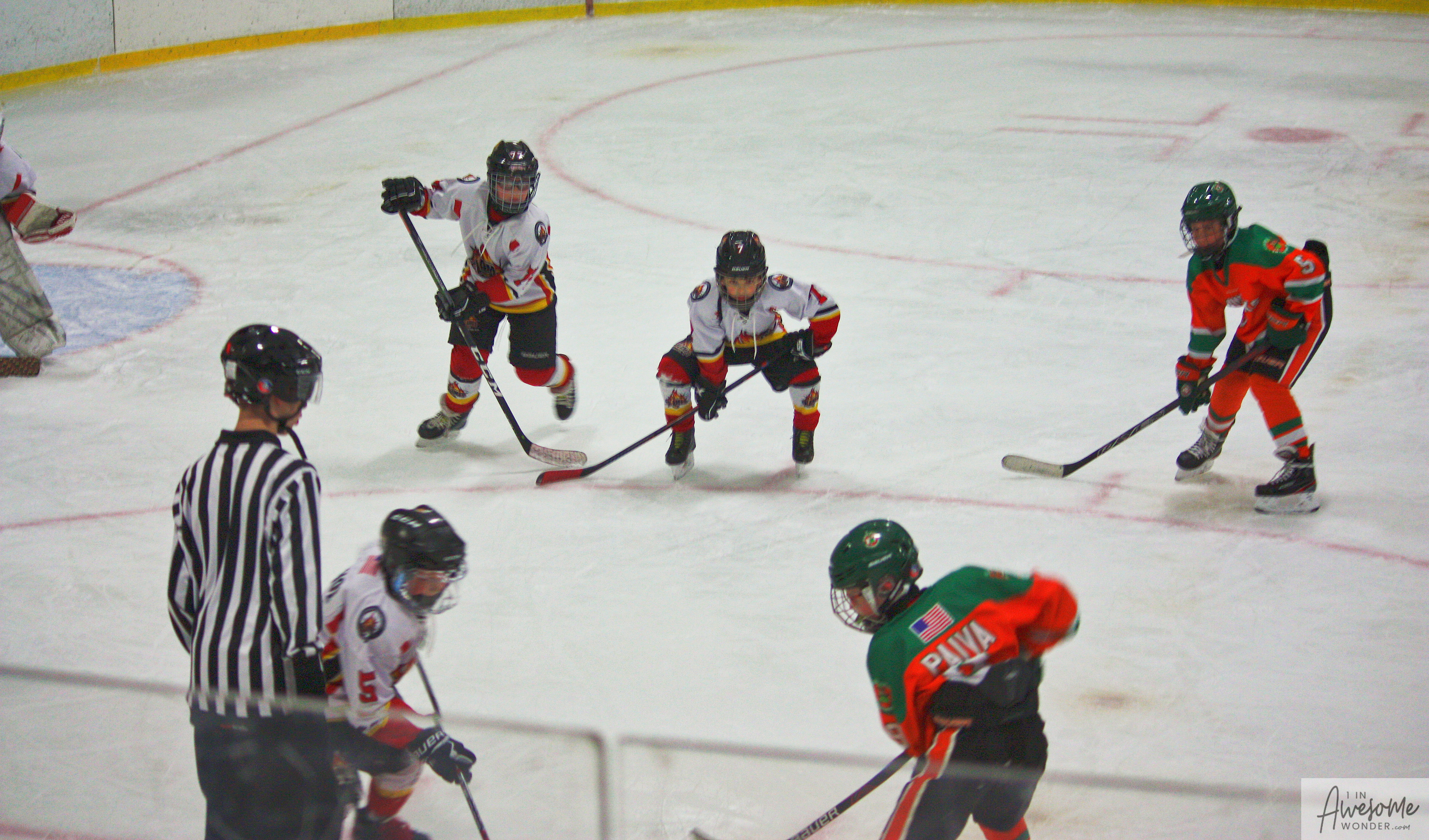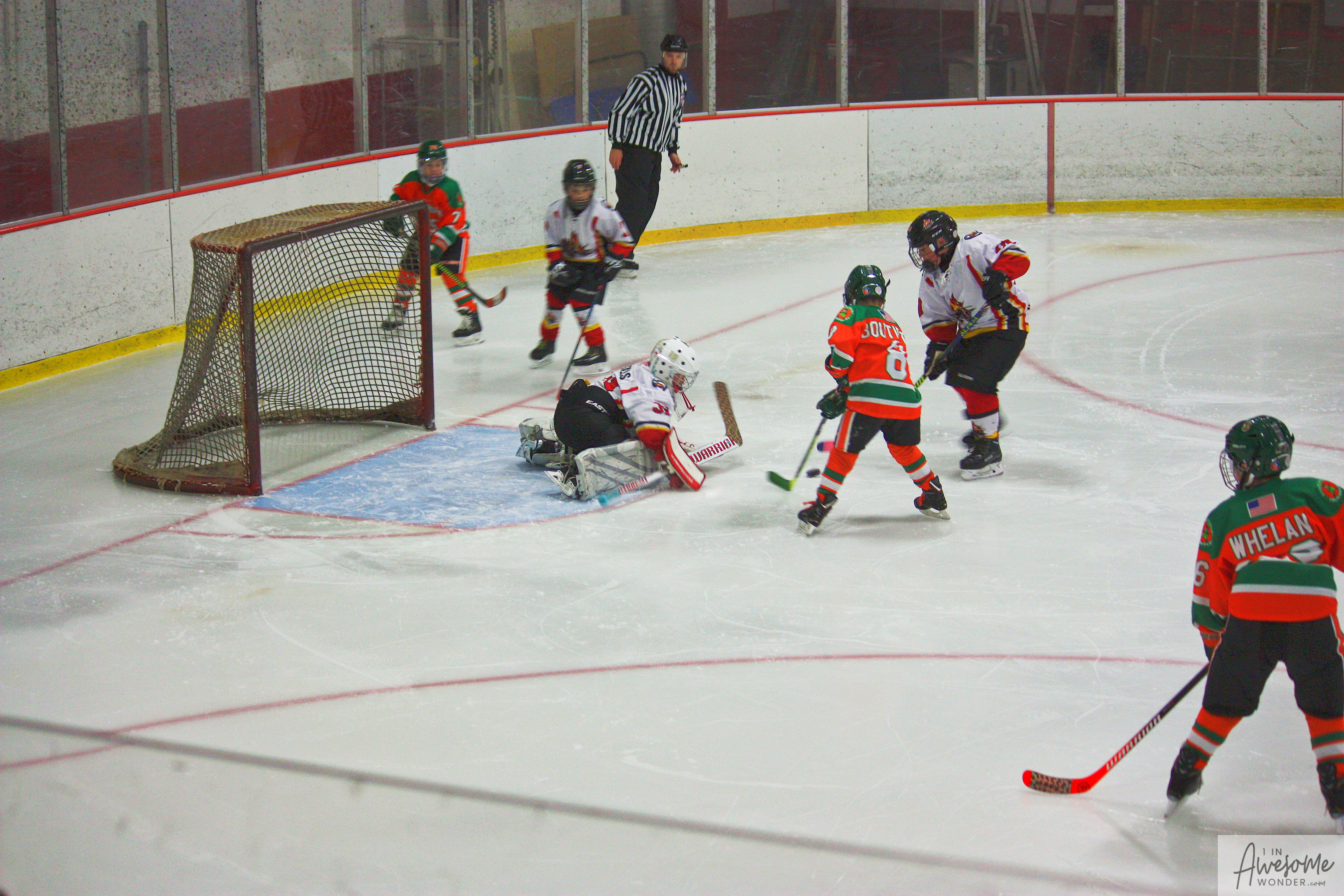 The temperature was 12 degrees Fahrenheit when we left the house at 6:30 this morning. It was frosty, cold, and early. By 7:30 am we were at Kasabuski Rink in Saugus, MA. The game started early, just before 8:30 am. The Flames fell behind 1-0, but had tied the game, 1-1 by the time the first period ended. When all was said and done, the Flames skated out of Saugus with a 7-4 victory.