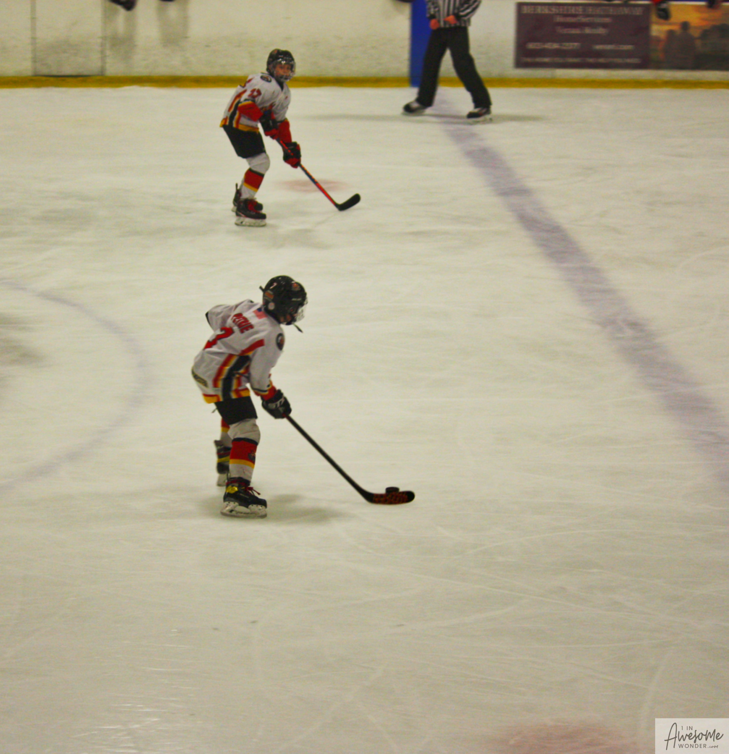The second goal came in the second period when the Flames pursued a loose puck in the right wing corner and came out of the fray with possession. This time, Powers moved the puck to Hawkes who slid a quick pass to the slot. Brayden Gillies took the pass and fired a shot on net from the slot. The shot was saved and looked like it might be tied up. What we didn’t see, that Brayden and the ref on that side of the ice saw, was that the puck was still loose. Gillies quickly reversed his direction and poked the puck past the goaltender, giving the Flames a 2-0 lead.
