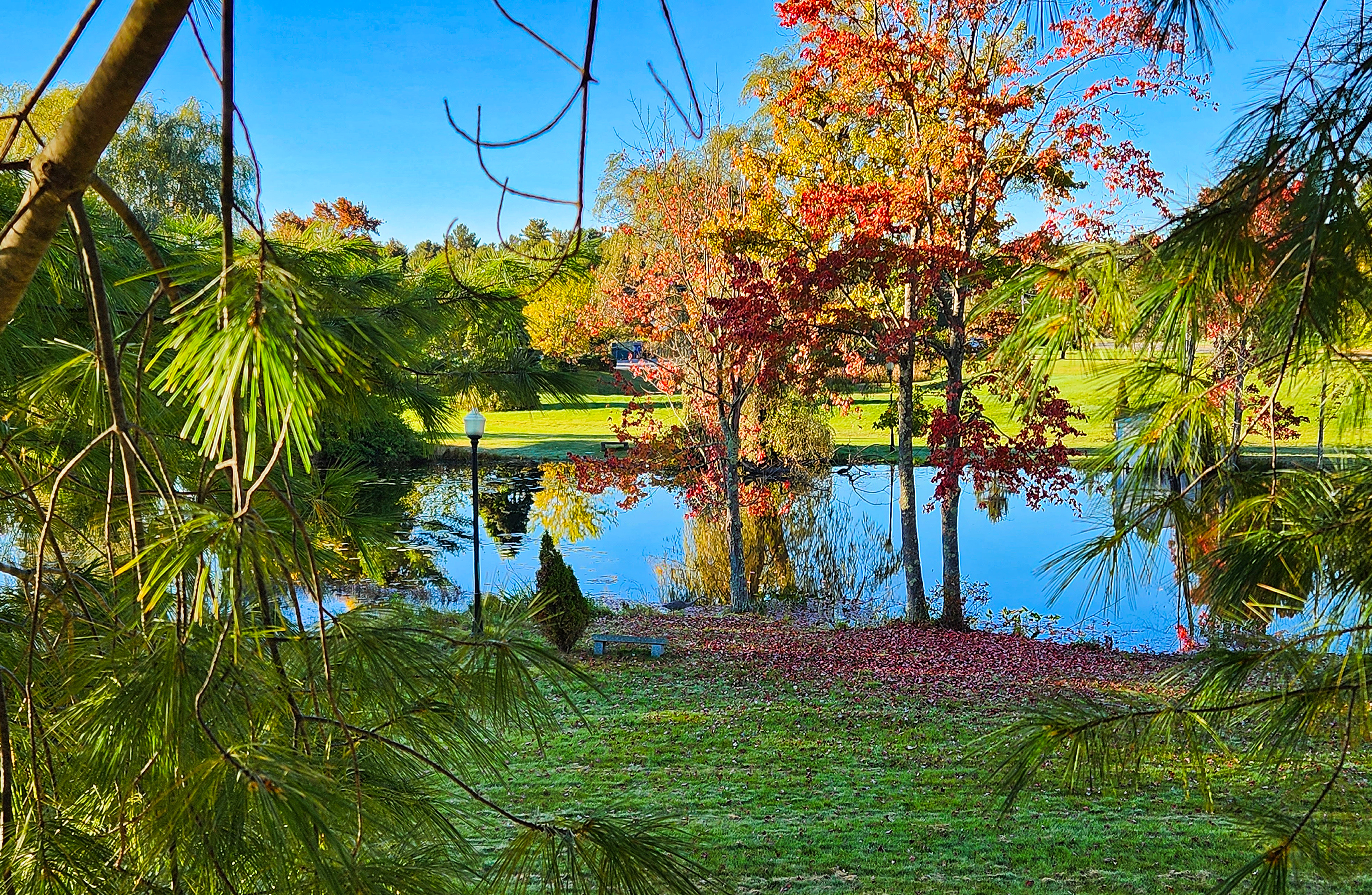 Looking past the pine toward some of the few autumn colors I saw this year. West Nashua, NH. (C) 1inawesomewonder.com 2023.
